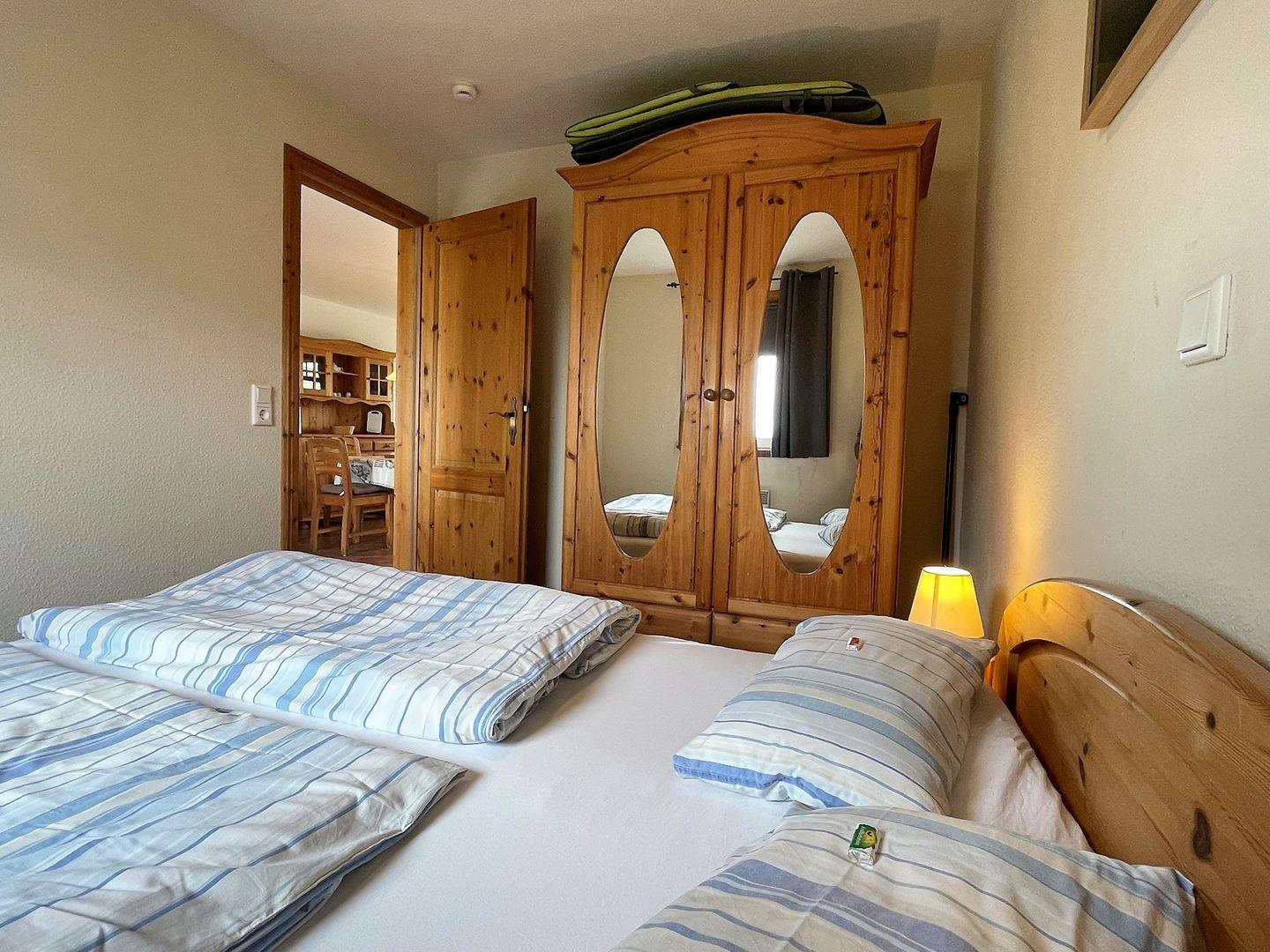 Schlafen Sie in 2 gemütlichen Schlafzimmern. Das Elternschlafzimmer verfügt über ein Doppelbett (140x200cm) und das Kinderzimmer ist mit einem Etagenbett (80x190cm) ausgestattet.