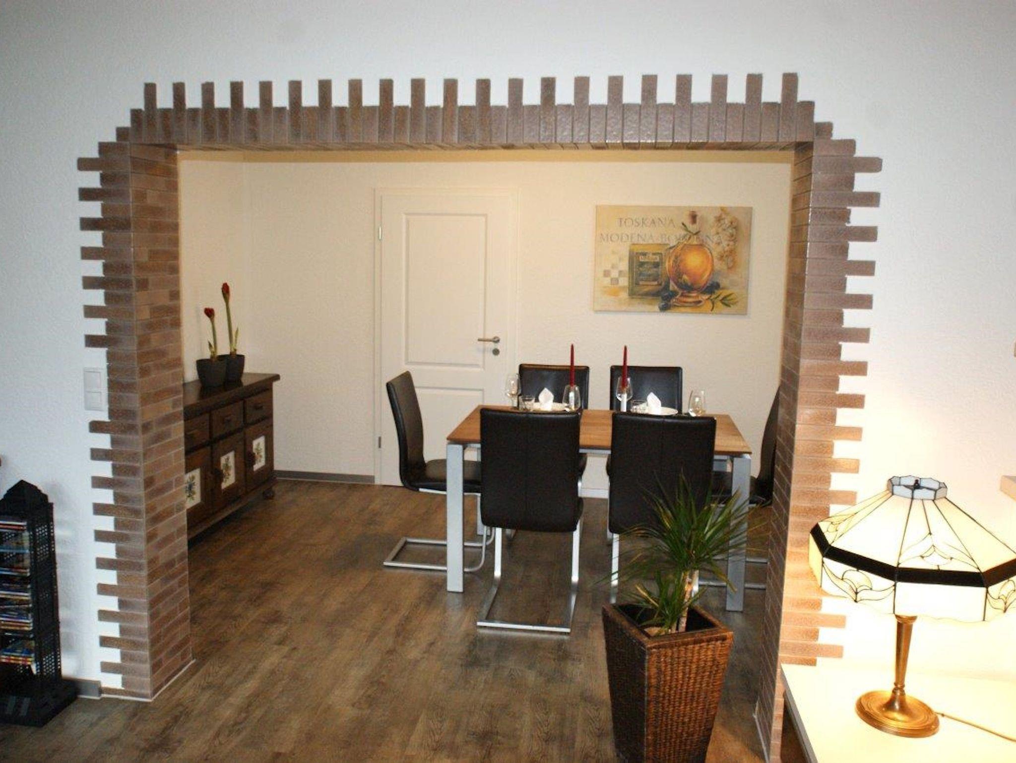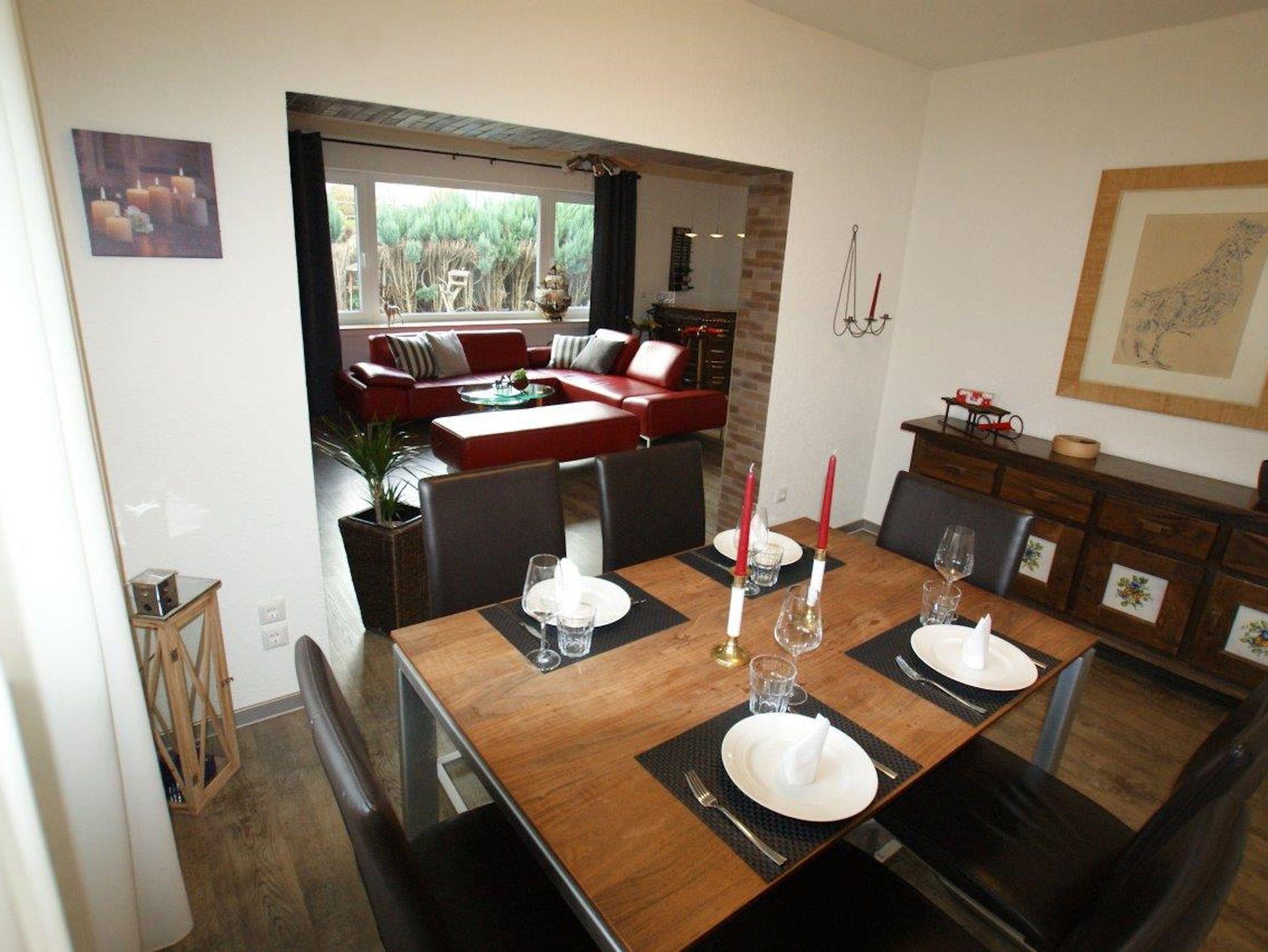 Von der Küche gelangen Sie in das Esszimmer mit Kommode, Tisch und 6 bequemen Stühlen und in das verbundene Wohnzimmer.