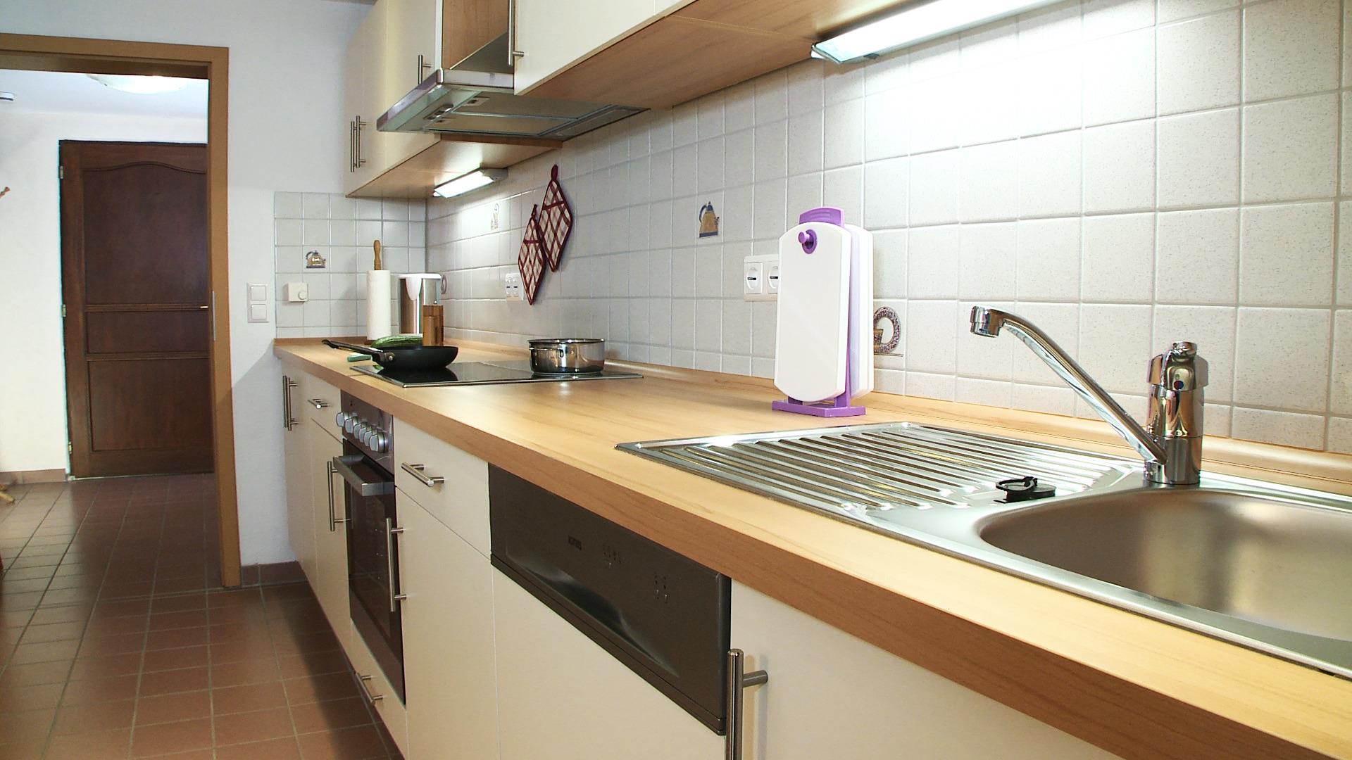 Die voll ausgestattete Küche mit Mikrowelle, Elektroherd, Geschirrspüler, Kühlschrank und Gefrierschrank lässt keine Wünsche offen.
