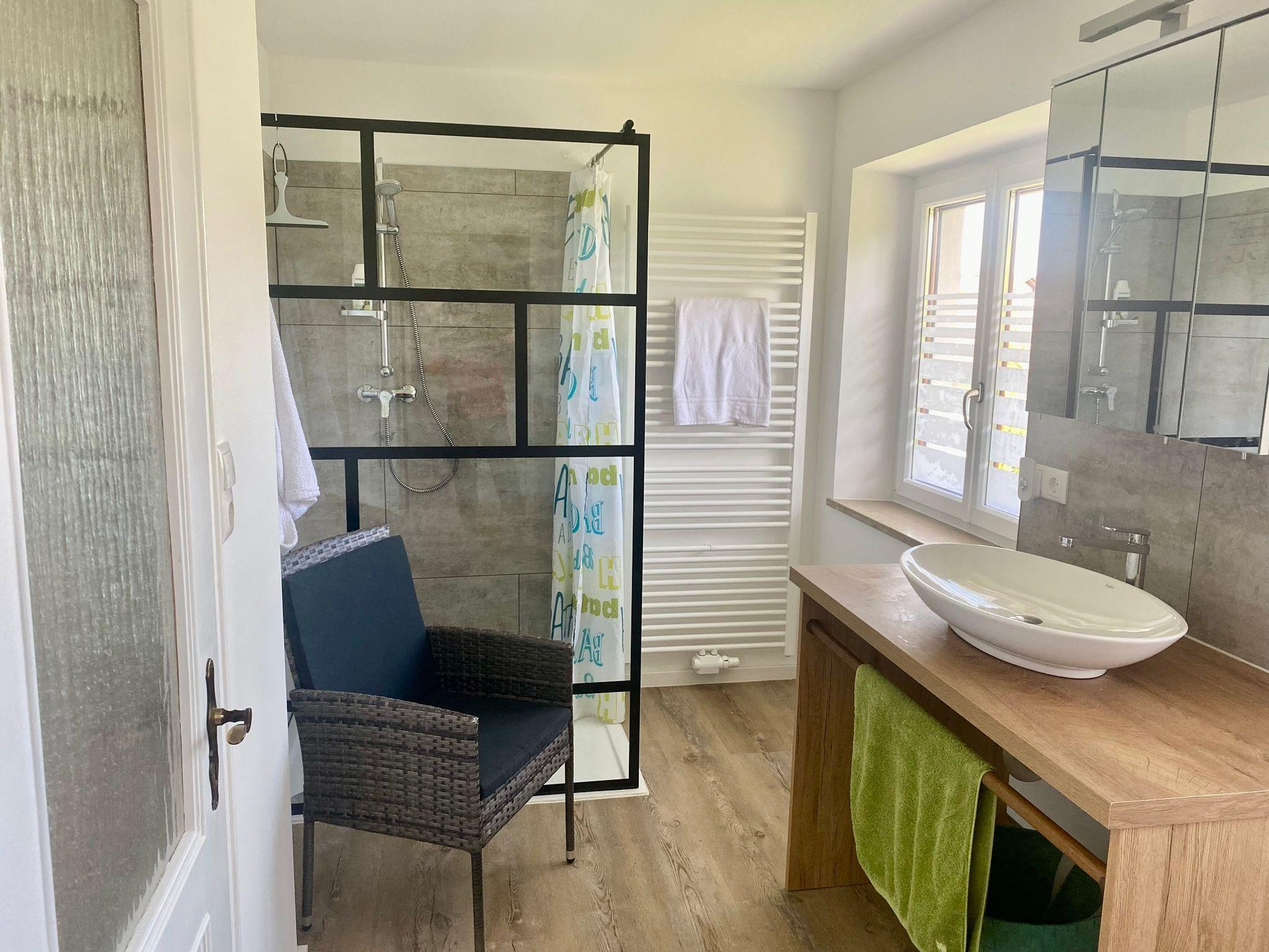 Ihr helles, großzügiges & freundliches Duschbad mit begehbarer Dusche 90x120cm, Spiegelschrank, Sitzgelegenheit, Handtuchheizkörper und Föhn ist mit Handtüchern/Badetücher ausgestattet.