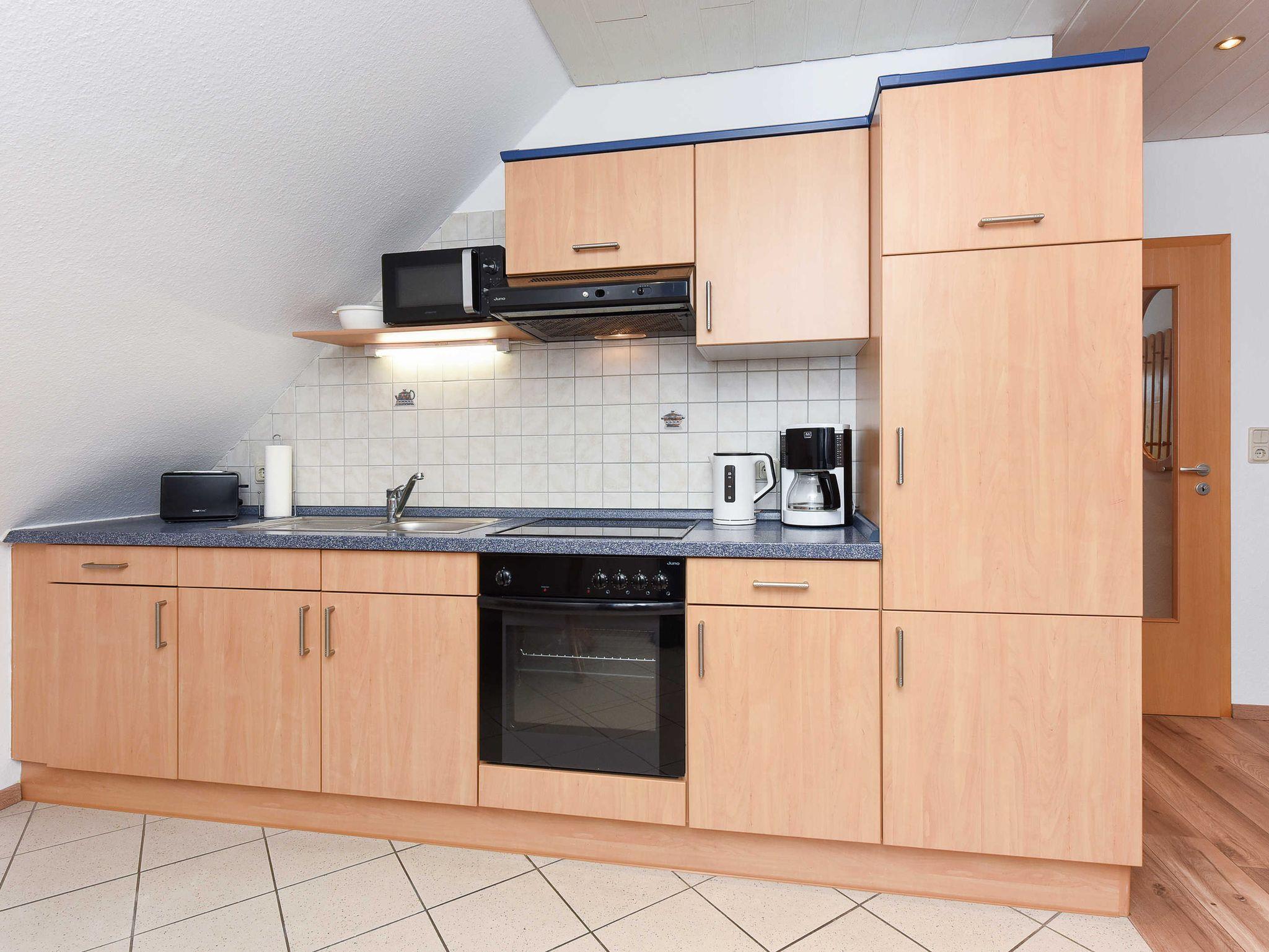 Größe ca. 60 Quadratmeter, Wohnraum mit integrierter Küche, Schlafzimmer, zweites separates, Schlafzimmer/Kinderzimmer, Badezimmer mit Dusche, Waschtisch und WC, Obergeschoss, Terrasse, Koffer-/Abstellraum, Hauswirtschaftsraum mit Waschmaschine und Wäschetrockner, optimal für 2 bis 4 Personen und zusätzlich ein Kleinkind.