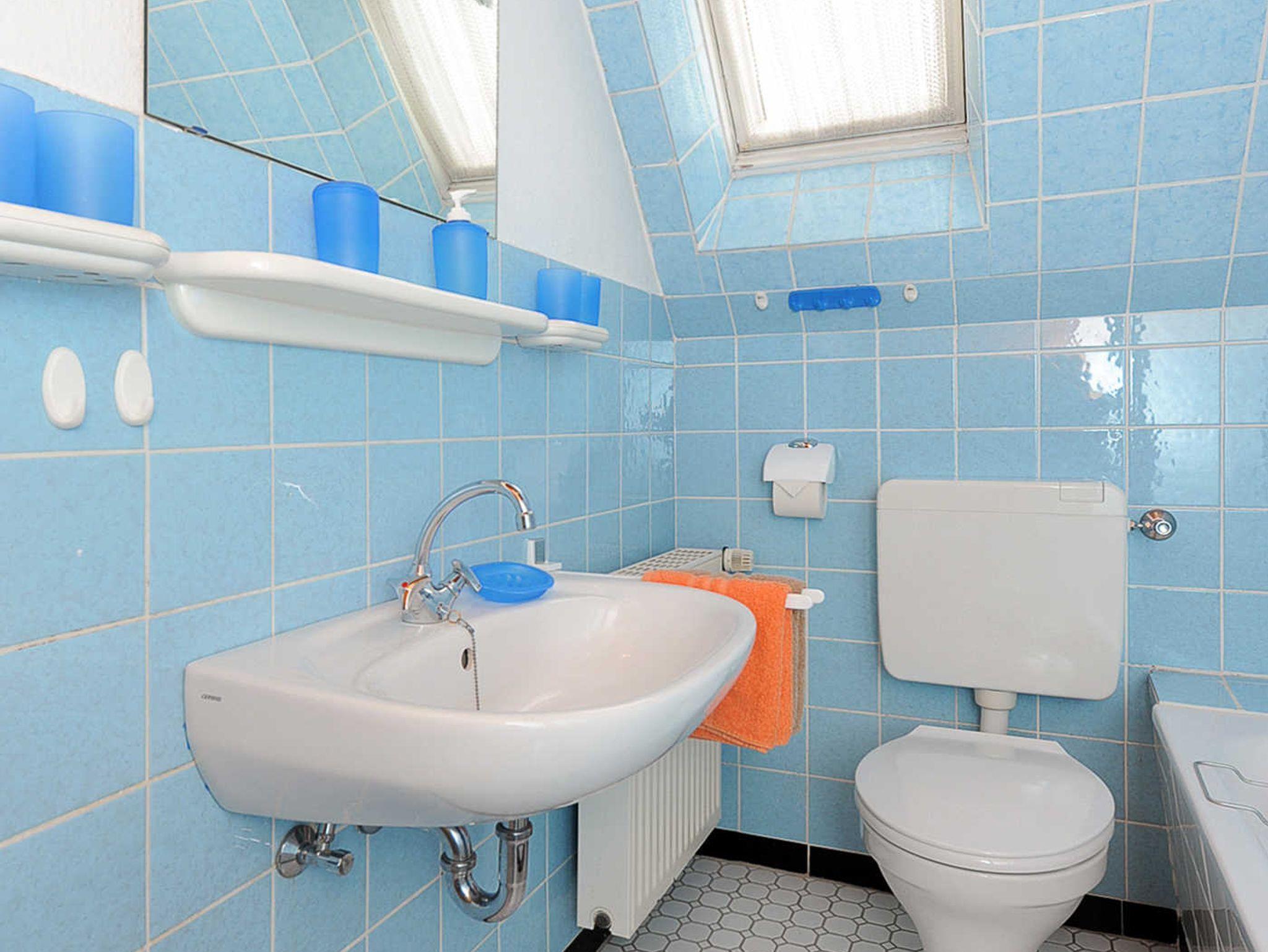 Badezimmer mit Badewanne (mit fester Duschkabine), Waschtisch und WC