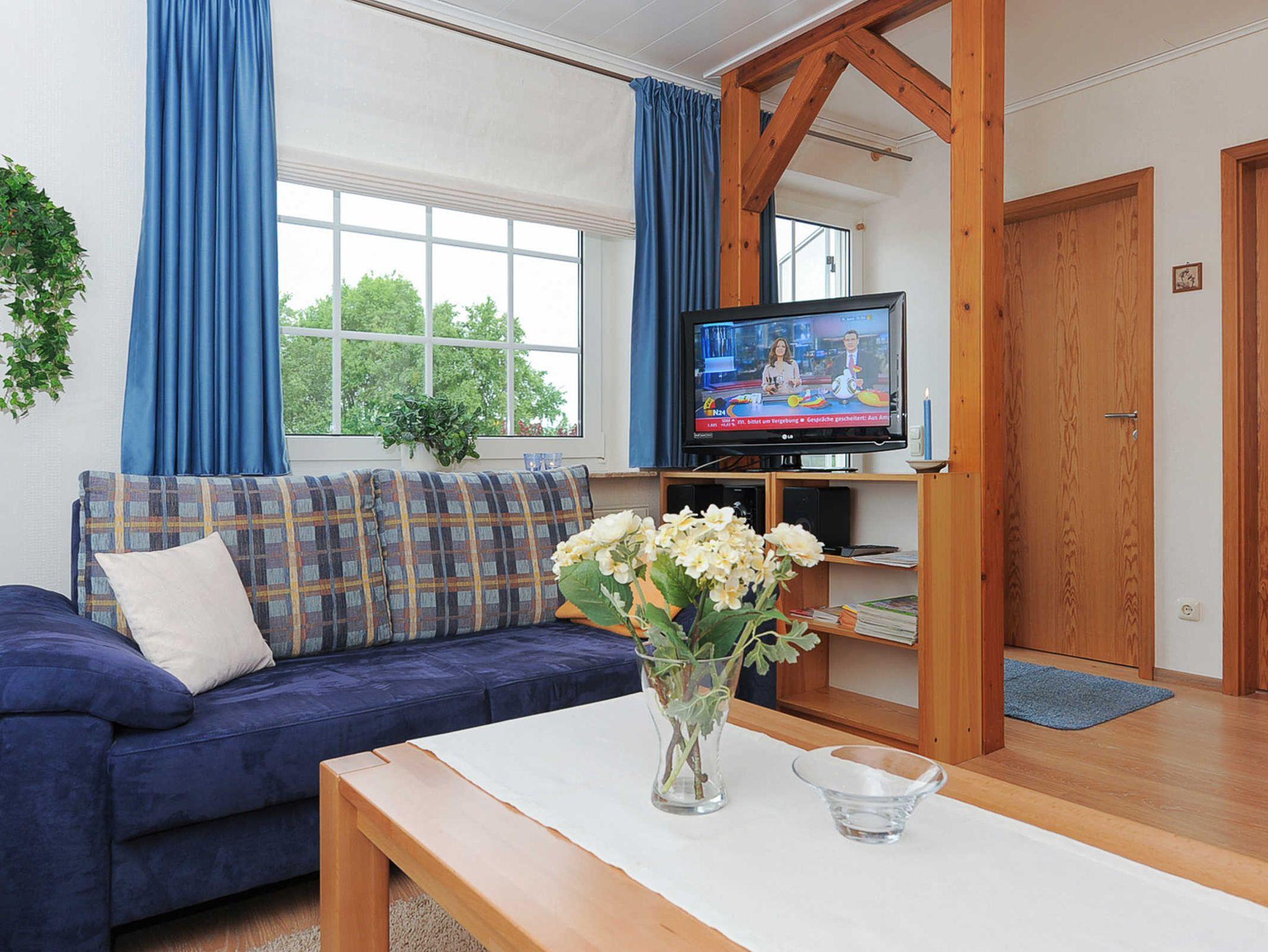 Größe ca. 45 Quadratmeter, Wohnraum mit integrierter Küche, Schlafzimmer, Badezimmer mit Dusche, Waschtisch und WC, Obergeschoss, Balkon, Internetzugang über WLAN möglich, optimal für 1 bis 2 Personen.