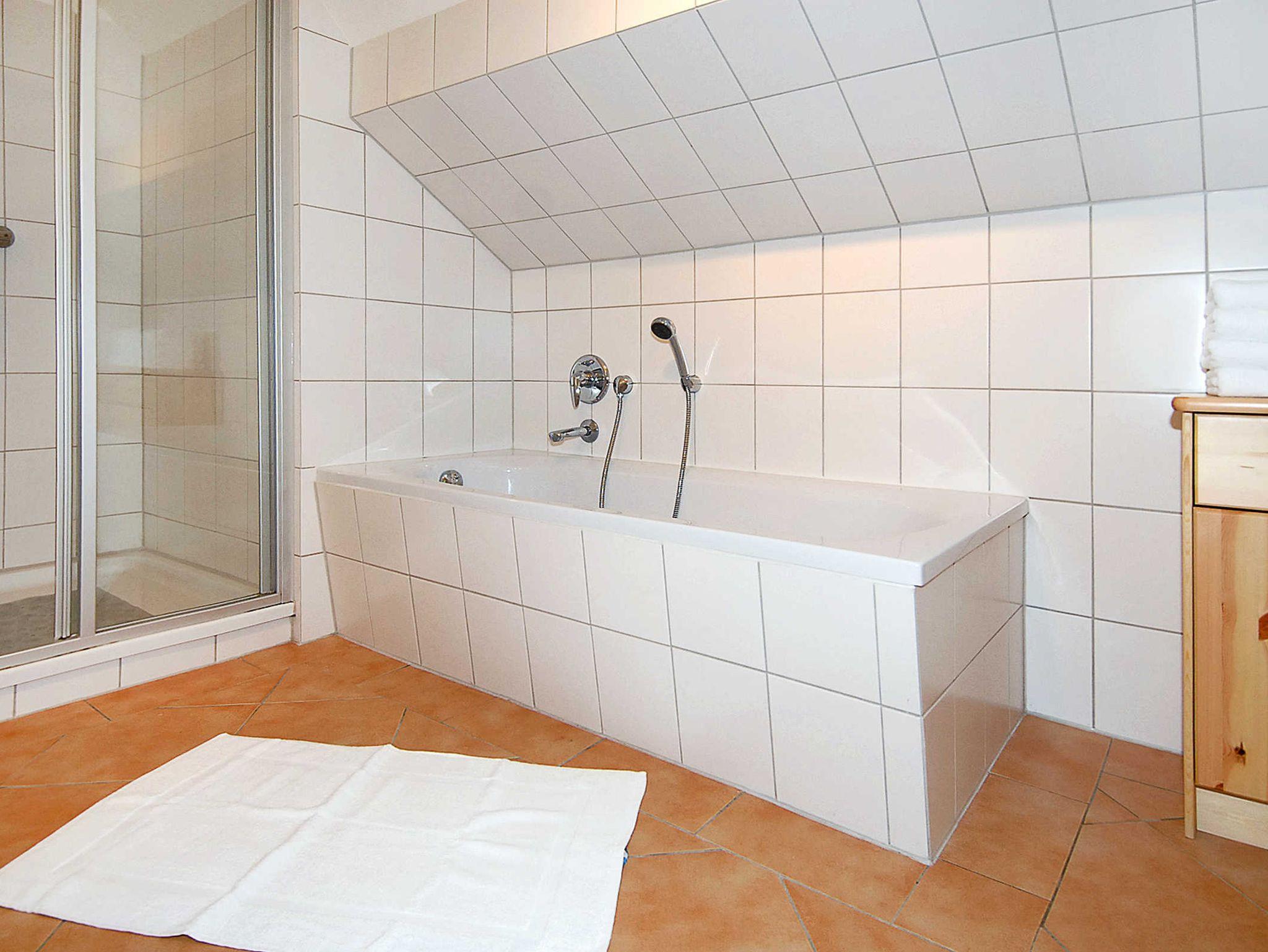 Badezimmer mit Doppel-Waschbecken, Dusche, Badewanne und WC