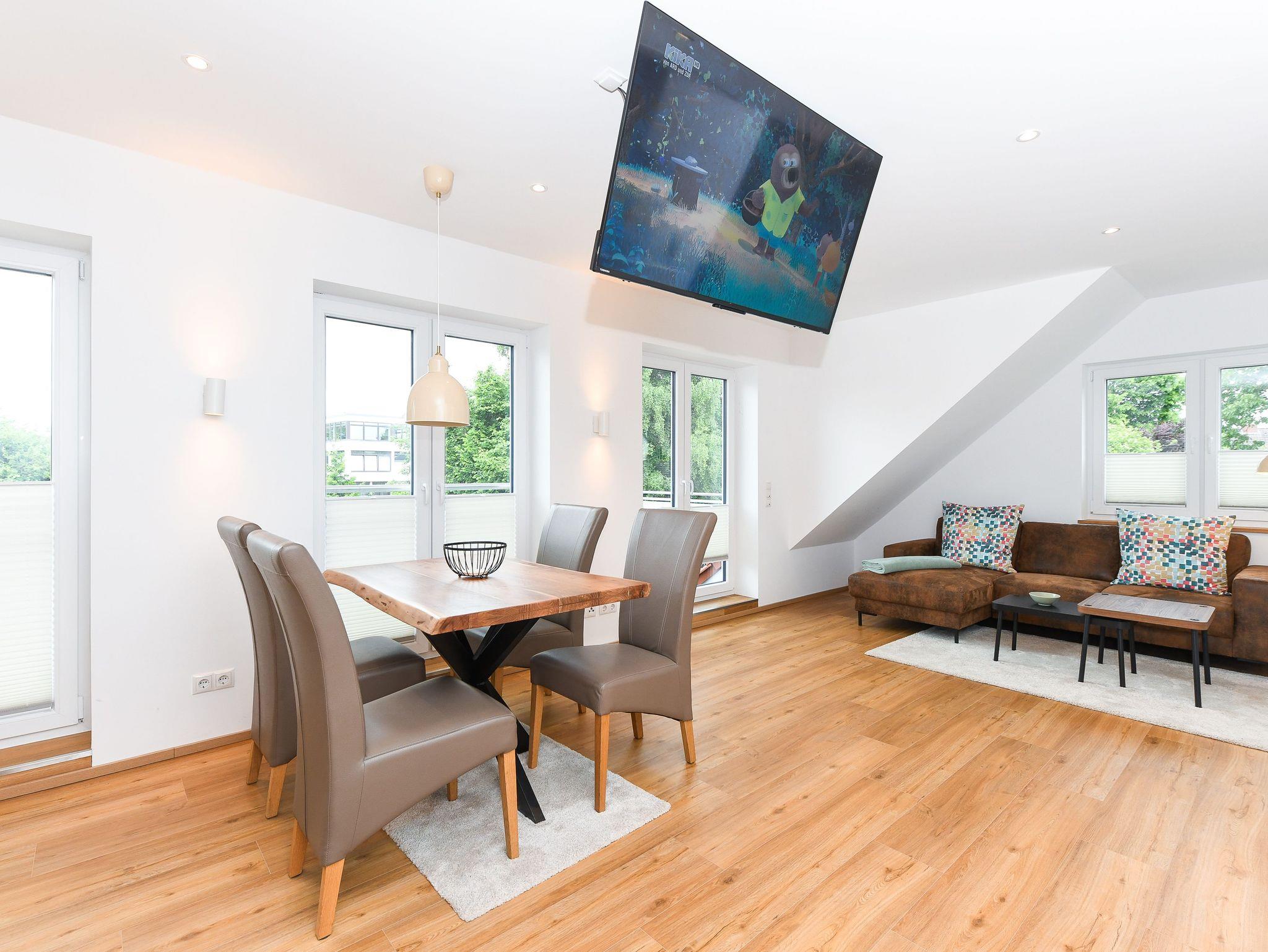 Die Ferienwohnung sind geschmackvoll, hell und freundlich eingerichtet und technisch hochwertig ausgestattet. Die Wohnung bietet eine schöne Dachterrasse mit schönem Ausblick über die Stadt.