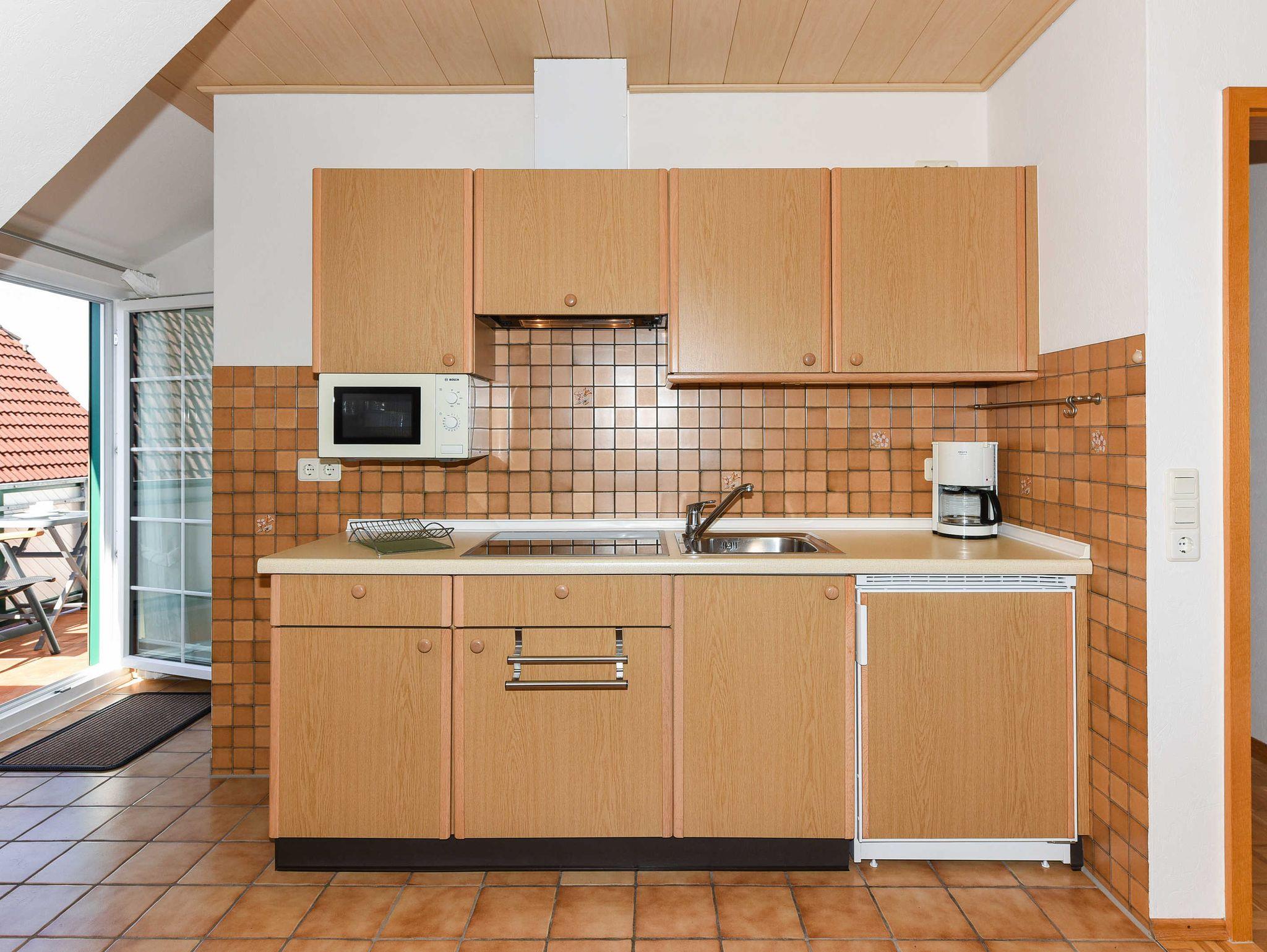 Größe ca. 50 Quadratmeter, Wohnraum mit integrierter Küche, Schlafzimmer, Badezimmer mit Dusche, Waschtisch und WC, Obergeschoss, Balkon, optimal für 1 bis 2 Personen.