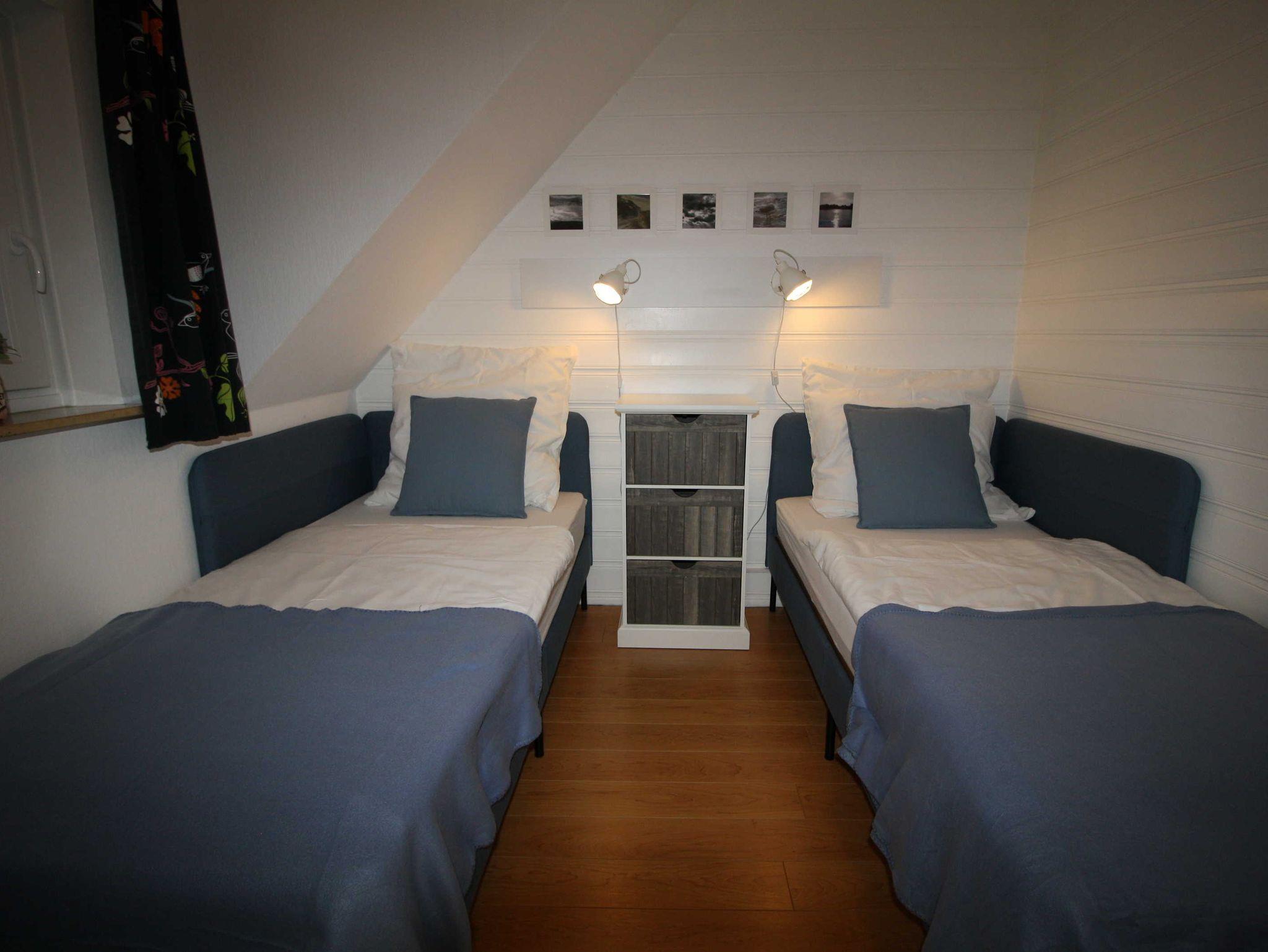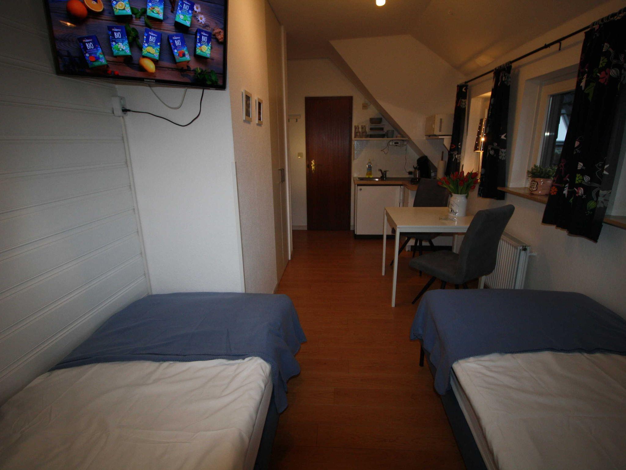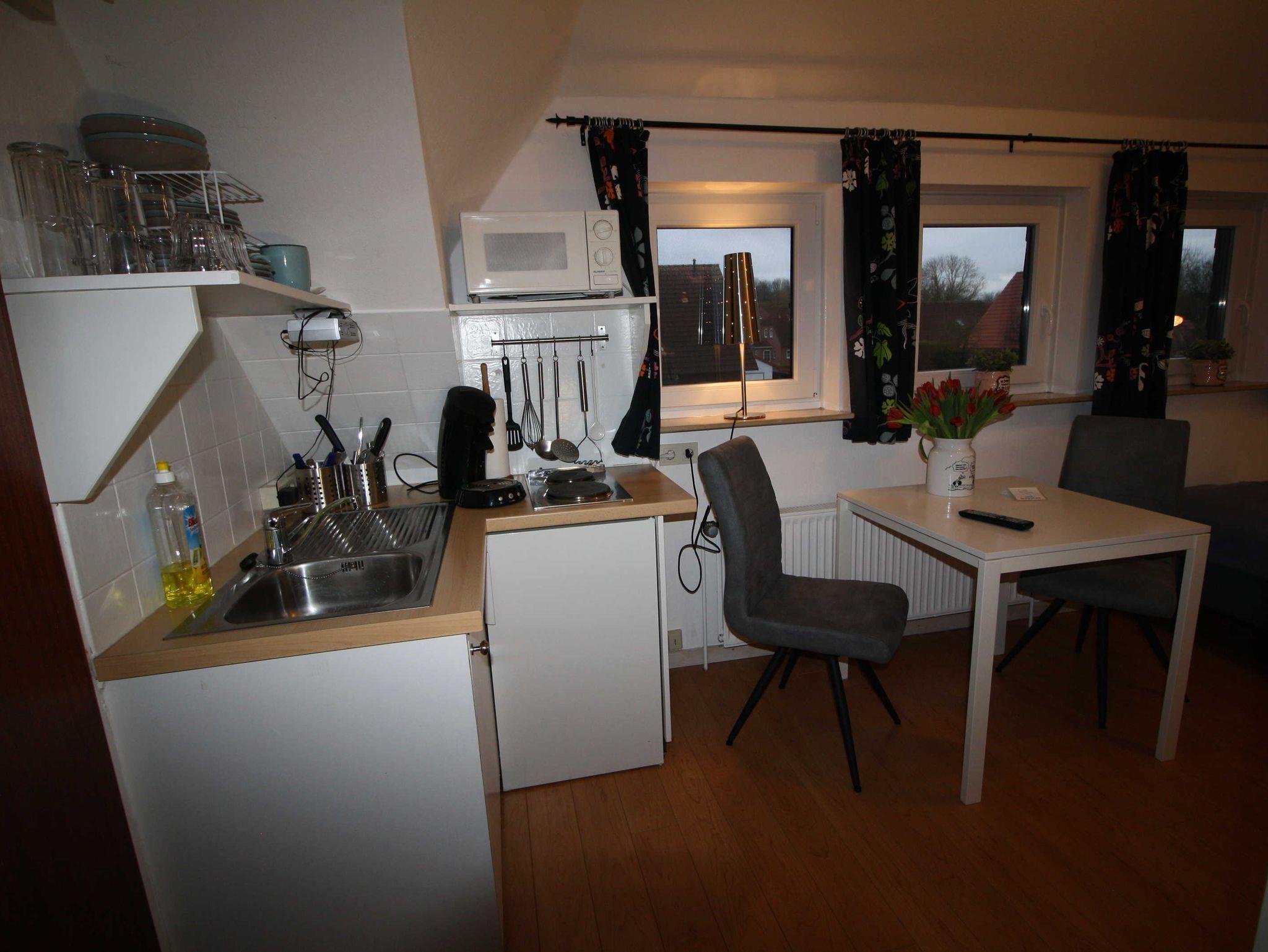 Das Appartement liegt im Obergeschoss und ist 18 qm groß. Es gibt einen Wohn-/Schlafraum mit 2 Einzelbetten, außerdem eine kleine Kochnische mit Kühlschrank, Kochfeld, Mikrowelle und Senseo-Kaffeemaschine. Zur Ausstattung gehört ein großer