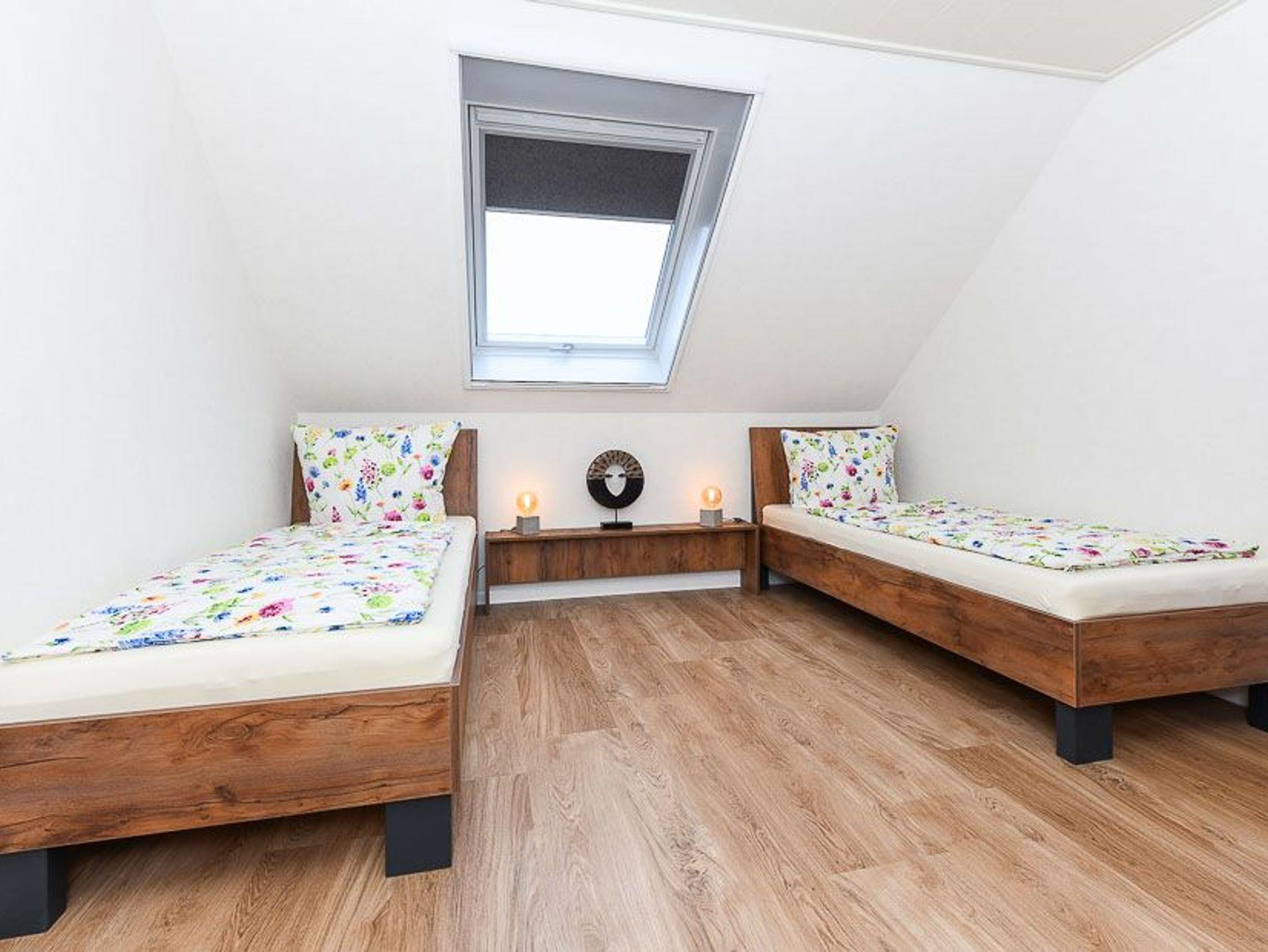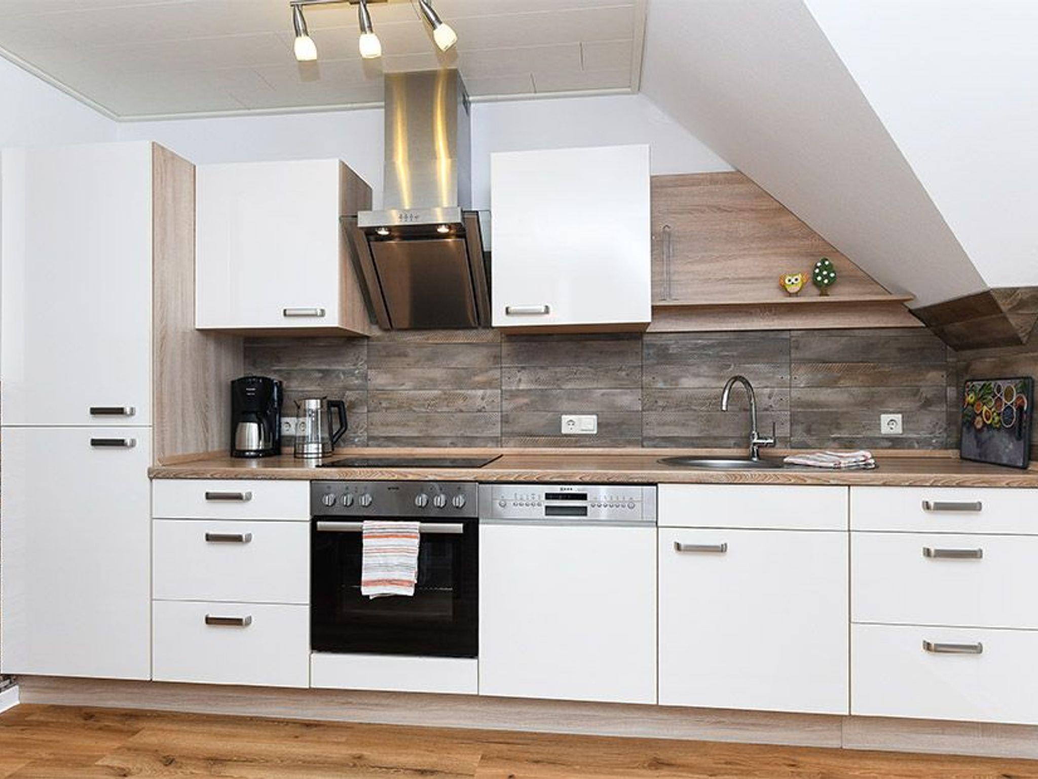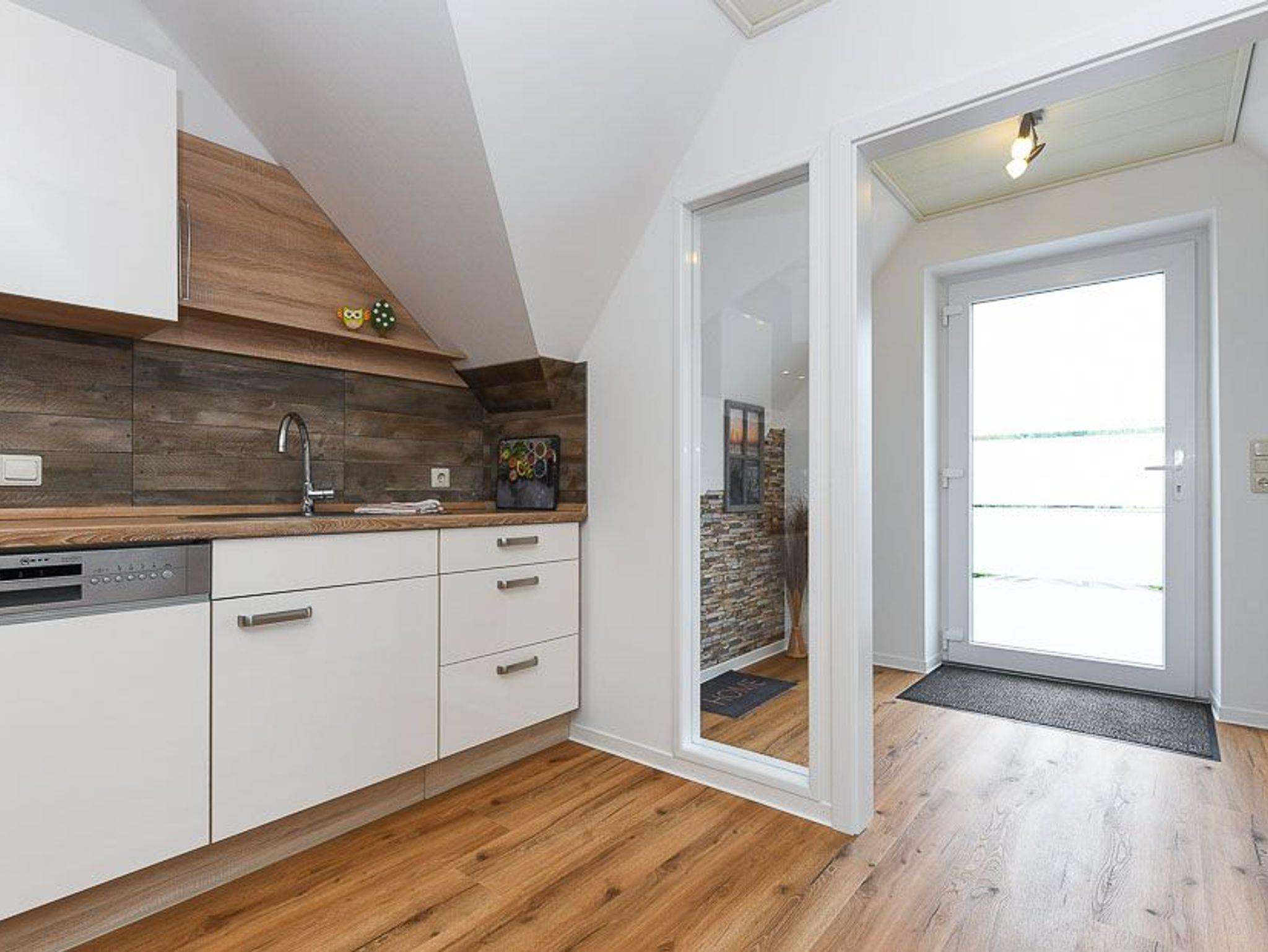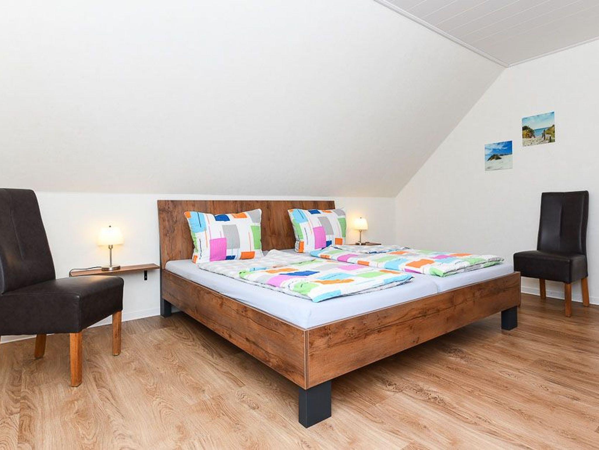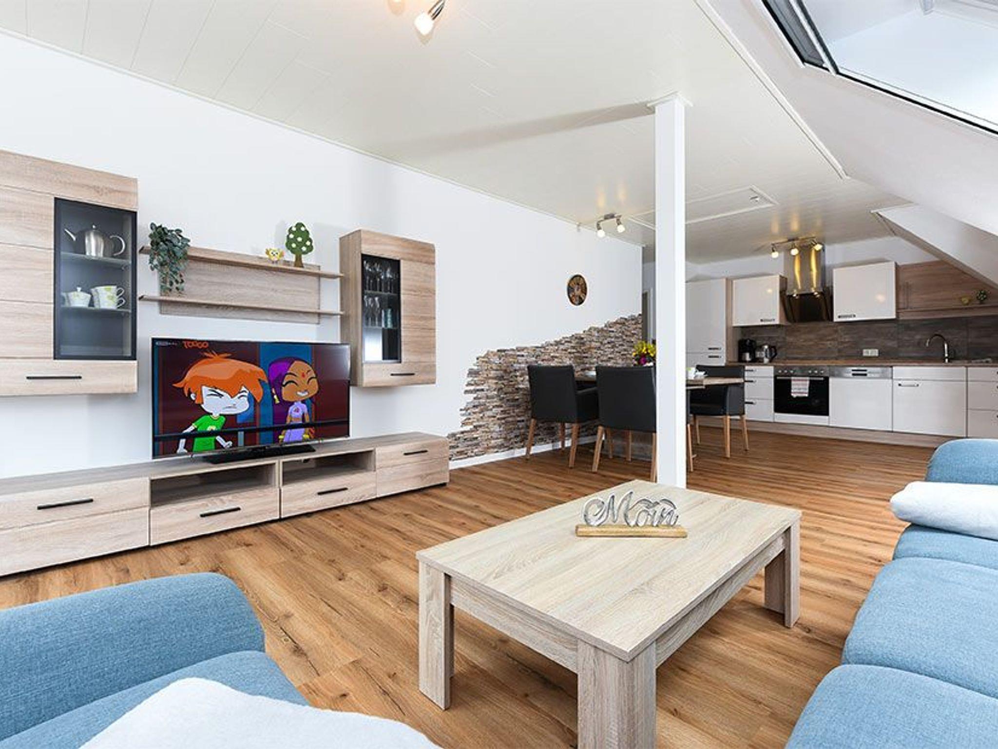 Größe ca. 65 Quadratmeter, Wohnzimmer mit integrierter Küche, Schlafzimmer, zweites separates Schlafzimmer/Kinderzimmer, Badezimmer mit Doppel-Waschbecken, Dusche und WC, Obergeschoss, optimal für 2 bis 4 Personen, seperater Fahrradschuppen zum abschließen.