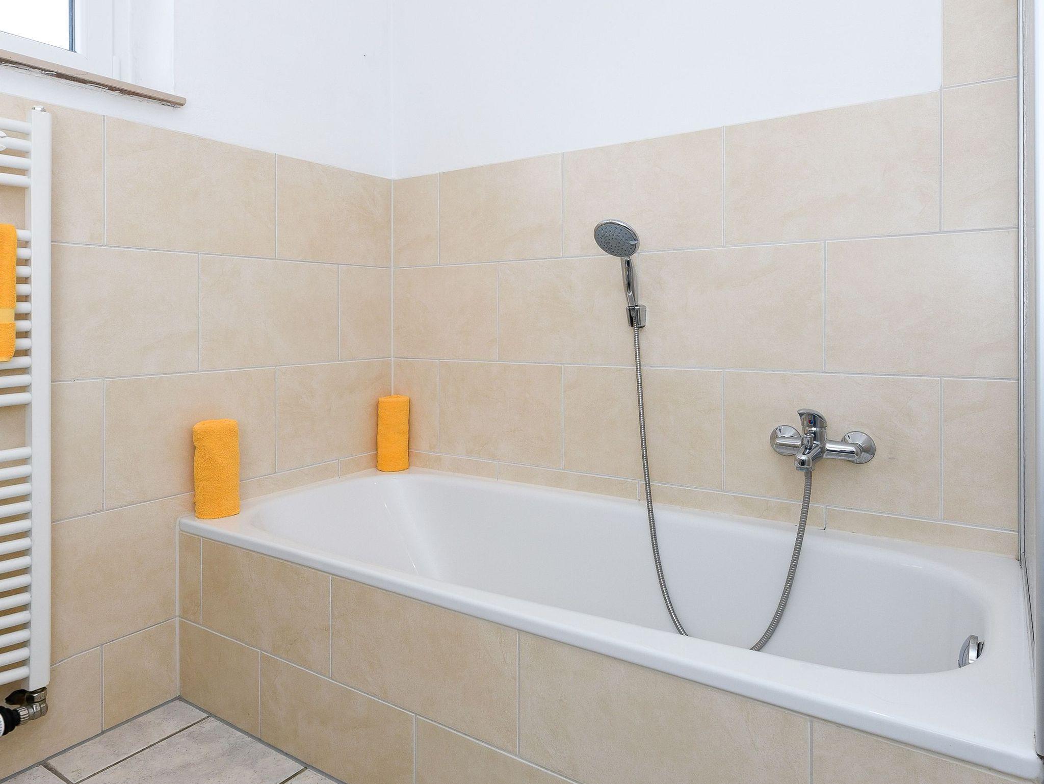 Badezimmer mit Badewanne, Dusche, Waschtisch und WC