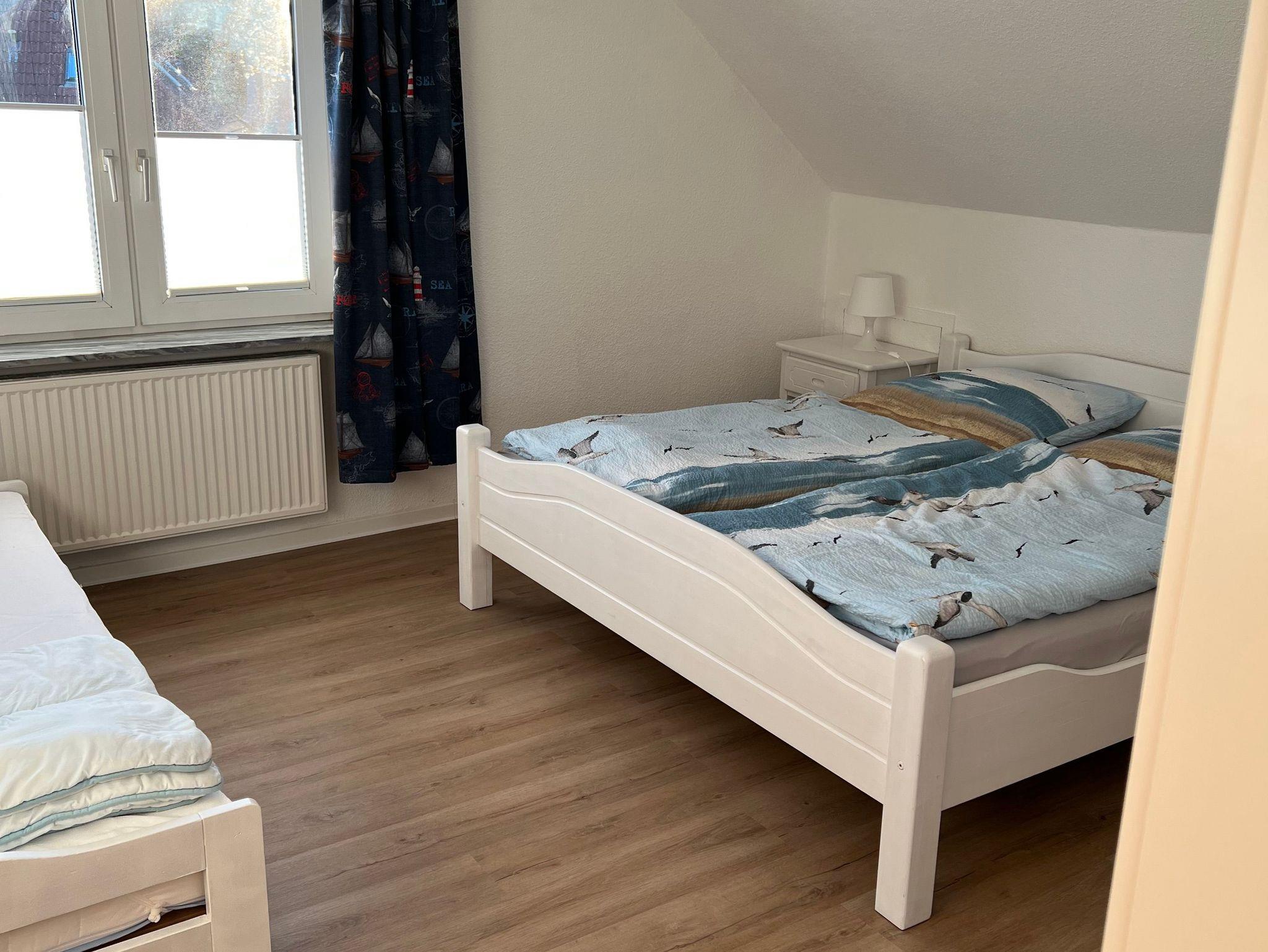 Die gemütliche Ferienwohnung im Obergeschoss umfasst großzügige 40 Quadratmeter und bietet ideale Bedingungen für einen erholsamen Aufenthalt. Das Schlafzimmer ist mit einem komfortablen Doppelbett und einem zusätzlichen Beistellbett ausgestattet. Für Familien mit Kleinkindern steht ein Gitterbett bereit, sodass ein Kind bis zu drei Jahren kostenlos mitreisen kann. Um das Gitterbett rechtzeitig herzurichten, bitten wir um vorherige Benachrichtigung.