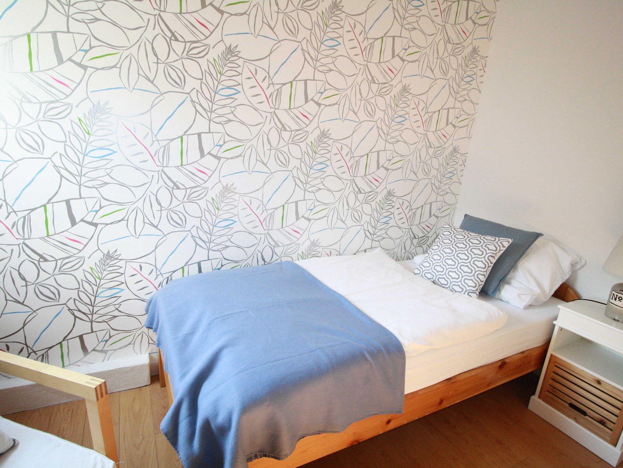 Es gibt einen großen Wohn/Schlafraum, eine kleine Küche, ein Einzelzimmer und ein Tageslichtbad.