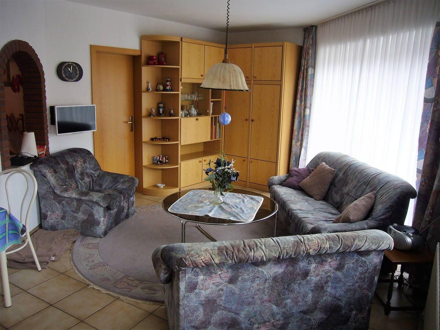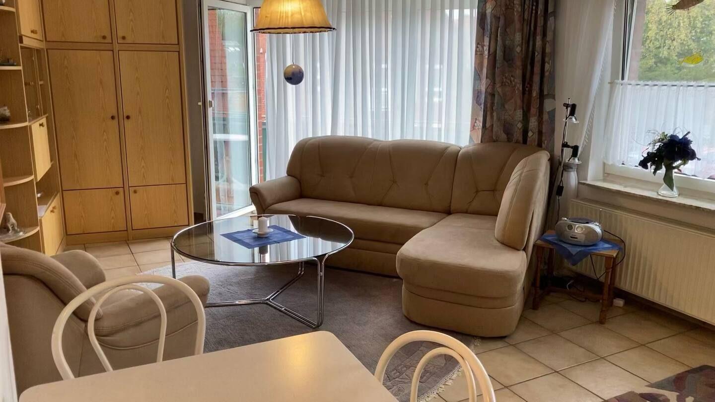 Die Ferienwohnung „Esenser Bär“ heißt Sie mit einer warmen, gemütlichen Atmosphäre willkommen. Im behaglichen Wohnzimmer lädt ein praktisches Schrankbett zum Entspannen ein, während im separaten Schlafzimmer ein komfortables französisches Doppelbett für erholsame Nächte sorgt – ideal für zwei Personen.