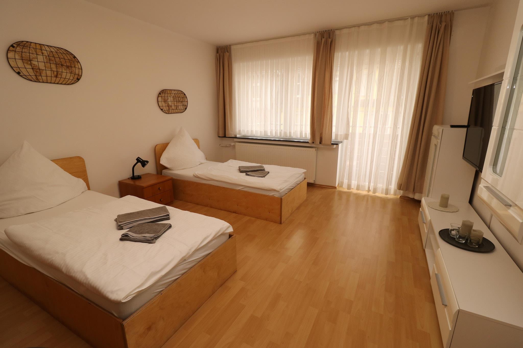 Denne smukt indrettede ferielejlighed i Essens Frohnhausen-distrikt tilbyder et hyggeligt og stilfuldt tilflugtssted for op til 3 gæster, ideel til par, venner eller små familier. Lejligheden ligger på 3. sal og har en privat terrasse, en balkon med naturskøn udsigt og et loungesæt - perfekt til at nyde måltider eller drinks udendørs. Indvendigt har stuen tv, spisebord og klapseng, mens soveværelset byder på en komfortabel dobbeltseng. Det moderne køkken er fuldt udstyret med kogeplader, kaffemaskine, ovn, opvaskemaskine og køleskab, hvilket gør det nemt at tilberede hjemmelavede måltider. Gæsterne kan nyde godt af gratis WiFi, betalingsadgang til vaskemaskine og parkering på stedet. Essentials er kun 200 m væk, med restauranter, butikker og byens centrum (3 km) inden for rækkevidde. Messe Essen ligger kun 5 km væk, og nærliggende attraktioner omfatter Signal Iduna Park, VELTINS-Arena og ZOOM Erlebniswelt.