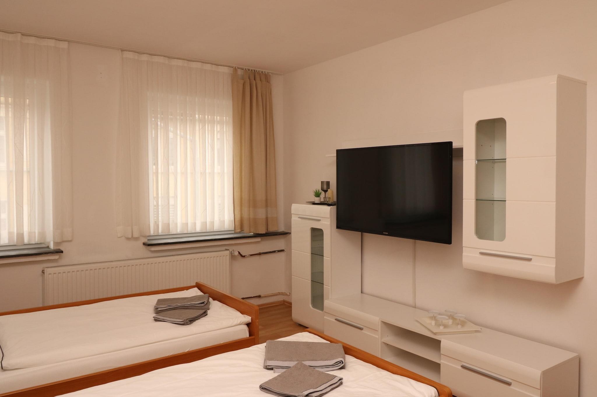 Denne stilfulde ferielejlighed i Essens Frohnhausen-distrikt tilbyder et hyggeligt og veludstyret ophold for op til 4 gæster, ideel til messegæster eller byens opdagelsesrejsende. Lejligheden ligger på 3. sal og har en privat terrasse, en balkon med udsigt over byen og et loungesæt - perfekt til at nyde måltider eller drinks udendørs. Indvendigt har stuen tv, spisebord og klapseng, mens soveværelset byder på en komfortabel dobbeltseng. Det moderne køkken er fuldt udstyret med kogeplader, kaffemaskine, ovn, opvaskemaskine og køleskab, hvilket gør det nemt at tilberede hjemmelavede måltider. Essentials er kun 200 m væk, med restauranter og byens centrum inden for gåafstand. Messe Essen ligger kun 5 km væk, og nærliggende attraktioner omfatter Signal Iduna Park, VELTINS-Arena og ZOOM Erlebniswelt.