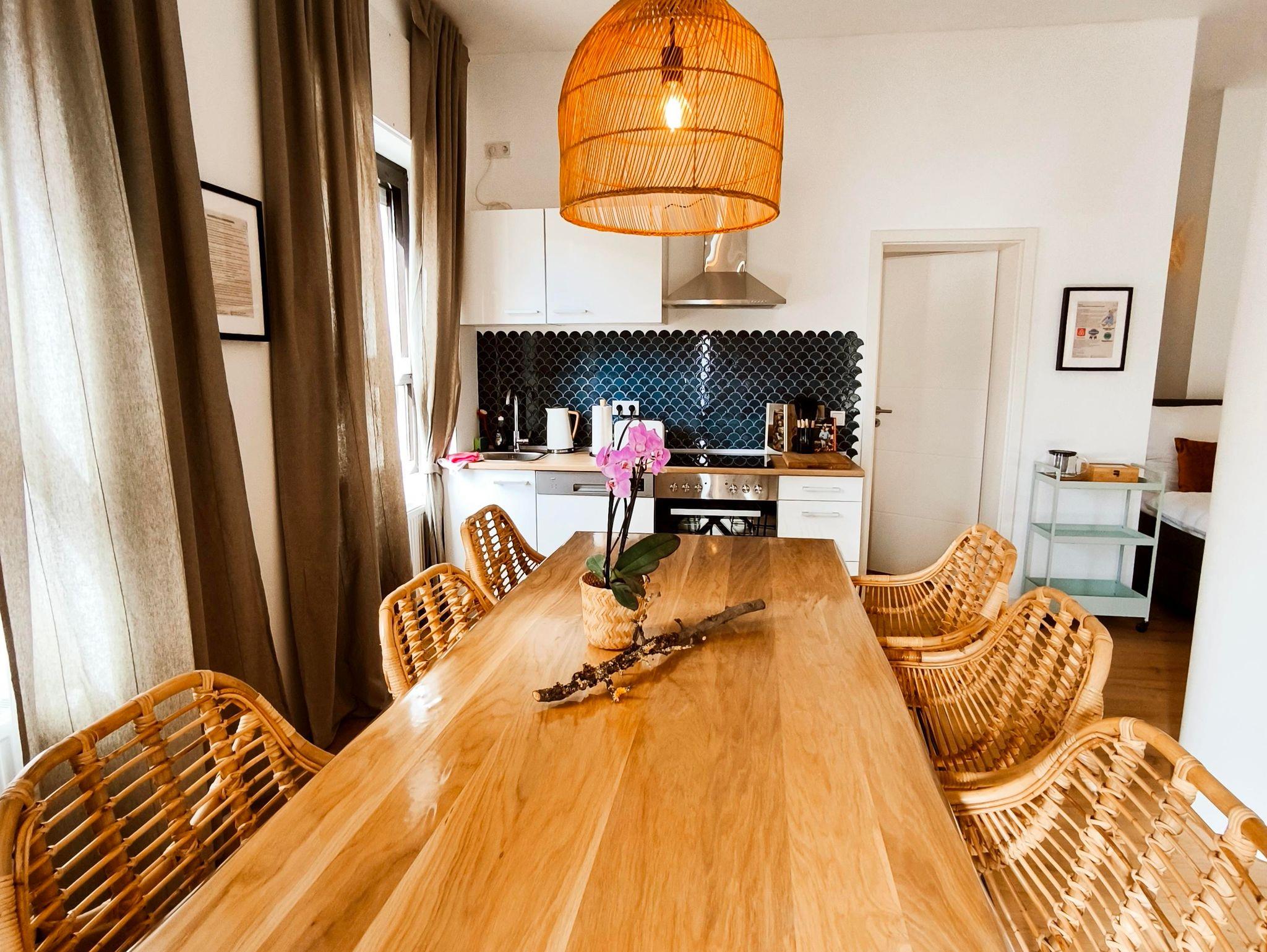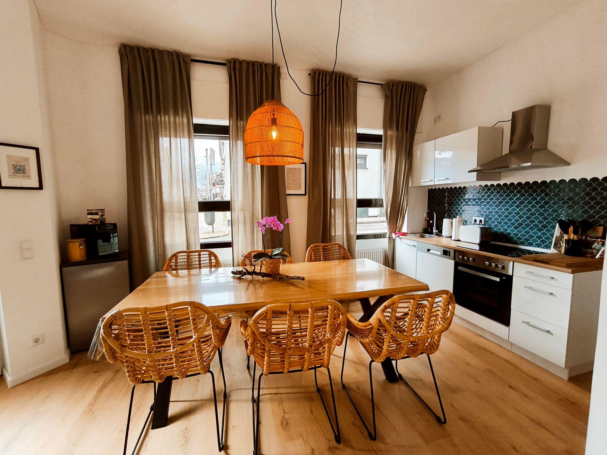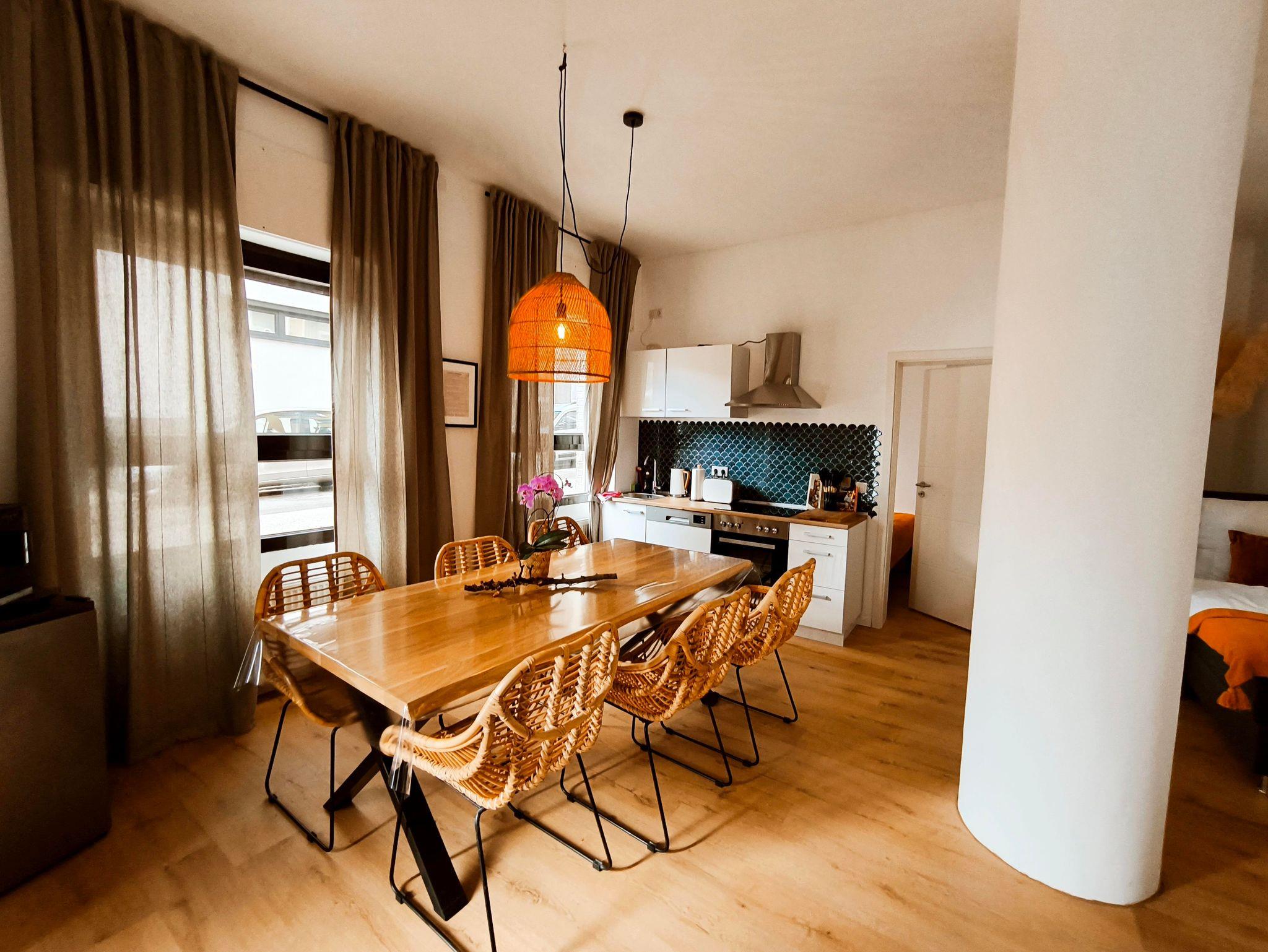 Unsere großzügige Ferienwohnung bietet Ihnen alles, was Sie für einen unvergesslichen Aufenthalt benötigen. Sie verfügt über zwei elegante Schlafzimmer, ein gemütliches Wohnzimmer sowie eine voll ausgestattete Küche mit modernsten Geräten, darunter ein Kühlschrank und eine Kaffeemaschine, damit Sie sich wie zu Hause fühlen können. Das stilvolle Badezimmer mit Dusche und kostenlosen Pflegeprodukten lädt zum Entspannen ein. Natürlich stellen wir Ihnen Handtücher und Bettwäsche zur Verfügung, damit Sie sich ganz auf Ihr Wohlbefinden konzentrieren können. Besonders hervorzuheben ist unsere RüWellnessSuite, die sich durch ihre großzügige Gestaltung mit 1,5 Schlaf- und Wohnzimmern auszeichnet. Ein weiteres Highlight ist die private Indoor-Sauna, die Ihnen pure Erholung und Wohlbefinden bietet. Die Suite beeindruckt mit ihrer weiten Raumhöhe, die für eine offene und luftige Atmosphäre sorgt – ideal zum Entspannen und Genießen. Die RüWellnessSuite befindet sich in einer hervorragenden Lage, nur einen Katzensprung entfernt von den beliebten Sehenswürdigkeiten wie dem RÜ, dem Museum Folkwang, der Messe Essen, dem Aalto-Theater und dem Hauptbahnhof Essen (Hbf). Sie können die Stadt bequem zu Fuß erkunden und all die kulturellen Highlights genießen, die Essen zu bieten hat. Lassen Sie sich von der einzigartigen Kombination aus Komfort und Wellness in der RüWellnessSuite verzaubern – wir freuen uns darauf, Sie bei uns begrüßen zu dürfen!