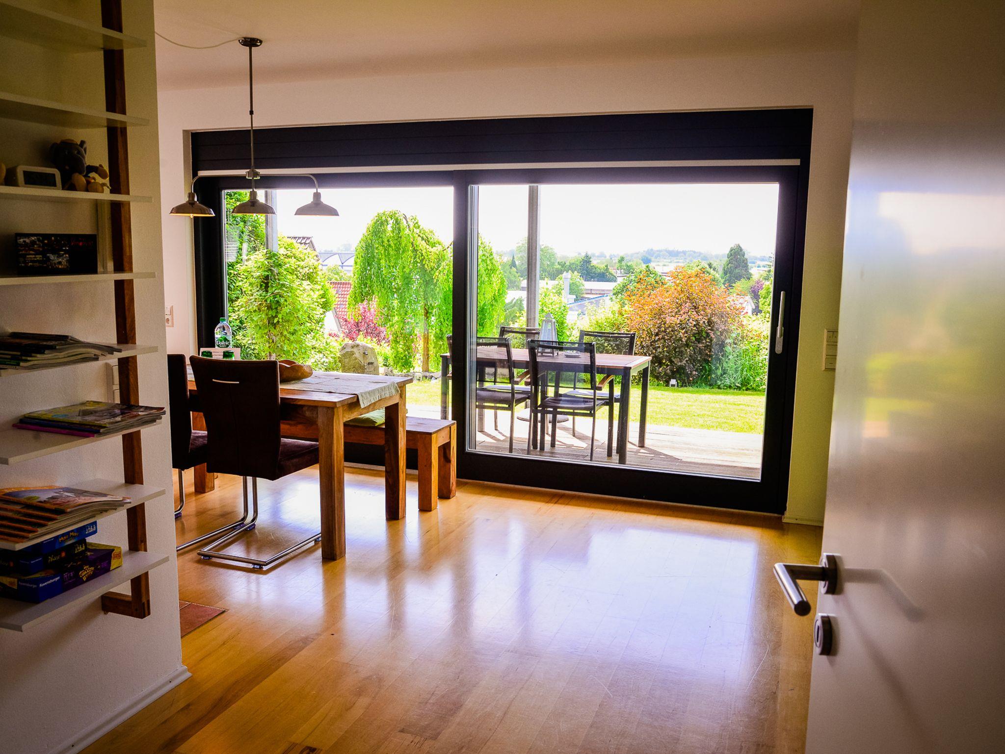 Moderner Wohn-/Essbereich mit großer Terrasse inklusive Gartennutzung, Schlafsofa (1,60m Liegefläche) für den 3. und 4. Gast, LED-TV sowie romantischer Schwedenofen für die kalten Tage (gegen Gebühr).