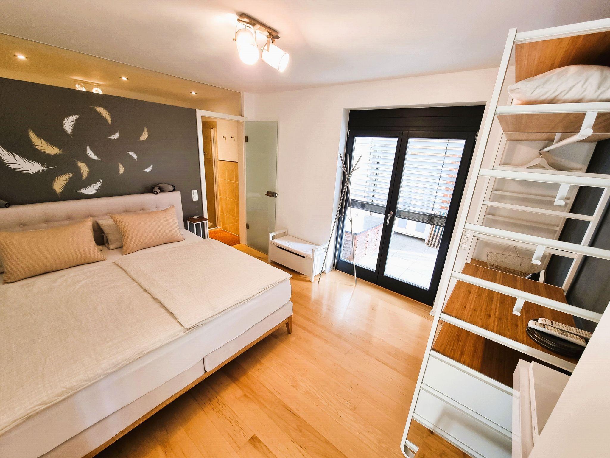 Moderne und lichtdurchflutete 2-Zimmer-Wohnung (56 qm für 1-4 Personen) in Hanglage mit Traumblick auf die Europa-Park Skyline und die benachbarten Vogesen.
