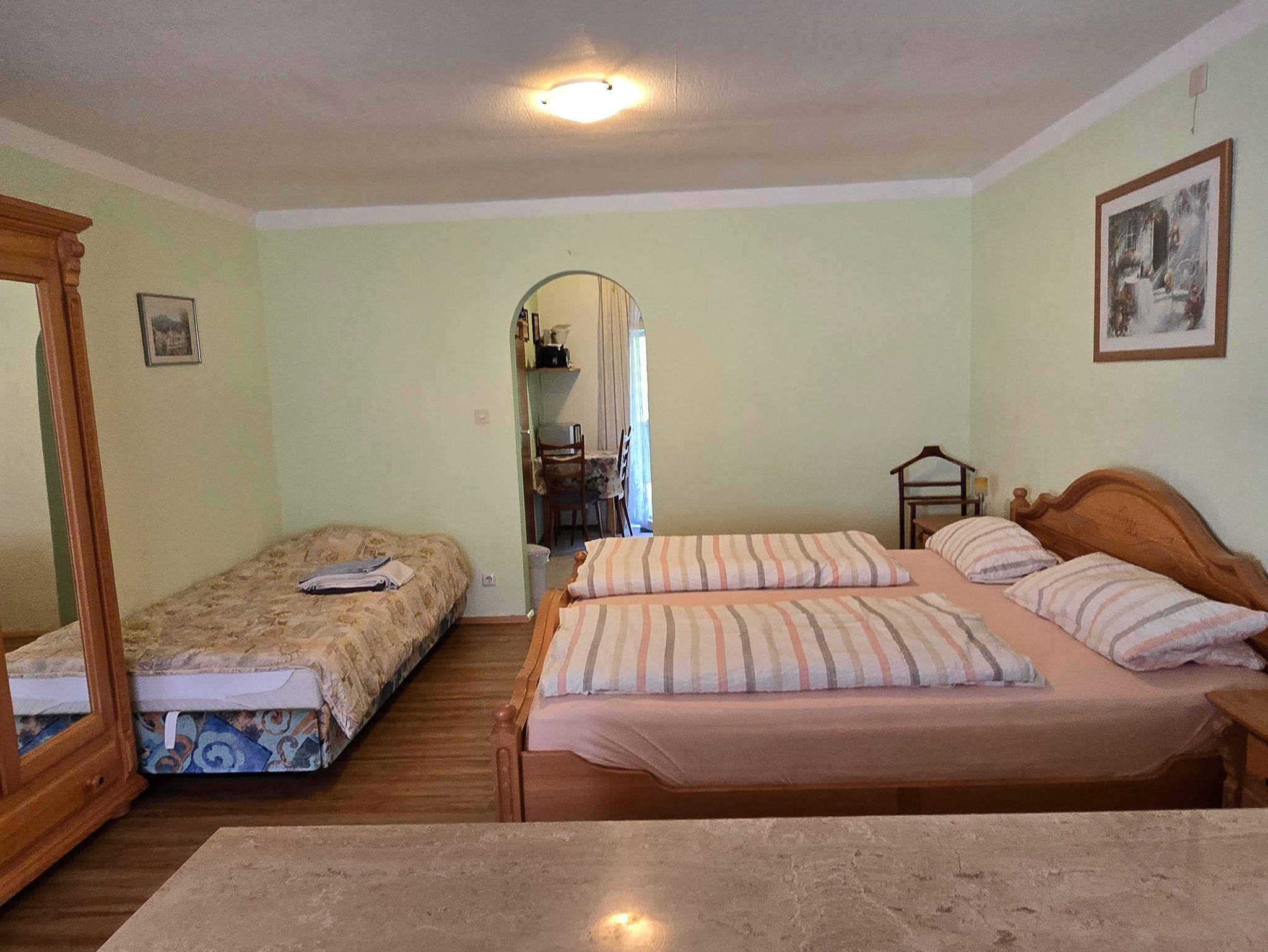 In diesem Zimmer befinden sich ein Doppelbett und zwei Schlafsofas.
