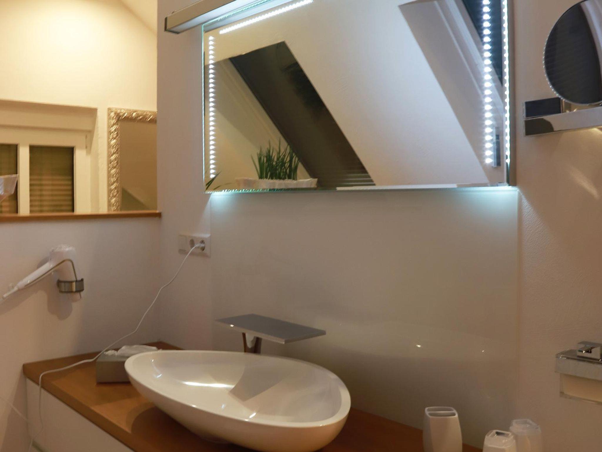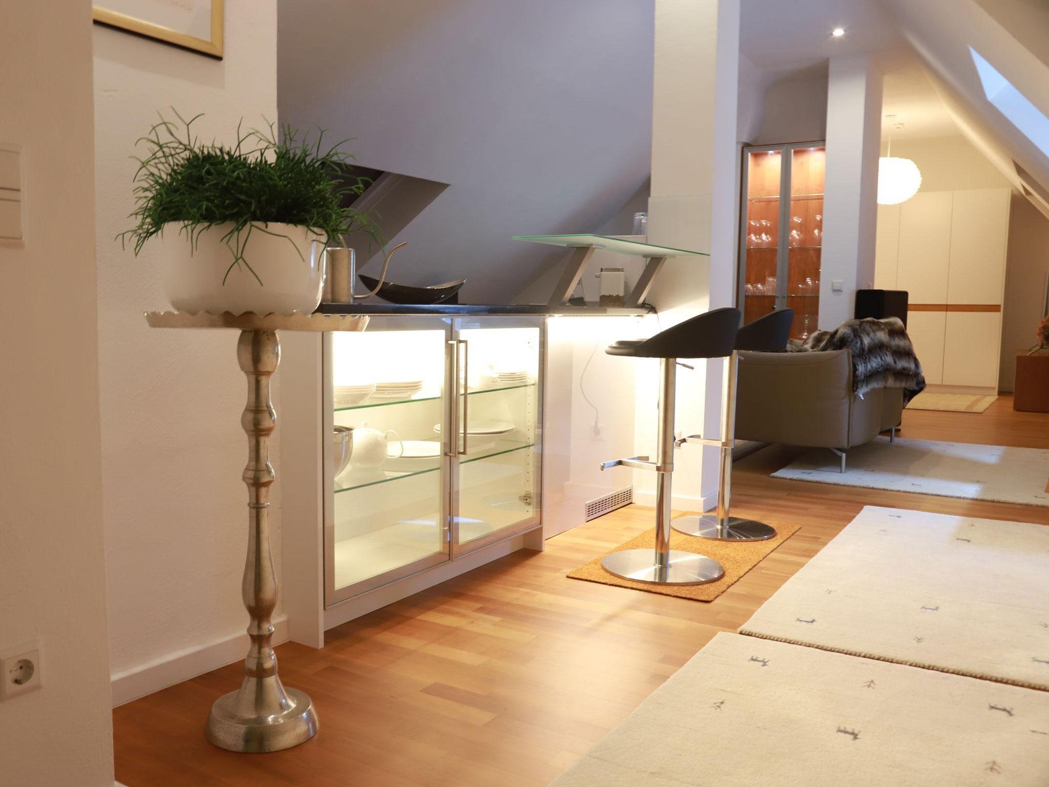 Auch das Badezimmer wurde sehr geschmackvoll und mit allem ausgestattet, was man in einem heutigen, luxuriösen Bad erwartet. Die Küche, die mit hochwertigen Elektrogeräten ausgestattet wurde, steht dem in nichts nach. Vom Schreiner angefertigte Küchenmöbel mit hochglanzlackierten Fronten und einer Arbeitsplatte aus Granit runden das Erlebnis in dieser Ferienwohnung ab.