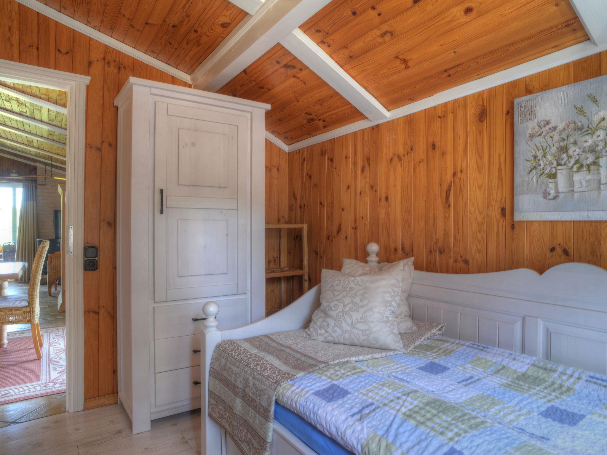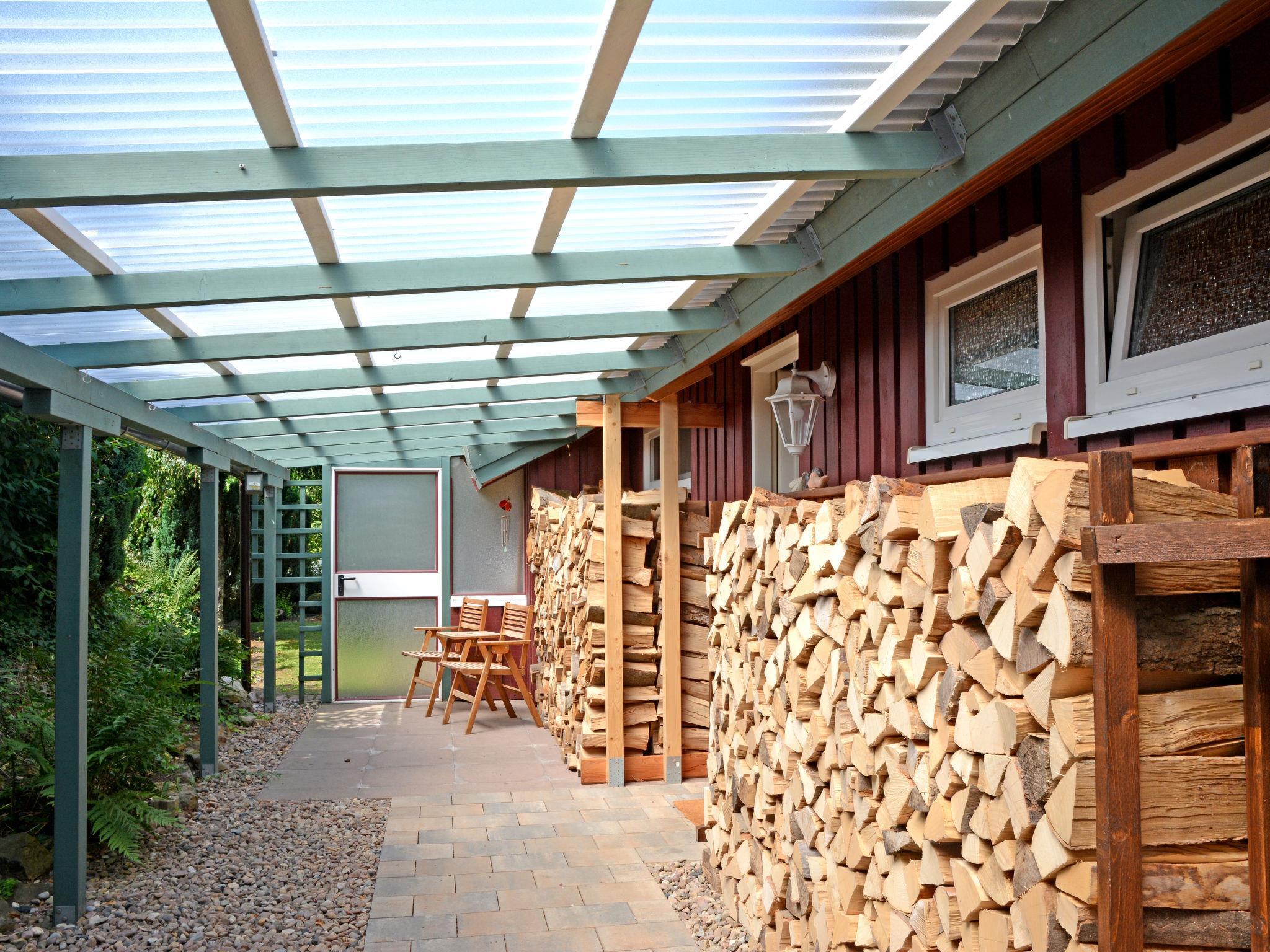 "Zedernhütte", 4-room house 70 m2, on the ground floor. Cosy and wooden furniture furnishings: living/dining room with Scandinavian wood stove and satellite TV (flat screen), hi-fi system. Exit to the terrace. 1 room with 1 x 2 bunk beds (80 cm, length 190 cm). 1 room with 1 double bed (160 cm, length 200 cm). 1 room with 1 double sofabed (150 cm, length 200 cm). Kitchenette (4 hot plates, oven, dishwasher, toaster, kettle, microwave, freezer, electric coffee machine). Shower/WC. Electric heating. Terrace roofed, patio, garden. Terrace furniture, barbecue. Facilities: washing machine, children's high chair. Internet (WiFi, free). Parking at the house. Please note: non-smoking house. Maximum 1 pet/ dog allowed. Bookings accepted for holiday purposes only.