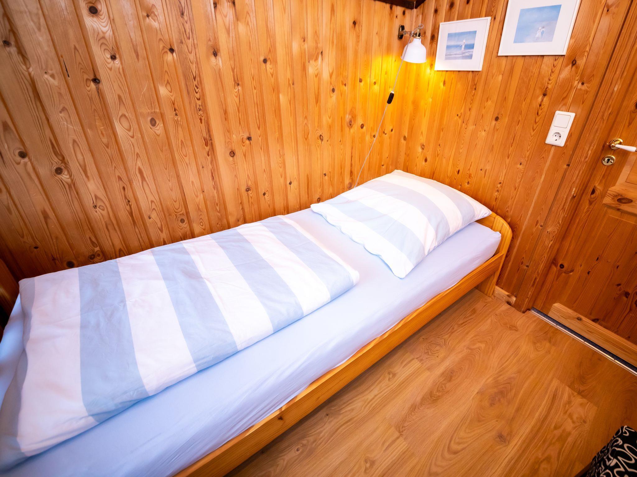 4-room semi-detached house 70 m2 on 2 levels, on the ground floor. Living/dining room with Scandinavian wood stove and satellite TV (flat screen), radio and DVD. Exit to the garden, to the terrace. 1 room with 1 double bed (160 cm, length 200 cm). Kitchenette (oven, dishwasher, 4 ceramic glass hob hotplates, microwave, electric coffee machine). Shower/WC. Upper floor: 1 room with sloping ceilings, without wardrobe with 1 bed. 1 double bedroom with sloping ceilings, without wardrobe. Electric heating. Terrace partly roofed. Terrace furniture, deck chairs (2), box-room. Facilities: sauna, iron, children's high chair, logs (extra). Internet (WiFi, free). Please note: non-smoking house. Maximum 2 small pets/ dogs allowed. The shared wardrobe for the single- and double room is located on the corridor on the upper floor. Living-/dining room with underfloor heating. Bathroom with underfloor heating and access to the sauna. 1 reserved parking space 20m from the house. Bookings accepted for holiday purposes only.
