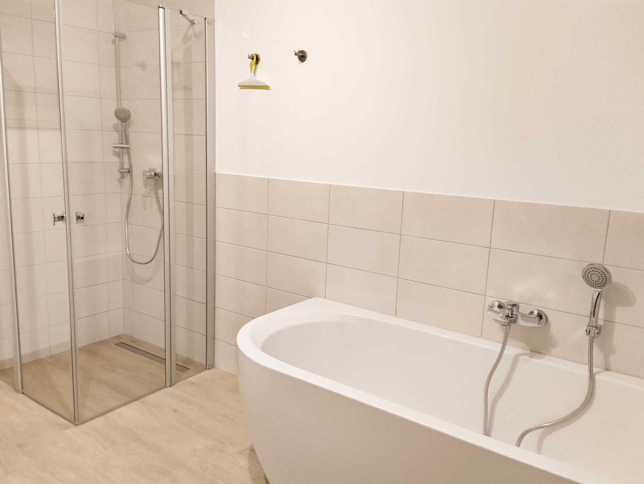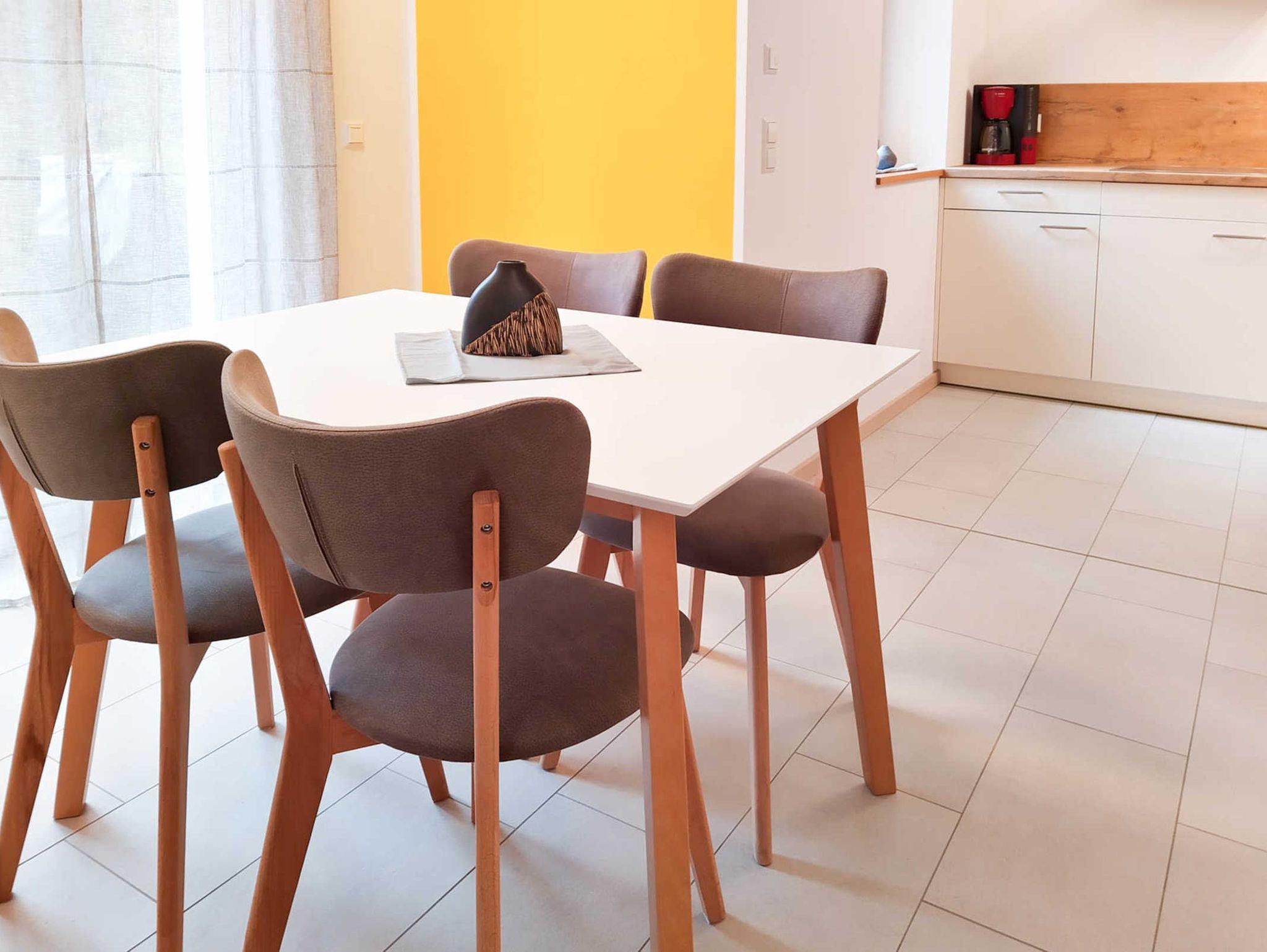 Die komfortable ca. 60m² große Ferienwohnung, für bis zu 4 Personen, befindet sich im Untergeschoss eines Hauses mit zwei Ferienwohnungen. Die Wohnung hat einen offen Wohn-/Ess- und Küchenbereich, ein Schlafzimmer und ein großes Badezimmer. Im Wohnbereich besteht die Möglichkeit zur Aufbettung (eine Schlafcouch für 2 Personen). Die stilvoll eingerichtete Wohnung verfügt über eine Fußbodenheizung und Fernseher mit Internet sowie DAB+ CD/Radio. Das Bad ist mit einer ebenerdige/barrierefreien Dusche, einem unterfahrbarem Waschbecken und einen WC ausgestattet, zudem steht eine Badewanne zur Verfügung. Vom Wohnbereich aus gelangt man auf die Terrasse, die zum Sonne tanken, Frühstücken oder einfach nur zum Verweilen einlädt. Die hochwertig ausgestattete Küche verfügt über ein Ceran-Kochfeld, einen Kühlschrank mit Gefrierfach, eine Mikrowelle, eine Geschirrspülmaschine, sowie einen Backofen in Arbeitshöhe. Zur weiteren Ausstattung gehören eine Kaffeemaschine, ein Wasserkocher und ein Toaster. Im Bad kann ein Fön genutzt werden. Im Hauswirtschaftsraum wurde eine Waschmaschine installiert.