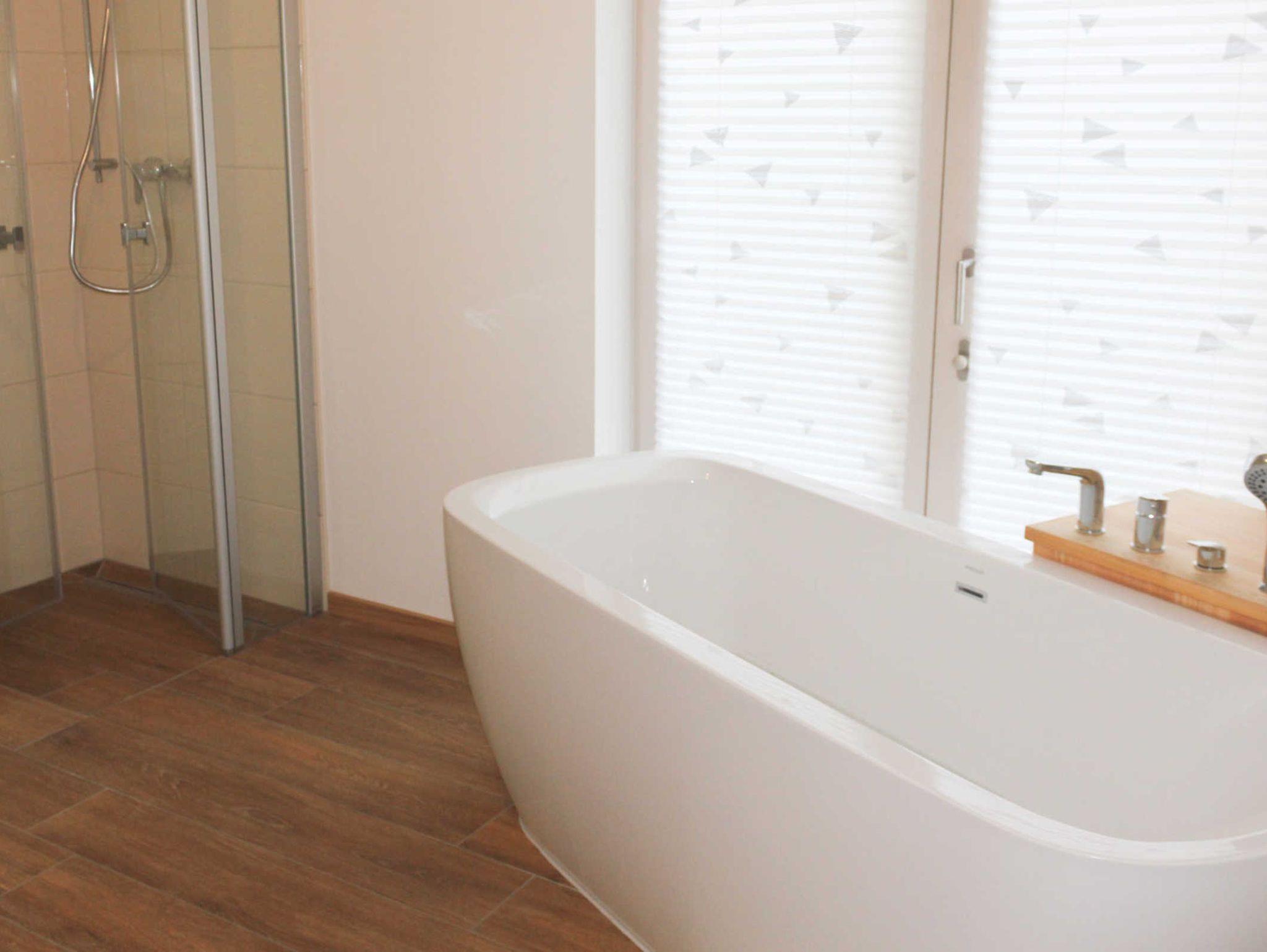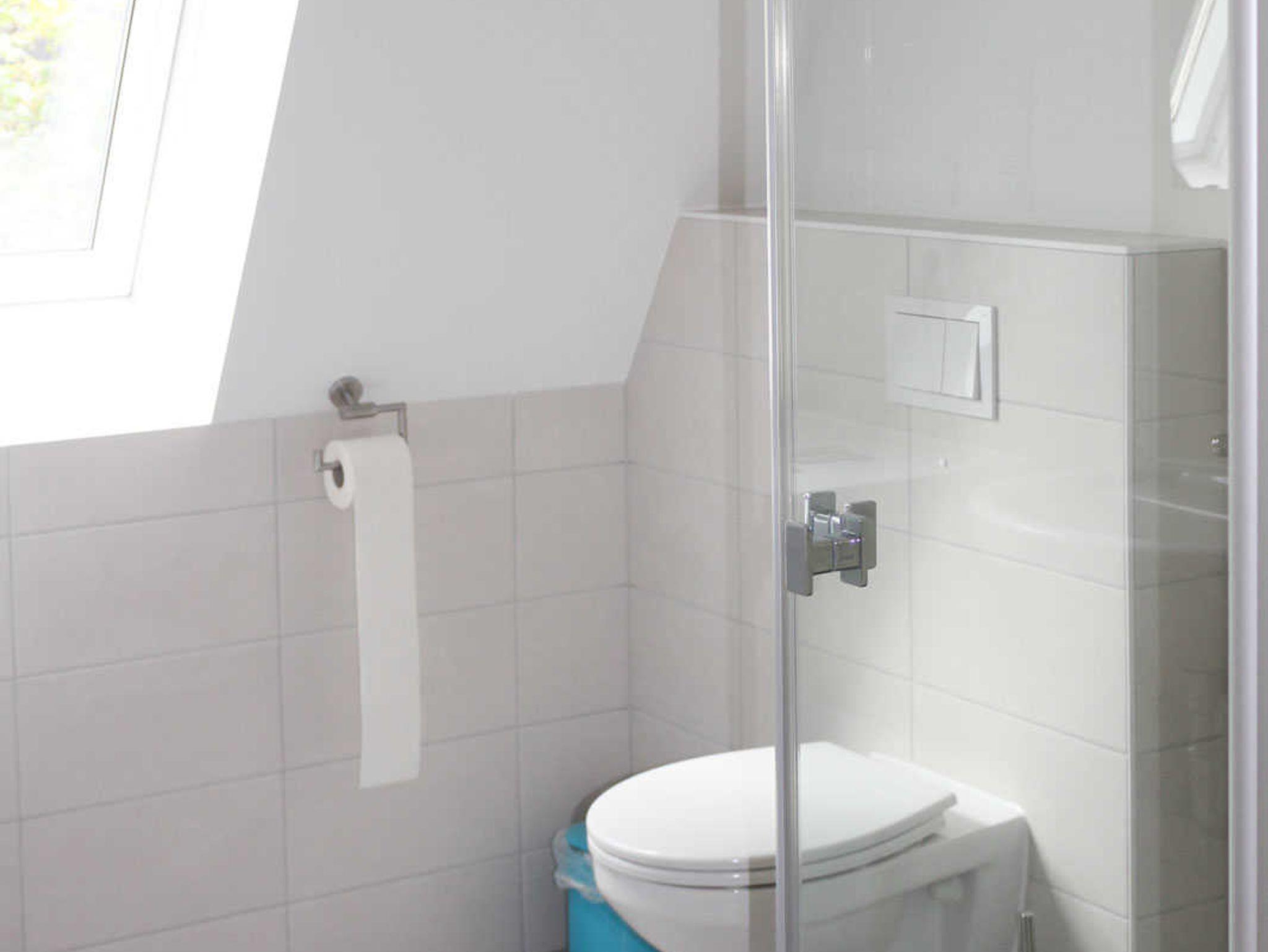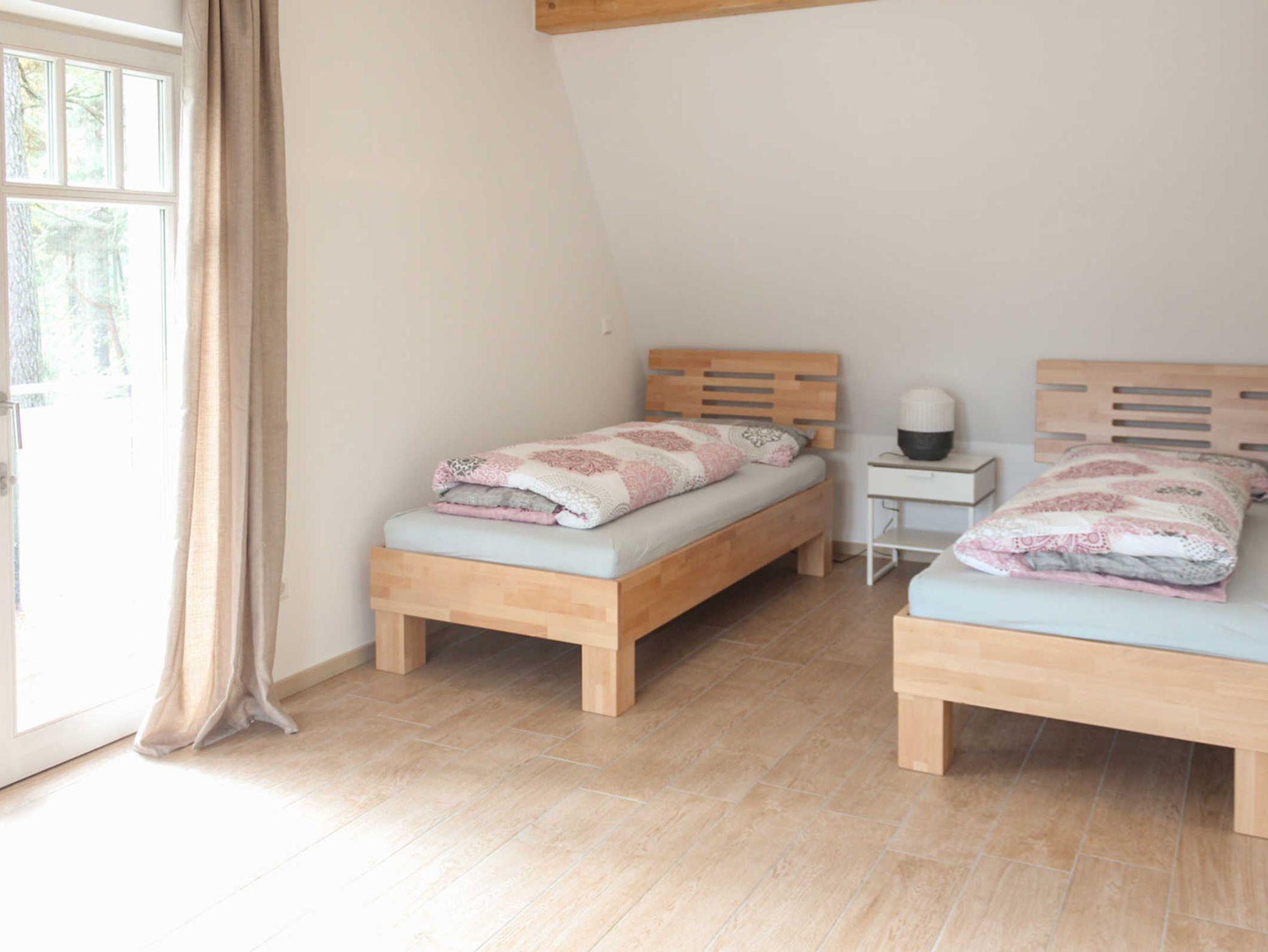 Die komfortable ca. 95m² große Ferienwohnung, für bis zu 6 Personen, befindet sich im Oberschoss des Hauses mit zwei Ferienwohnungen und erstreckt sich über 2 Etagen. Das Erdgeschoß beherbergt den offenen Wohn-/Ess- und Küchenbereich, ein großes Bad sowie ein Gästezimmer. Über eine großzügig gestaltete Treppe gelangt man aus dem Wohnbereich ins helle, lichtdurchflutete Dachgeschoß. Im Dachgeschoss finden sich zwei Schlafräume, sowie ein weiteres Bad. Die Schlafräume weisen eine identische Größe auf und sind ausgestattet mit einem Doppelbett (zur Seeseite) bzw. Einzelbetten (zur Waldseite) und einem Kleiderschrank. Eine Relax-Ecke rundet das Gesamtbild ab. Die stilvoll eingerichtete Wohnung verfügt über eine Fußbodenheizung, GästeW-Lan und digitalen Fernseher mit Internet sowie DAB+ CD/Radio. Die Bäder sind mit einer ebenerdige/barrierefreien Dusche, einem unterfahrbarem Waschbecken und einen WC sowie Fön ausgestattet. Im Bad im Erdgeschoß steht zudem eine Badewanne zur Verfügung. Die Waschmaschine befindet sich im Bad im Obergeschoß.