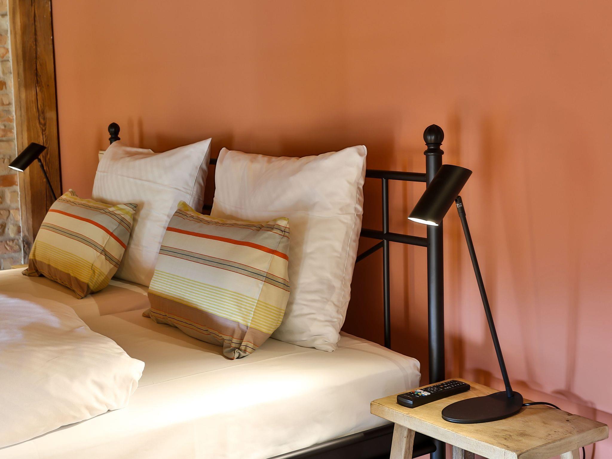Wie bei allen unseren Doppelzimmern im Obergeschoss empfängt den Gast eine entspannte Wohlfühlatmosphäre. In den ca. 30 qm Fläche, die offen gehalten ist, lässt sich die Seele gern baumeln. Lust auf Fernsehabend? In der bequemen Sitzgruppe kein Problem. Oder doch lieber vom Doppelbett? Der schwenkbare Flach-TV ist von jeder Position einsehbar. Mit einem Buch aus unserer Bibliothek lässt es sich in Liebenberg natürlich auch prima entspannen. Duschen in dem geräumigen Bad ist ebenfalls ein Genuss. Ob Kurztrip oder längerer Aufenthalt. Hier fühlen Sie sich gleich zuhause. Selbstverständlich steht auch hier kostenloses WLAN sowie kostenfreie Parkplätze zur Verfügung. Eine Aufbettung mit Zustellbett ist möglich.