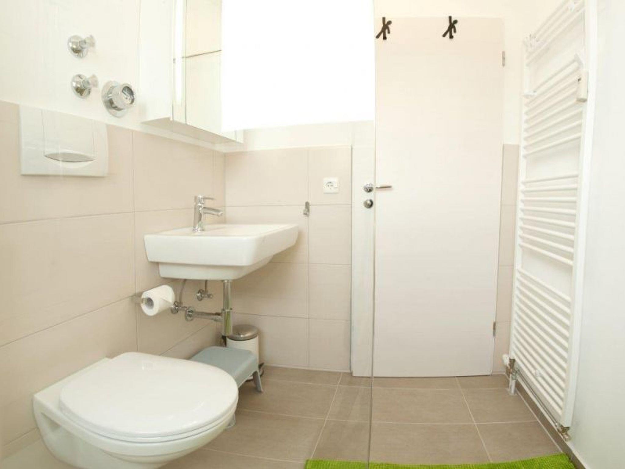 Tageslichtbad mit Fenster, barrierefreier Dusche und Handtuchheizkörper.