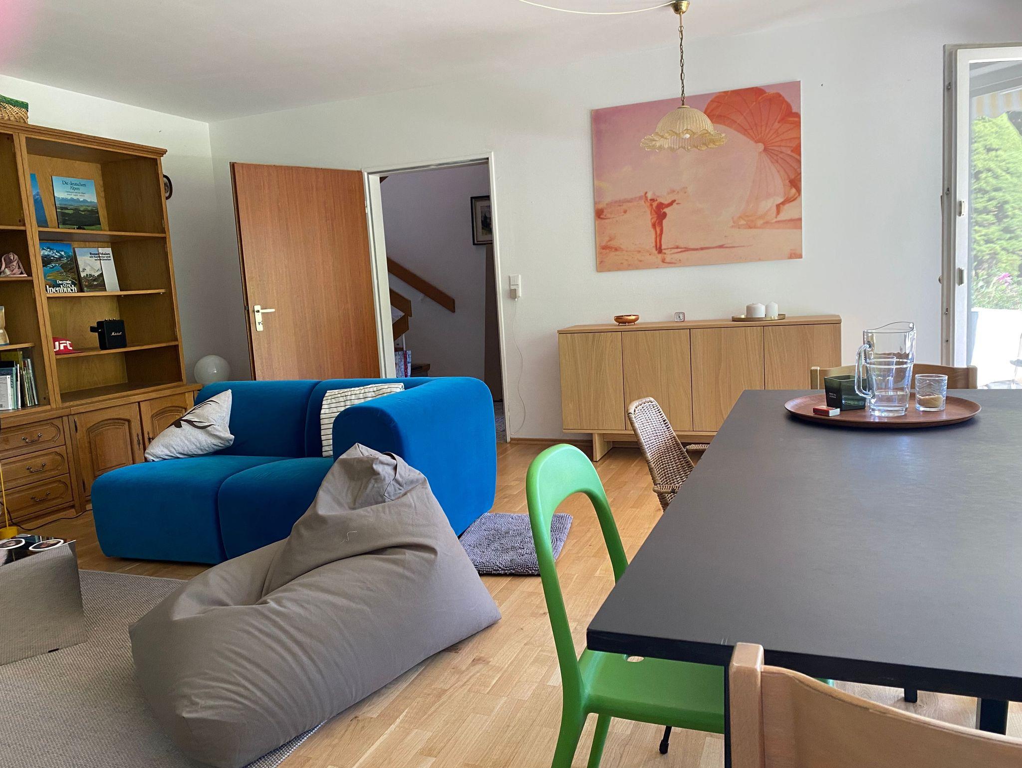 • Geräumiges Wohnzimmer mit Sitzgruppe, Esstisch und Wohnwand