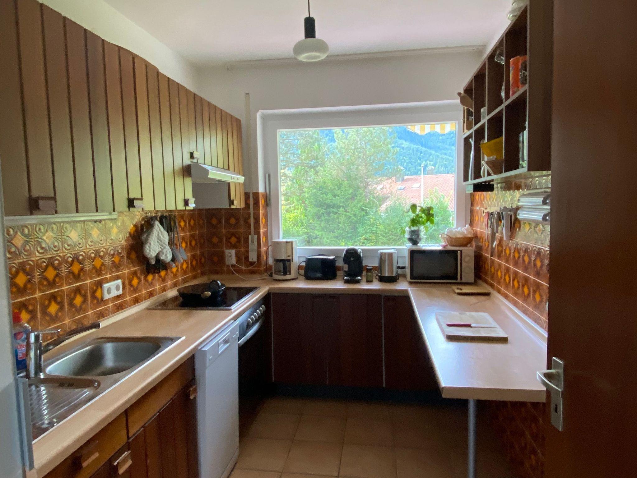 • Moderne Einbauküche mit Herd, Backofen, Spülmaschine, Tiefkühlfach, Mikrowelle, etc.