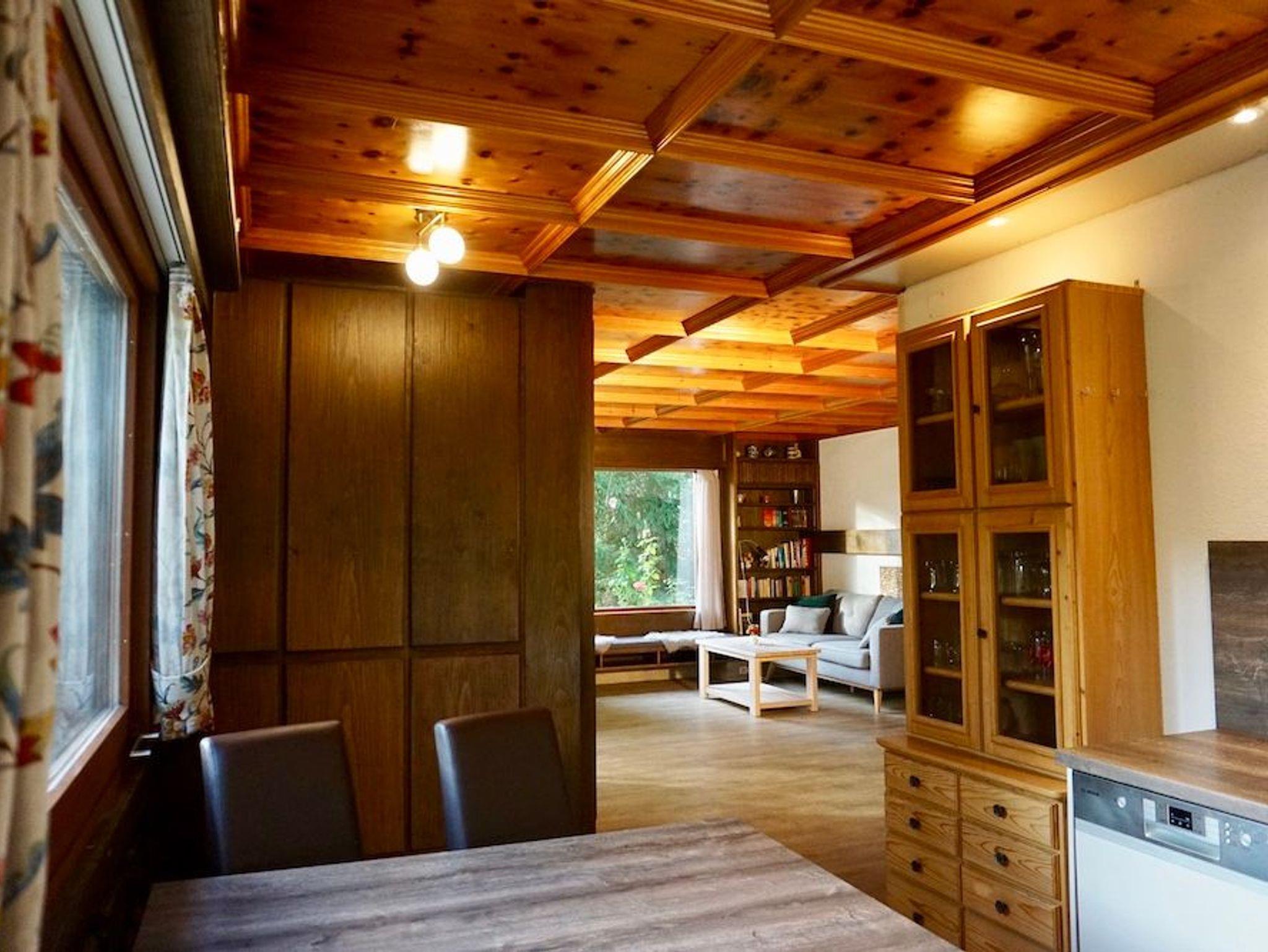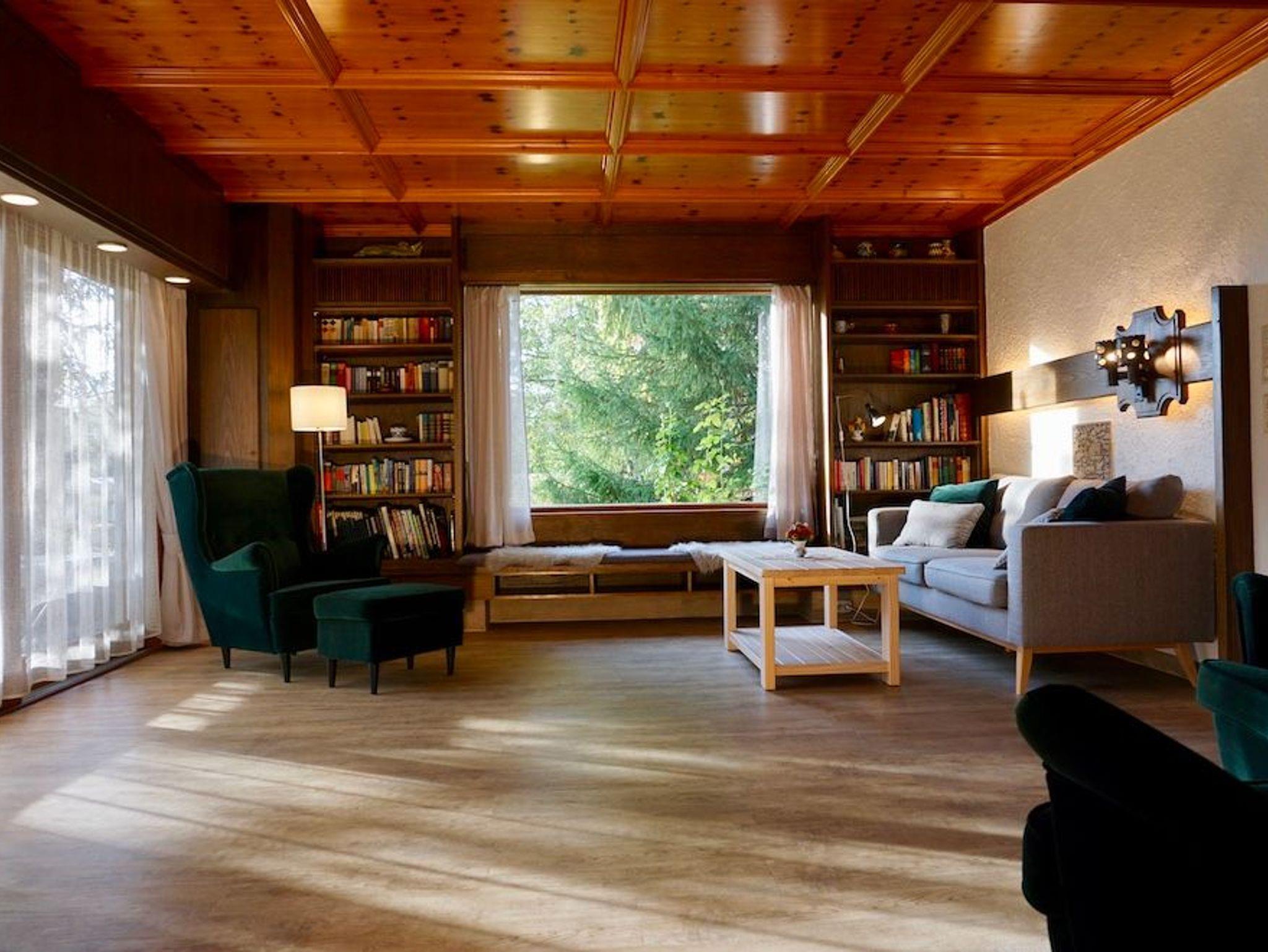 Die Wohnfläche des Hauses kommt so zu einem großen Teil dem großzügigen Wohnbereich mit Kachelofen, Essecke und offener Küche zu Gute. Im gesamten Wohnbereich entsteht durch die echte Zirbelholz-Kassettendecke eine sehr gemütliche Atmosphäre.
