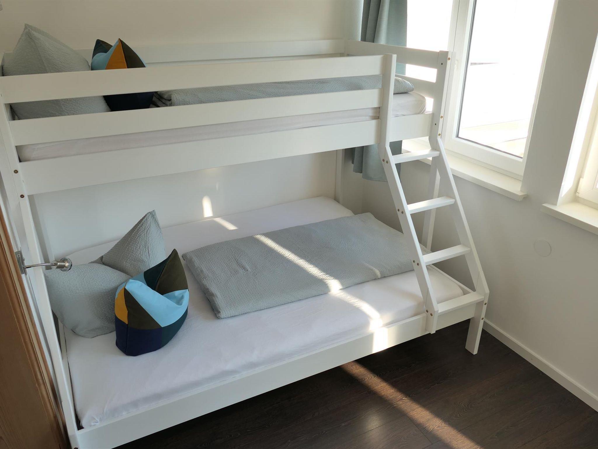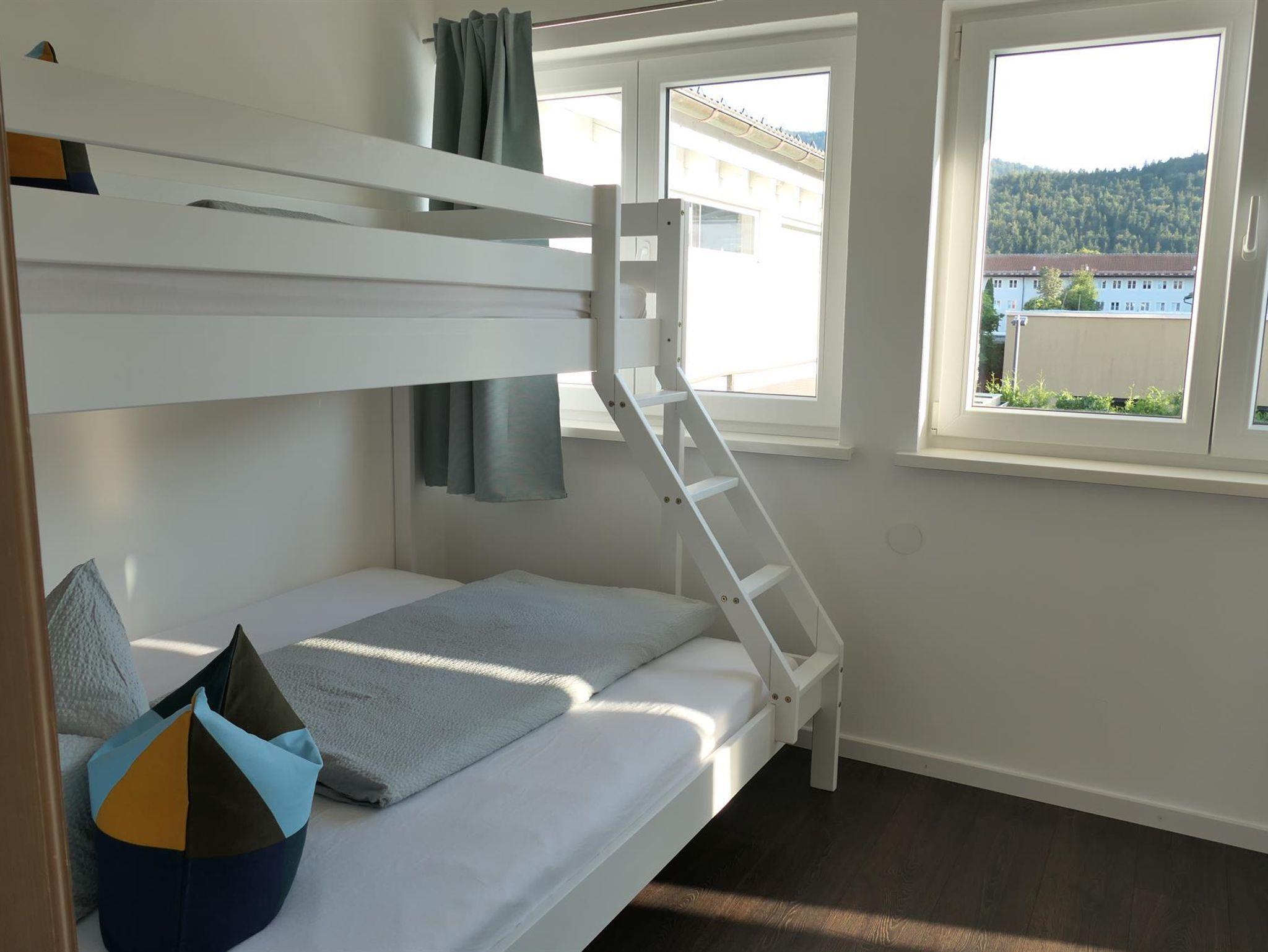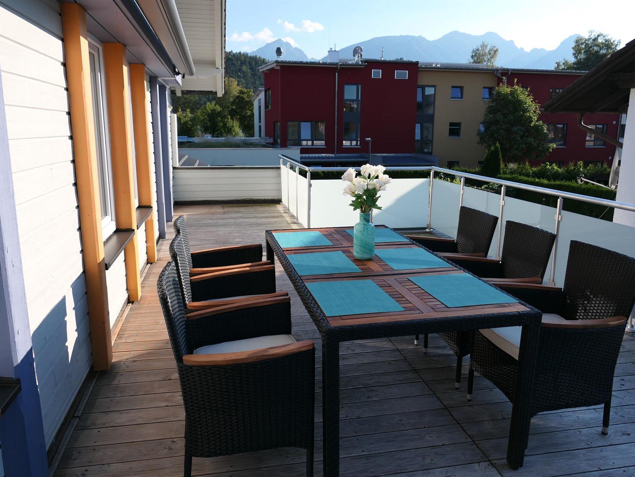 Fühlen Sie sich wohl in unserer exklusiven, hellen und gemütlichen FEWO König Ludwig (110qm) bis 6 Personen im 1. Stock mit Dachterrasse (40qm mit Außenbestuhlung) und Blick auf die Berge. Die großzügige, hochwertige Wohnküche mit bodentiefen Fenstern ist ausgestattet mit Esstisch und bequemen Sitzbänken. Das Wohnzimmer mit Wohlfühlkamin und 65 Zoll Smart-TV, lädt die ganze Familie zum Verweilen ein. Es gibt 3 separate Schlafzimmer mit je 2 Doppelbetten (1x180cm, 1x140cm), sowie ein Etagenbett. Weiter bieten wir ein Badezimmer mit Duschwanne und WC, ein separates WC, Waschraum mit Waschmaschine und Trockner, Spülmaschine, Kühl- und Gefrierschrank, Ceranfeld, Backofen, Mikrowelle, Wasserkocher, Kaffeemaschine, Smart-TVs in den Schlafzimmern, WLAN inklusive, Kinderbett und Kinderstuhl. Die FEWO eignet sich für Eltern mit Kindern und Großeltern oder kleine Gruppen, Nichtraucherhaus, Parkplatz am Haus (kostenfrei), Bäckerei und Supermarkt 200m entfernt