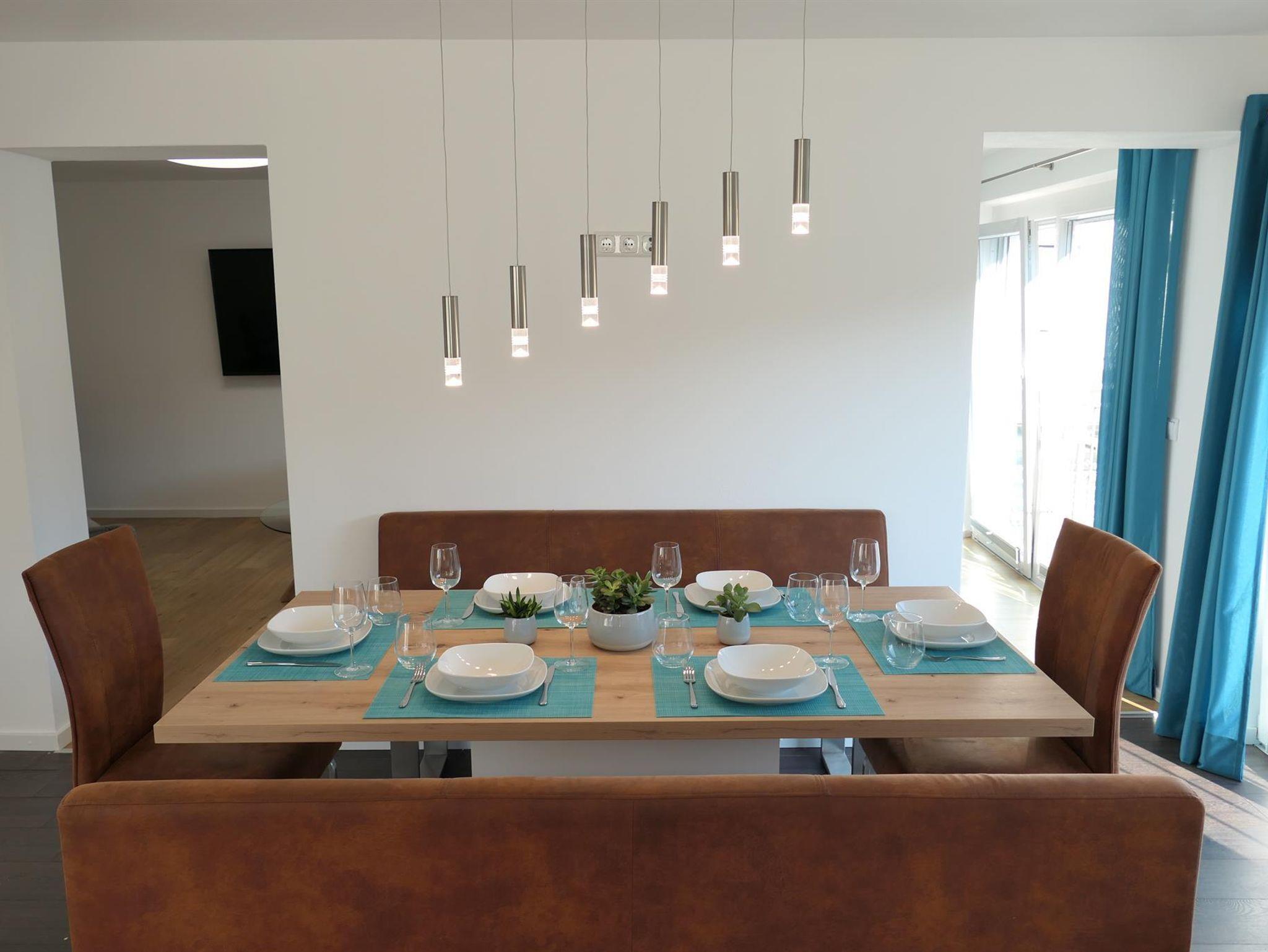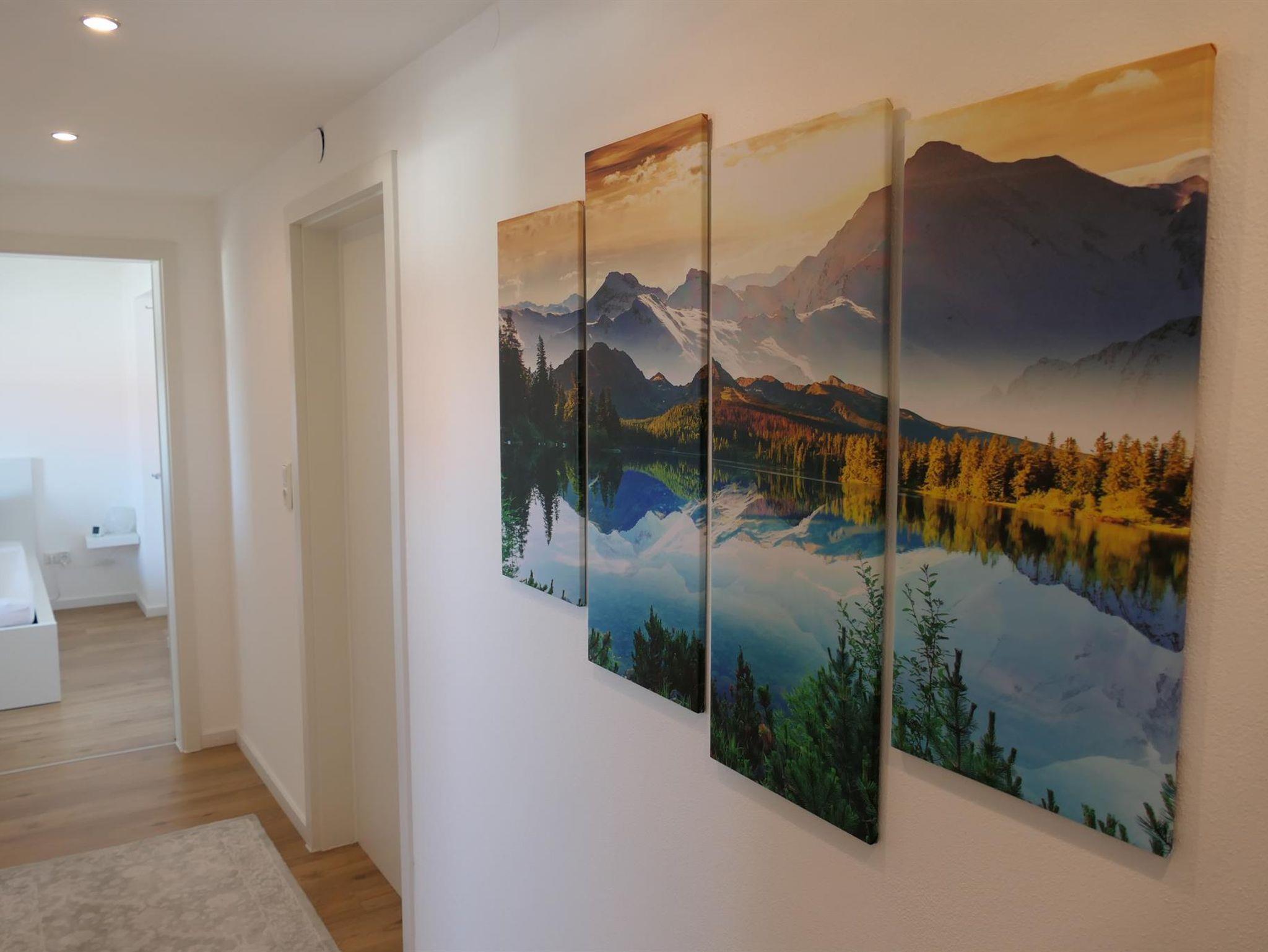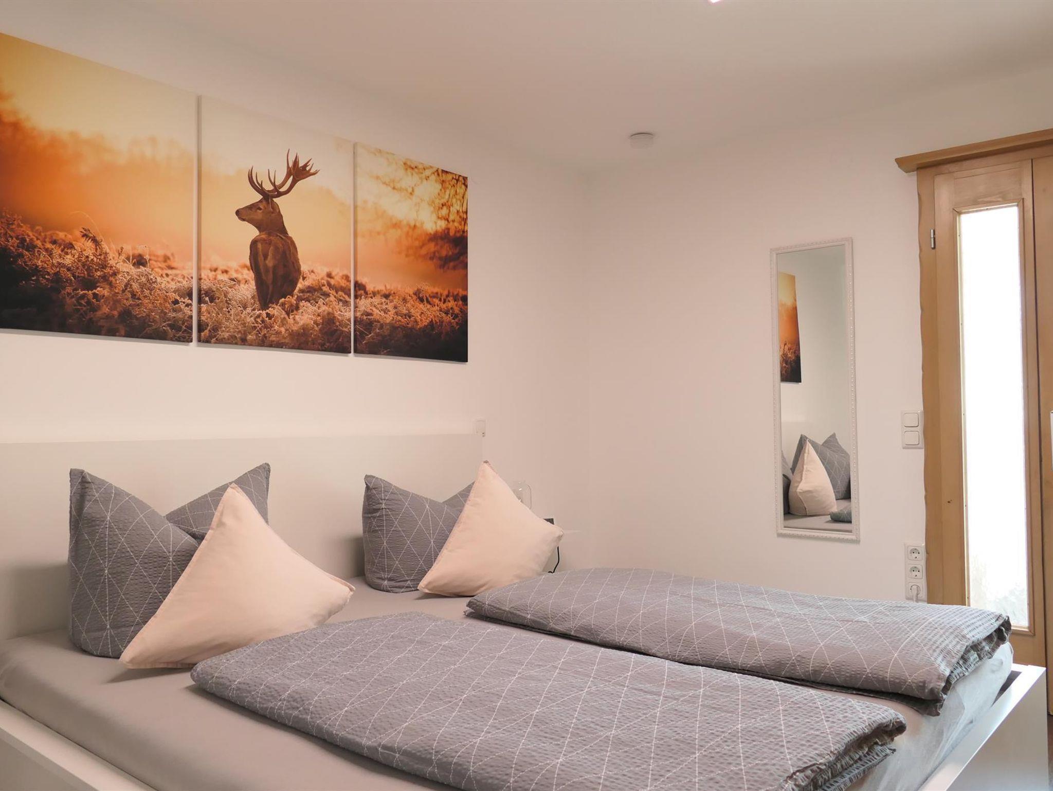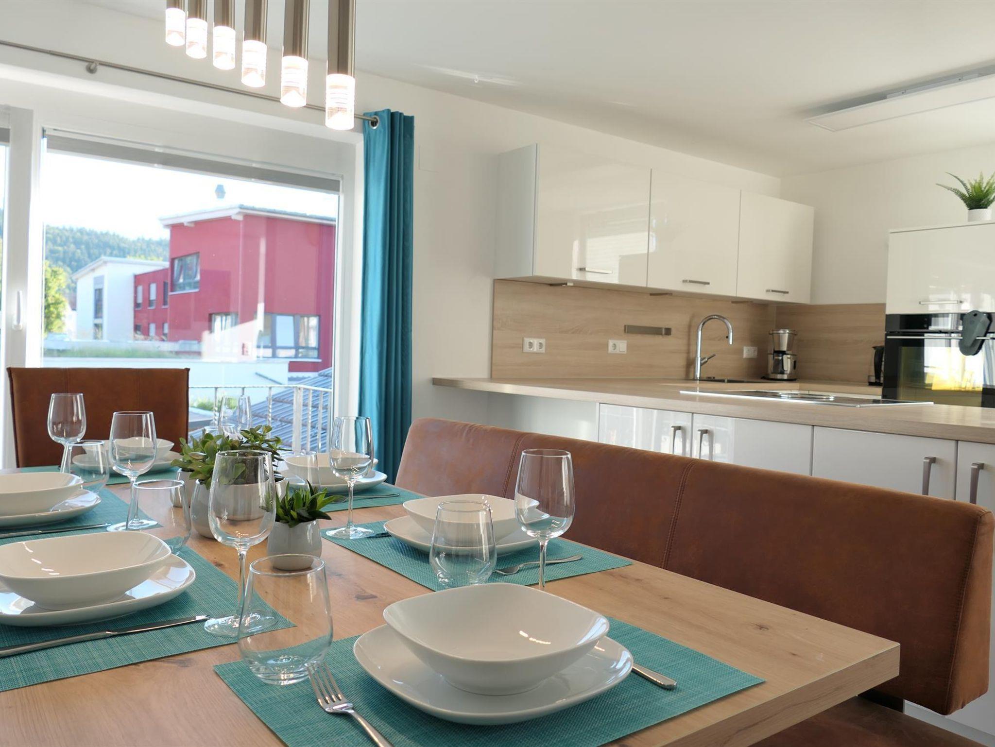 Fühlen Sie sich wohl in unserer exklusiven, hellen und gemütlichen FEWO König Ludwig (110qm) bis 6 Personen im 1. Stock mit Dachterrasse (40qm mit Außenbestuhlung) und Blick auf die Berge. Die großzügige, hochwertige Wohnküche mit bodentiefen Fenstern ist ausgestattet mit Esstisch und bequemen Sitzbänken. Das Wohnzimmer mit Wohlfühlkamin und 65 Zoll Smart-TV, lädt die ganze Familie zum Verweilen ein. Es gibt 3 separate Schlafzimmer mit je 2 Doppelbetten (1x180cm, 1x140cm), sowie ein Etagenbett. Weiter bieten wir ein Badezimmer mit Duschwanne und WC, ein separates WC, Waschraum mit Waschmaschine und Trockner, Spülmaschine, Kühl- und Gefrierschrank, Ceranfeld, Backofen, Mikrowelle, Wasserkocher, Kaffeemaschine, Smart-TVs in den Schlafzimmern, WLAN inklusive, Kinderbett und Kinderstuhl. Die FEWO eignet sich für Eltern mit Kindern und Großeltern oder kleine Gruppen, Nichtraucherhaus, Parkplatz am Haus (kostenfrei), Bäckerei und Supermarkt 200m entfernt