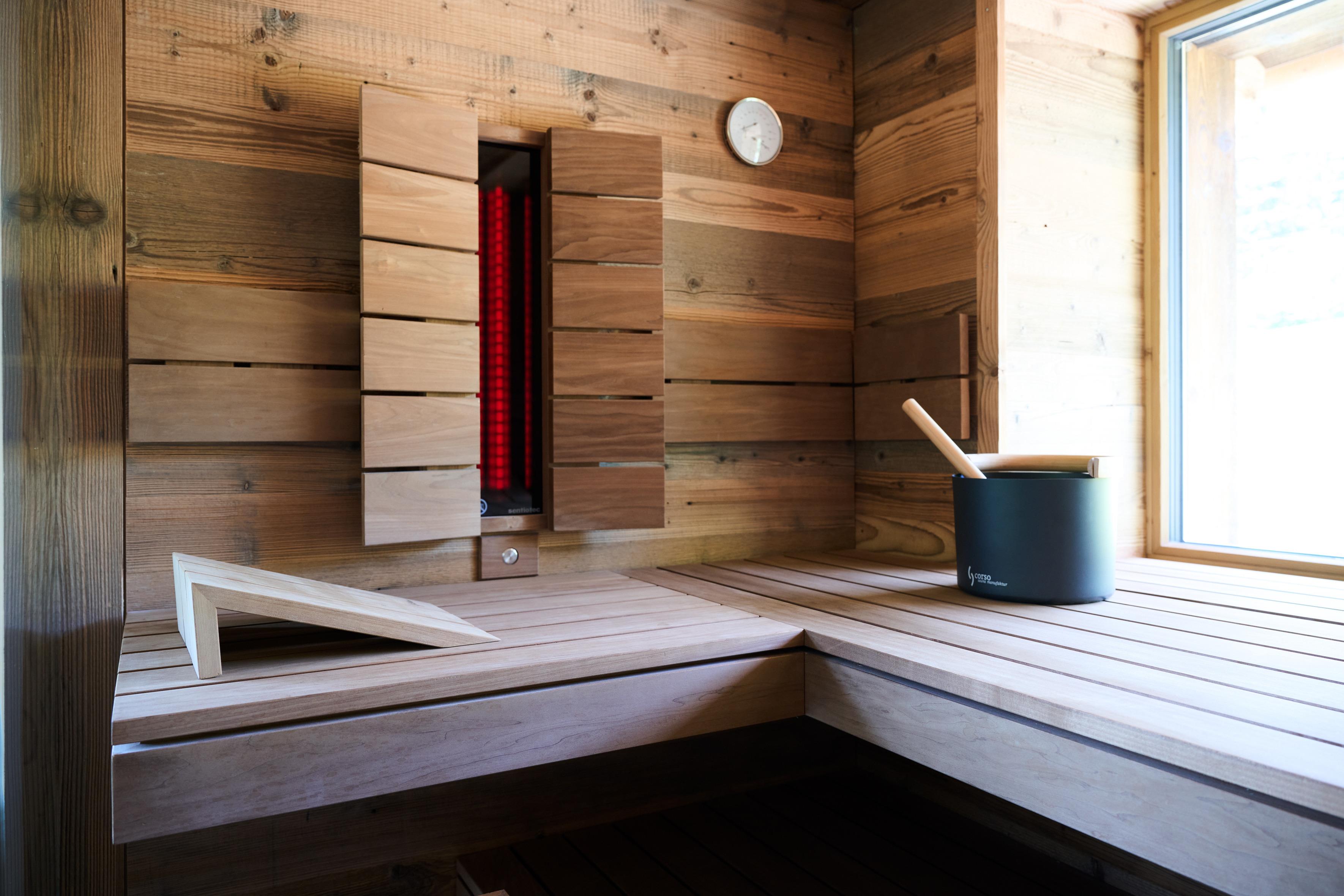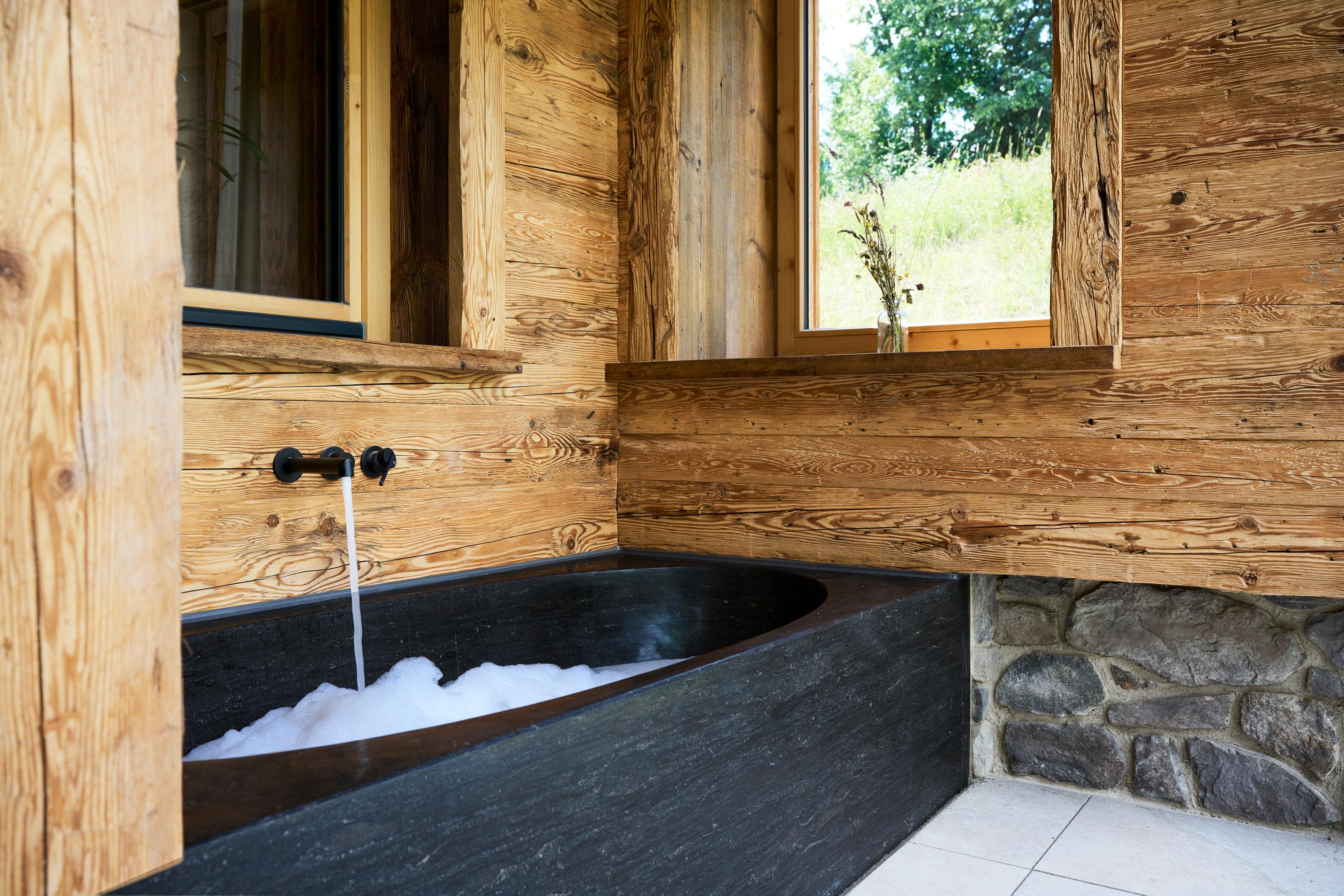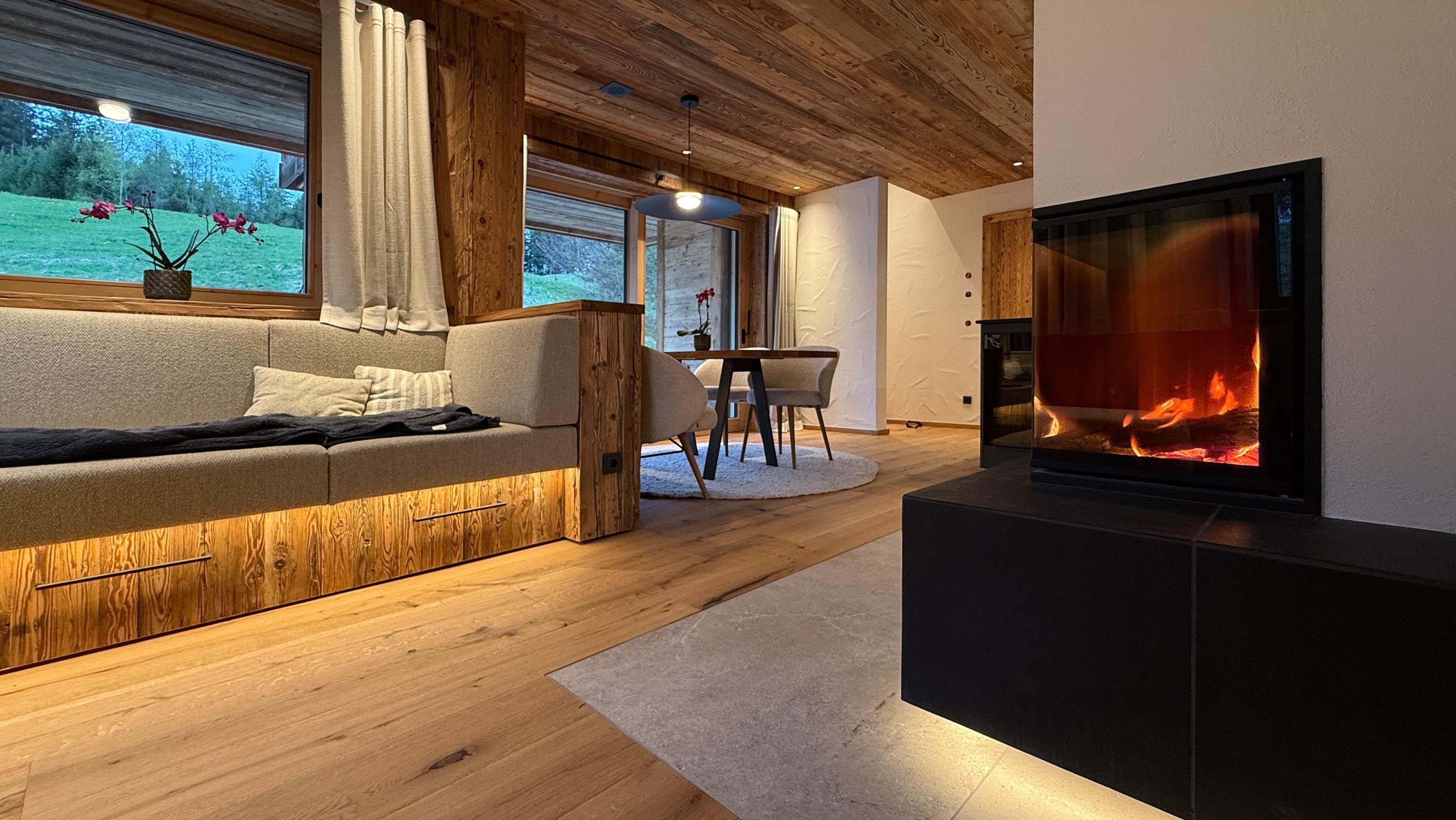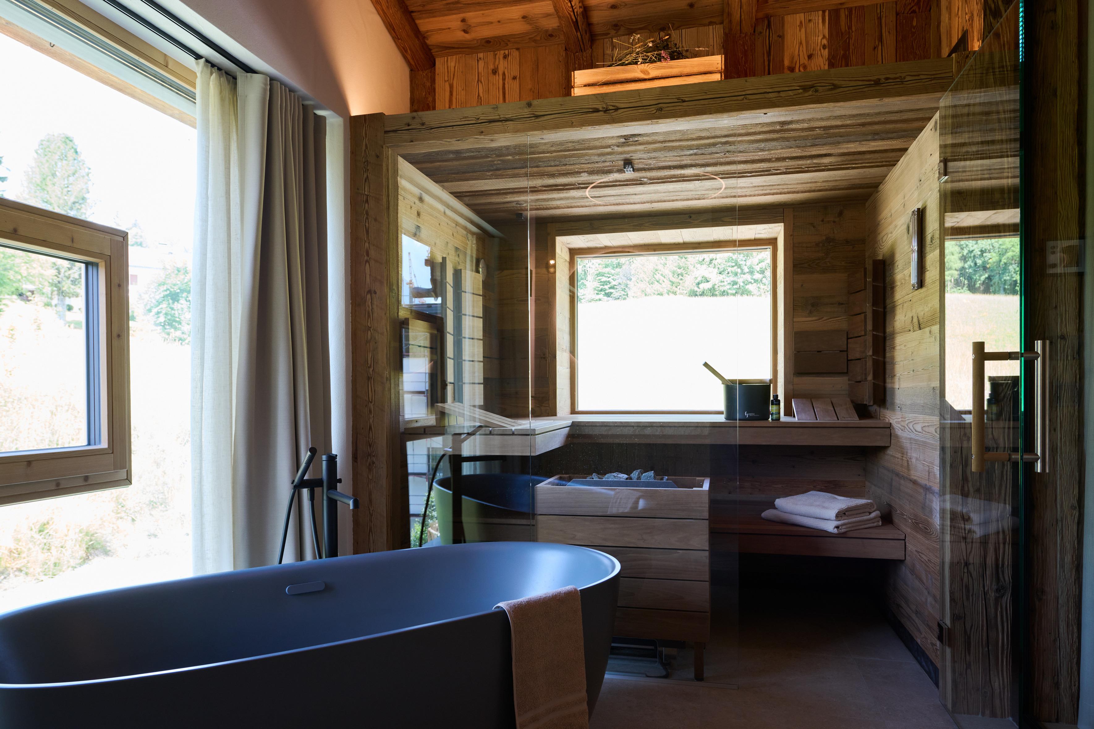 Willkommen im Fünf-Sterne-Chalet Waldblick – ein Ort für romantische Auszeiten und echte Entspannung. Auf großzügigen 90 Quadratmetern erwarten Sie hochwertiges Design, natürliche Materialien und eine Atmosphäre, die Geborgenheit und stilvolle Eleganz vereint. Der große Balkon eröffnet Ihnen einen freien Blick auf den angrenzenden Wald – ein Panorama, das Ruhe atmet und Sie augenblicklich zur Gelassenheit einlädt. Ein besonderes Highlight ist die freistehende Outdoor-Panoramabadewanne – der perfekte Ort für unvergessliche Momente unter freiem Himmel, allein oder zu zweit. Auch die private Sauna mit Blick ins Grüne schenkt Ihnen tiefe Entspannung und ist mit zwei kraftvollen Infrarot-Rückenstrahlern ausgestattet, die gezielt Verspannungen lösen und für wohltuende Wärme sorgen.