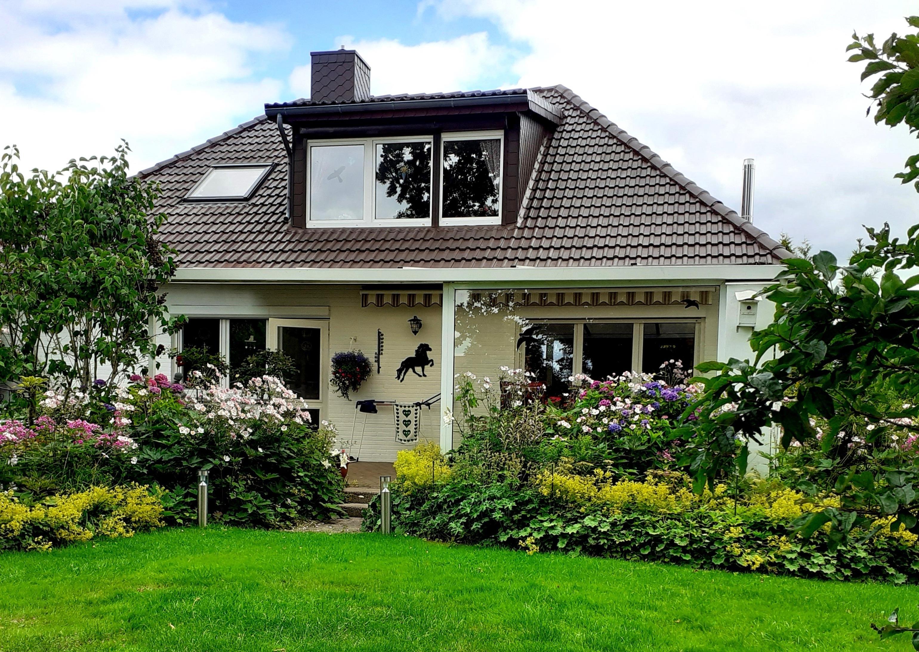 Ruhiges Einfamilienhaus in Fahrdorf mit Garten, Teich und Blockhütte. Die Ferienwohnung liegt im Obergeschoss. Einen Autoabstellplatz bietet der hauseigene Parkplatz. Unterstellplatz für mitgebrachte Fahrräder ist ebenfalls vorhanden. Hauseigene Fahrräder stehen kostenlos zur Verfügung.