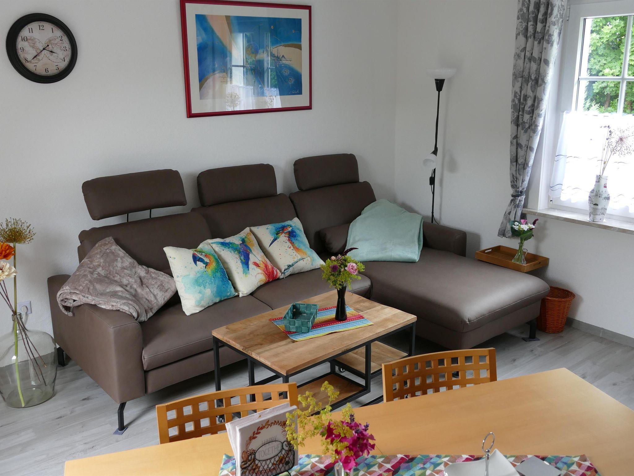 Die Wohnung verfügt über ein helles, freundliches Wohnzimmer, das mit einem gemütlichen Sofa, einem Flachbild-TV (Smart-TV, mit Netflix) und einem Essbereich ausgestattet ist – perfekt zum Entspannen nach einem erlebnisreichen Tag.