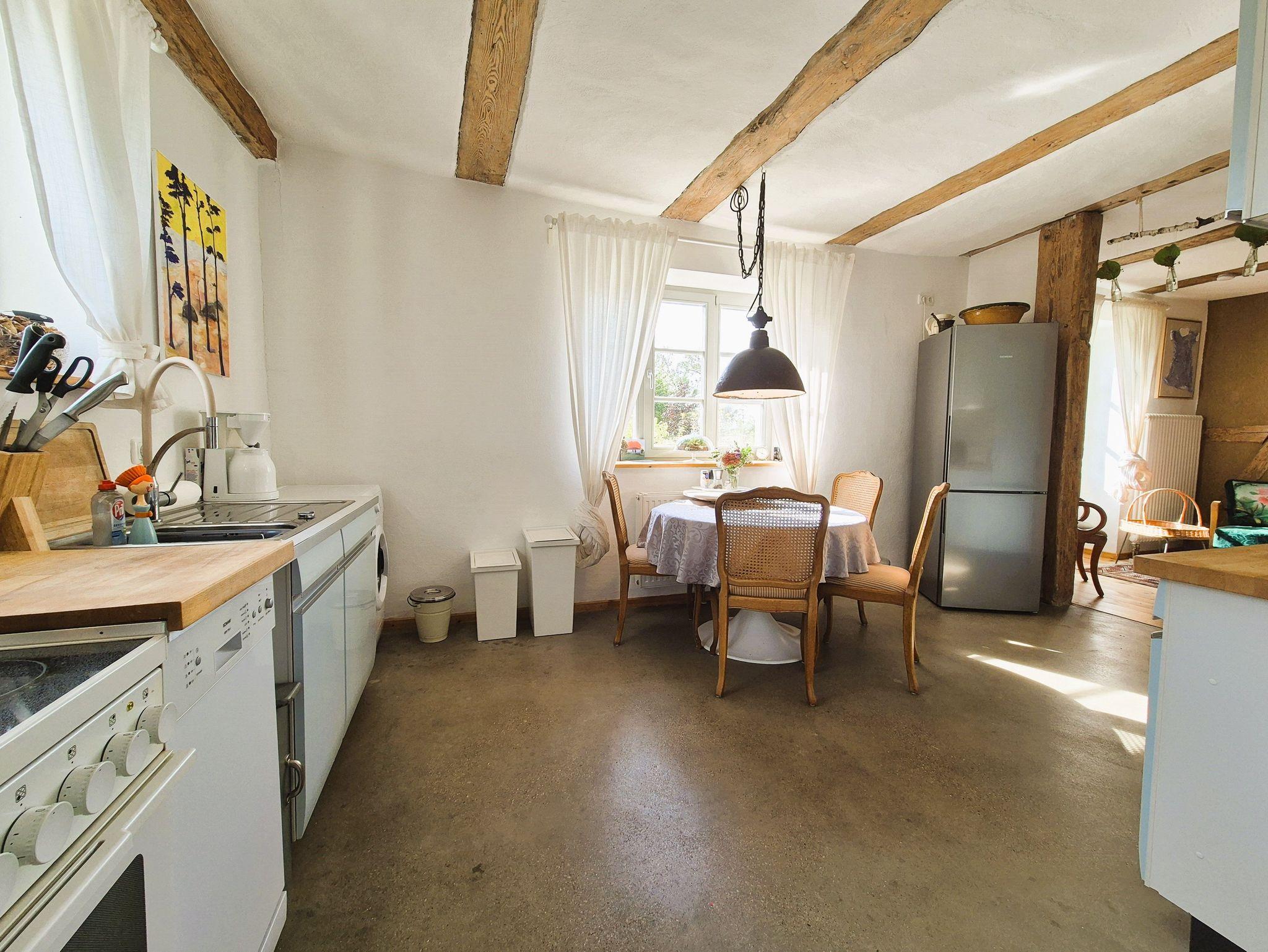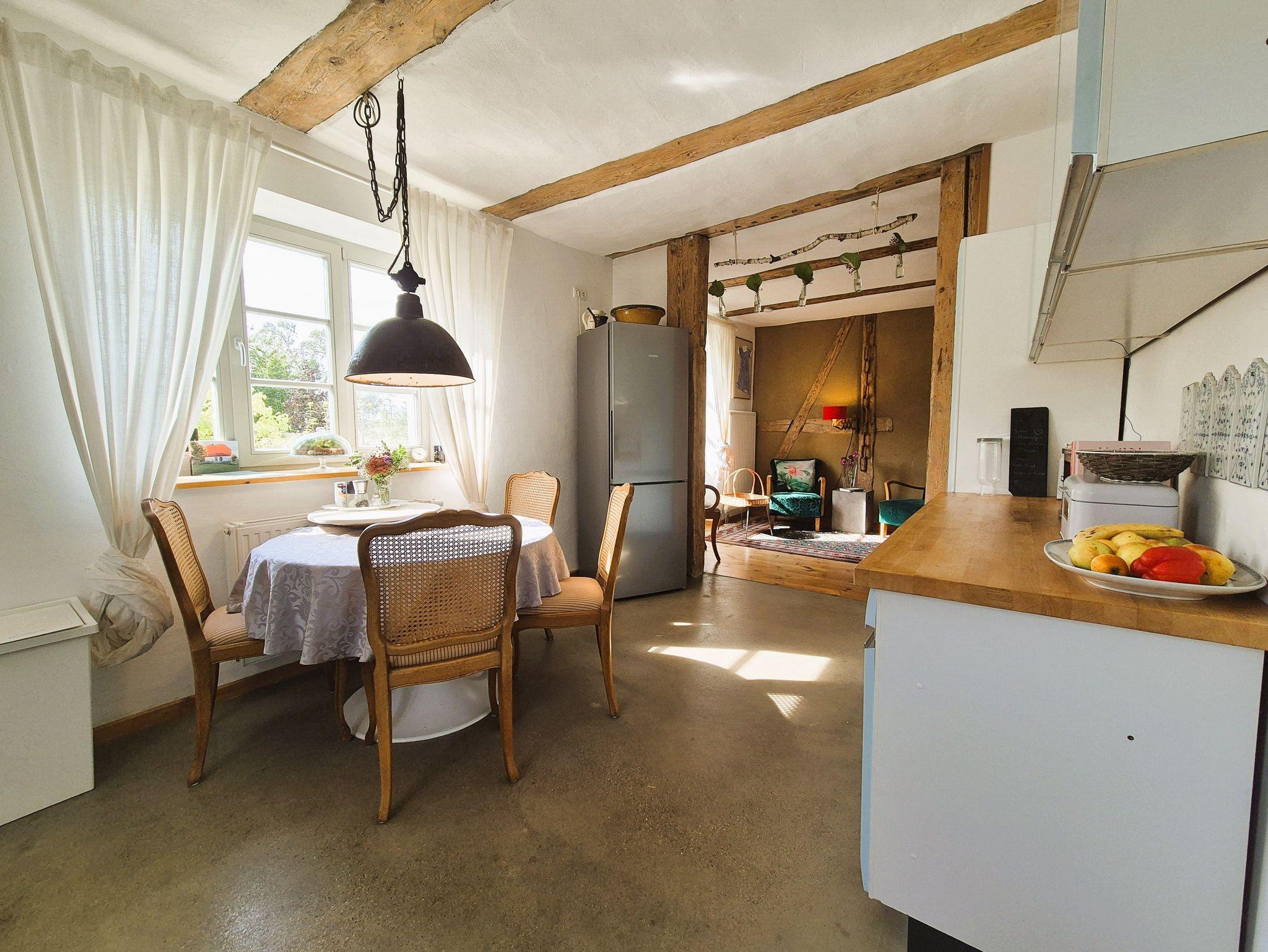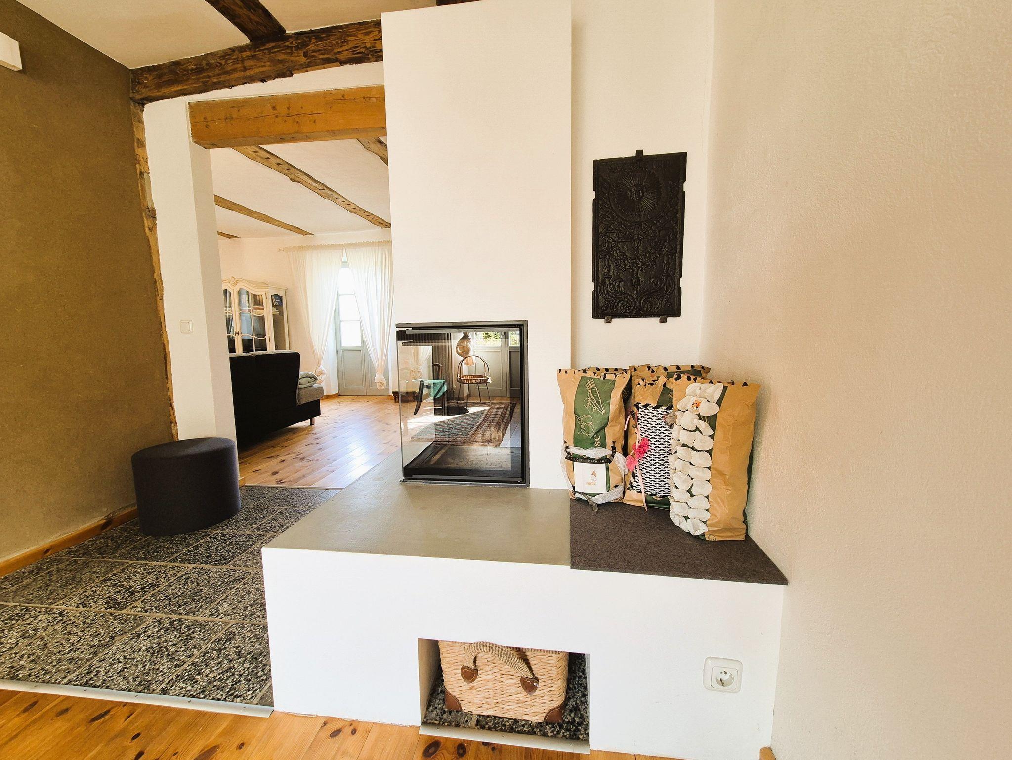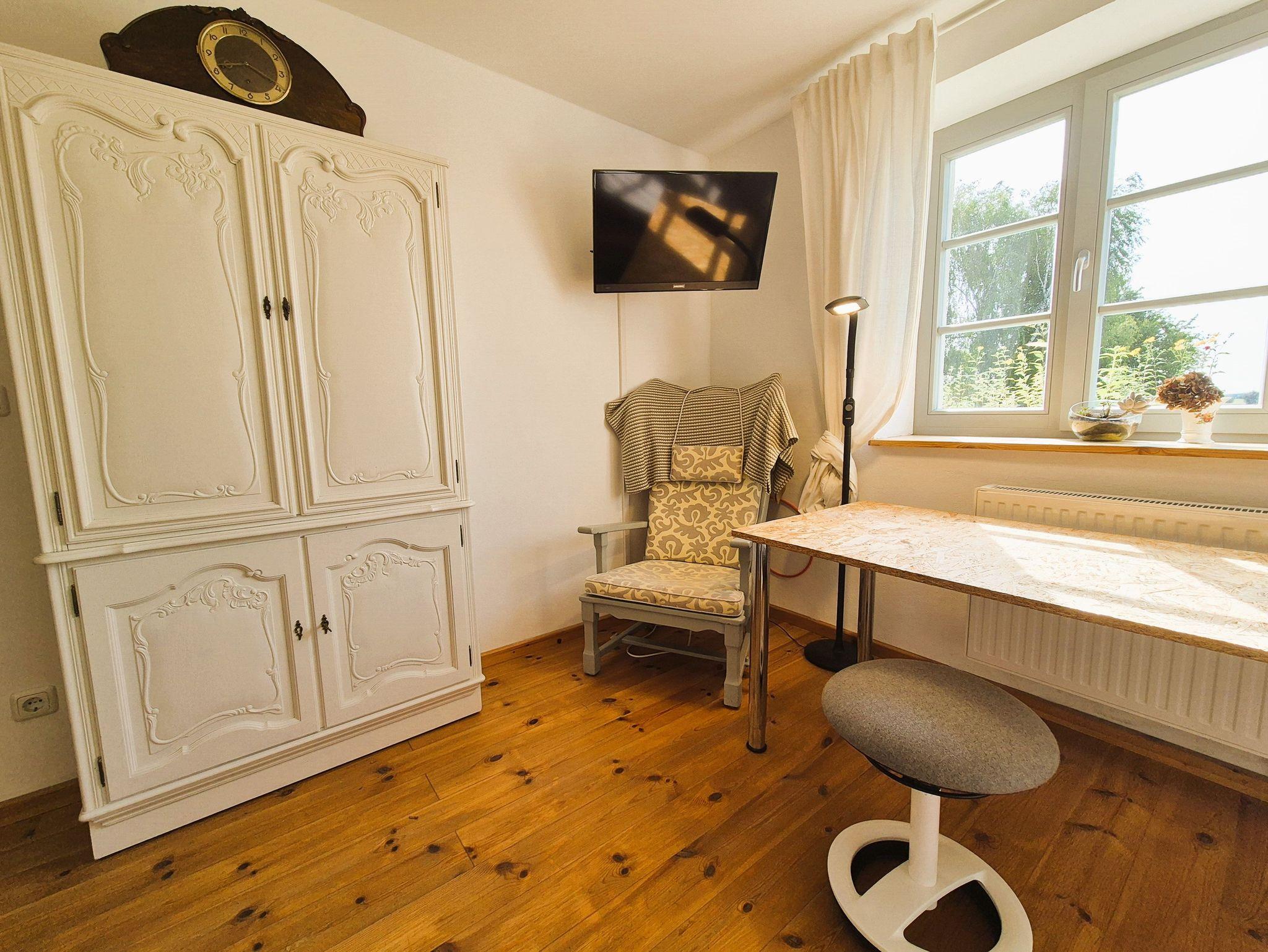 Im Eingangsbereich des Hauses empfängt Sie ein kleiner Flur mit Garderobe und Schuhablage. Vom Flur aus gelangen Sie in die offene Wohnküche mit Essplatz und Blick in das Kaminzimmer, wo sich ein gemütlicher Lesebereich mit zwei Sesseln befindet. Das helle und freundlich gestaltete Wohnzimmer schließt sich dem Kaminzimmer an mit Couchlandschaft, 2. TV, weitem Blick über das Land und einem Prinzessinnenbett für eine 5. Person. Im ersten Schlafzimmer befinden sich 2 Einzelbetten, Schrank und TV, dazu gehörig das Badezimmer mit ebenerdiger Dusche und WC. Im zweiten Schlafzimmer erwartet Sie ein 1,60 m breites Doppelbett, Nachttisch, Schrank und Kleiderablage und der Zugang zum Bad mit Wanne und WC. WLan ist vorhanden. Die gesamte Ausstattung ist neu und modern, aber auch eine Rettung alter aber stilvoller Möbelstücke. Das Gesamtbild hat definitiv Wohlfühlcharakter und ist ein Kraftort.