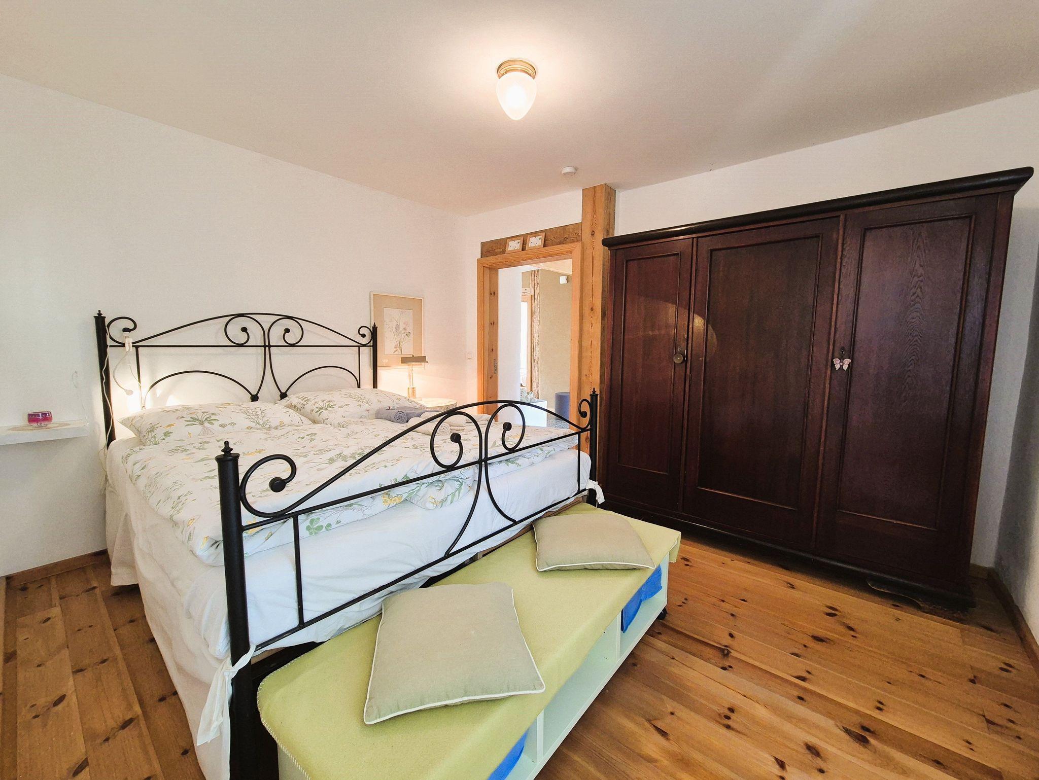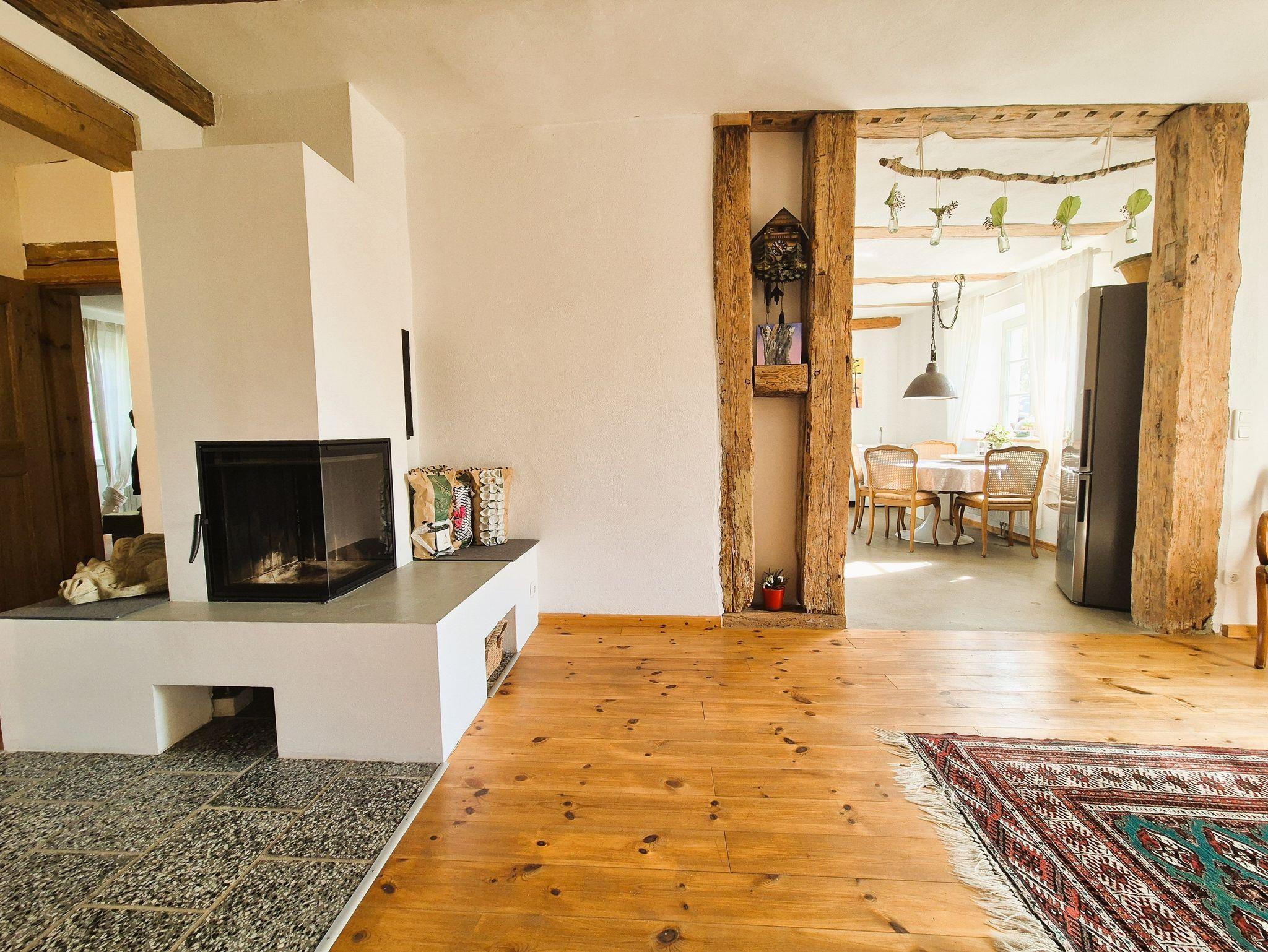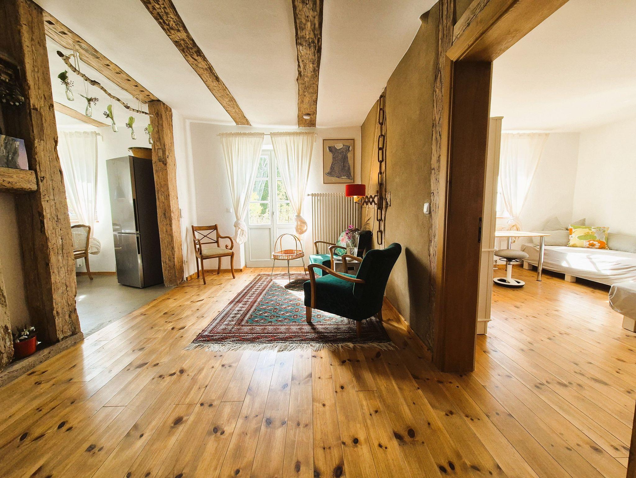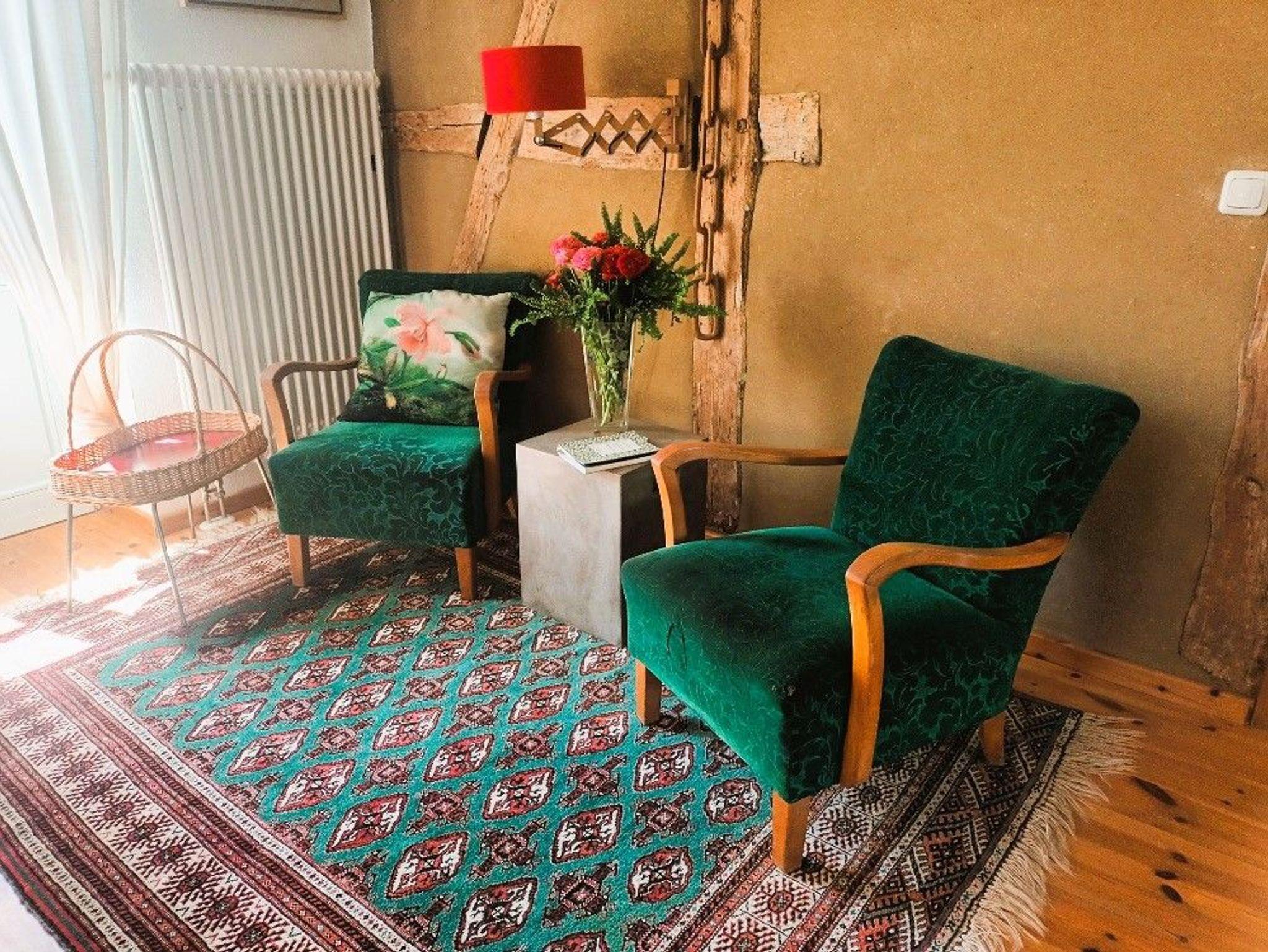 Im Eingangsbereich des Hauses empfängt Sie ein kleiner Flur mit Garderobe und Schuhablage. Vom Flur aus gelangen Sie in die offene Wohnküche mit Essplatz und Blick in das Kaminzimmer, wo sich ein gemütlicher Lesebereich mit zwei Sesseln befindet. Das helle und freundlich gestaltete Wohnzimmer schließt sich dem Kaminzimmer an mit Couchlandschaft, 2. TV, weitem Blick über das Land und einem Prinzessinnenbett für eine 5. Person. Im ersten Schlafzimmer befinden sich 2 Einzelbetten, Schrank und TV, dazu gehörig das Badezimmer mit ebenerdiger Dusche und WC. Im zweiten Schlafzimmer erwartet Sie ein 1,60 m breites Doppelbett, Nachttisch, Schrank und Kleiderablage und der Zugang zum Bad mit Wanne und WC. WLan ist vorhanden. Die gesamte Ausstattung ist neu und modern, aber auch eine Rettung alter aber stilvoller Möbelstücke. Das Gesamtbild hat definitiv Wohlfühlcharakter und ist ein Kraftort.