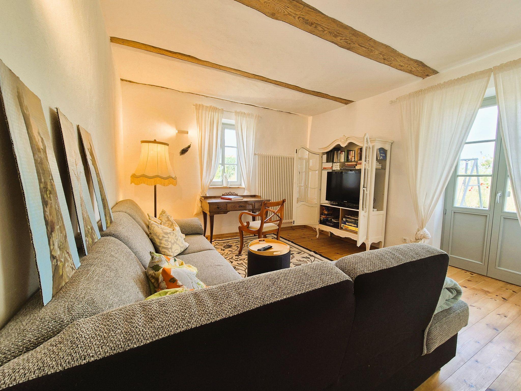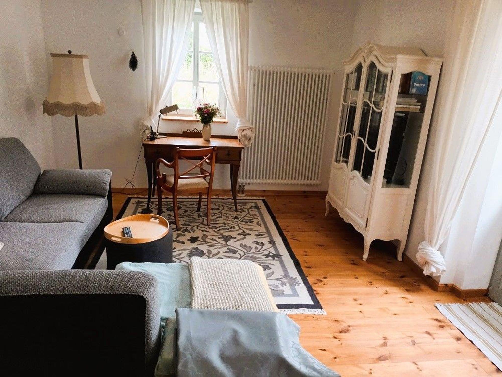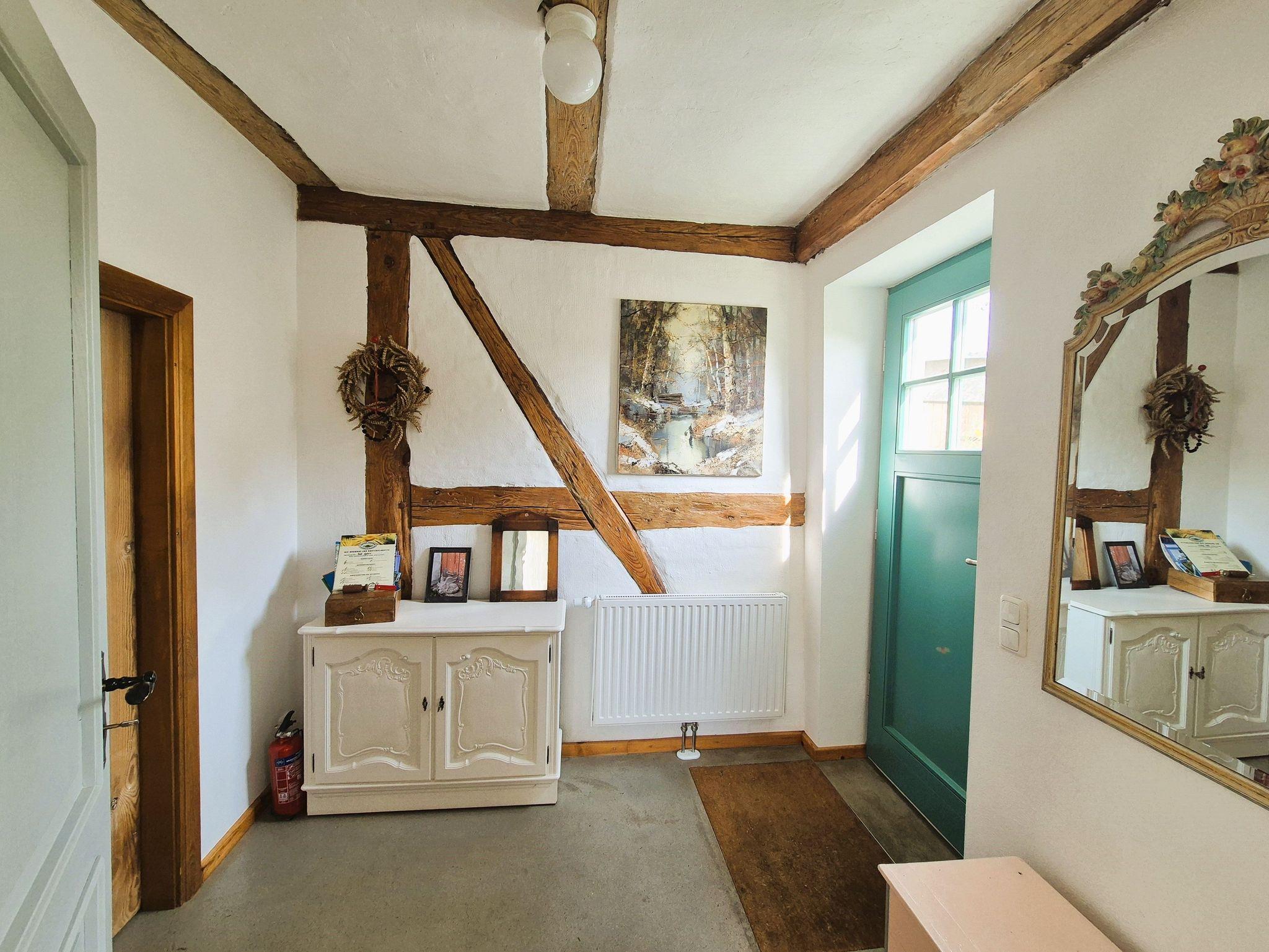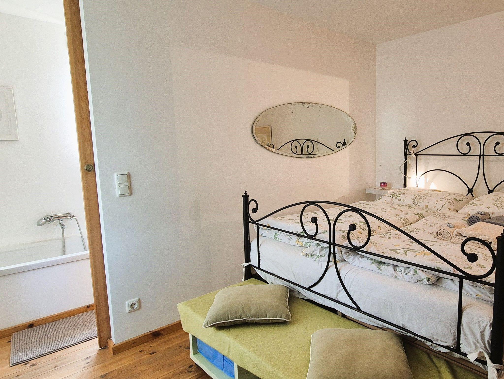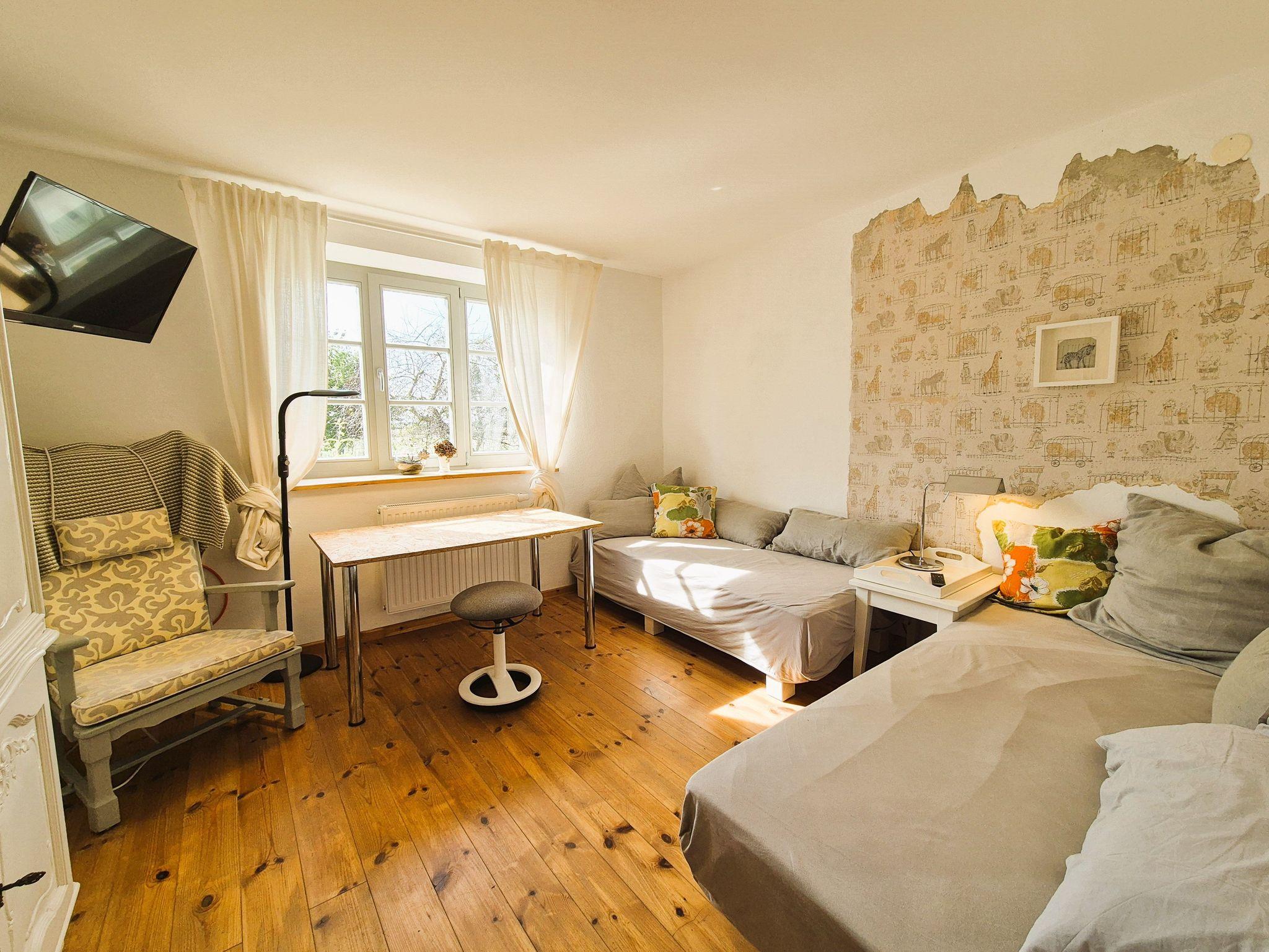 Im Eingangsbereich des Hauses empfängt Sie ein kleiner Flur mit Garderobe und Schuhablage. Vom Flur aus gelangen Sie in die offene Wohnküche mit Essplatz und Blick in das Kaminzimmer, wo sich ein gemütlicher Lesebereich mit zwei Sesseln befindet. Das helle und freundlich gestaltete Wohnzimmer schließt sich dem Kaminzimmer an mit Couchlandschaft, 2. TV, weitem Blick über das Land und einem Prinzessinnenbett für eine 5. Person. Im ersten Schlafzimmer befinden sich 2 Einzelbetten, Schrank und TV, dazu gehörig das Badezimmer mit ebenerdiger Dusche und WC. Im zweiten Schlafzimmer erwartet Sie ein 1,60 m breites Doppelbett, Nachttisch, Schrank und Kleiderablage und der Zugang zum Bad mit Wanne und WC. WLan ist vorhanden. Die gesamte Ausstattung ist neu und modern, aber auch eine Rettung alter aber stilvoller Möbelstücke. Das Gesamtbild hat definitiv Wohlfühlcharakter und ist ein Kraftort.