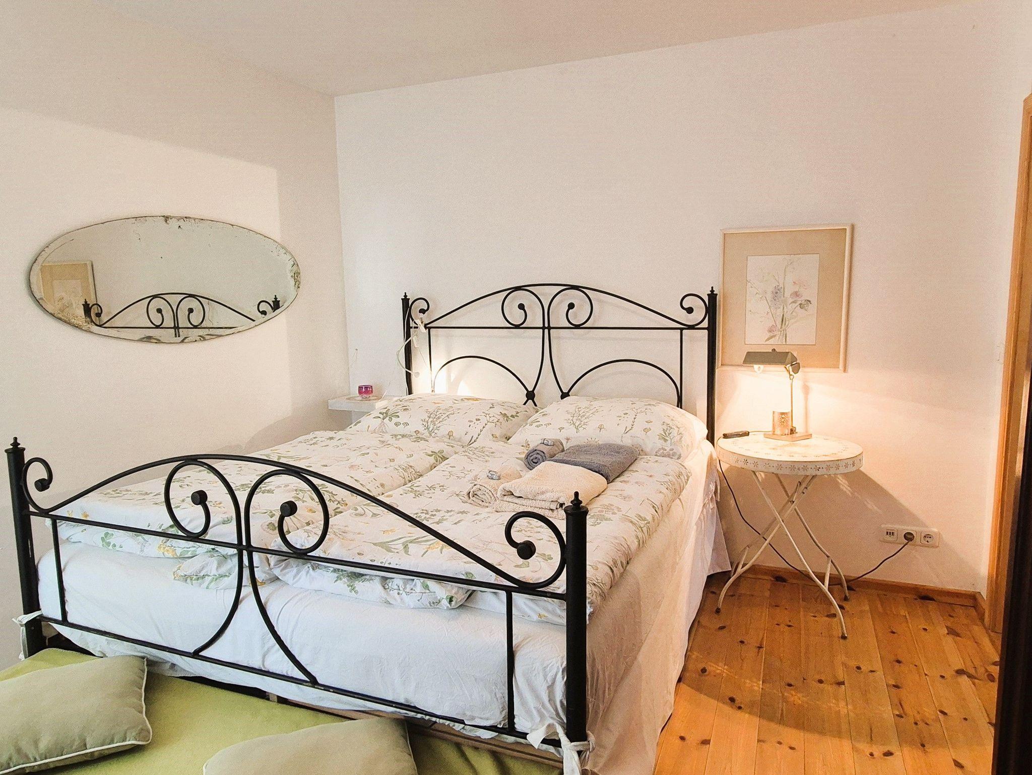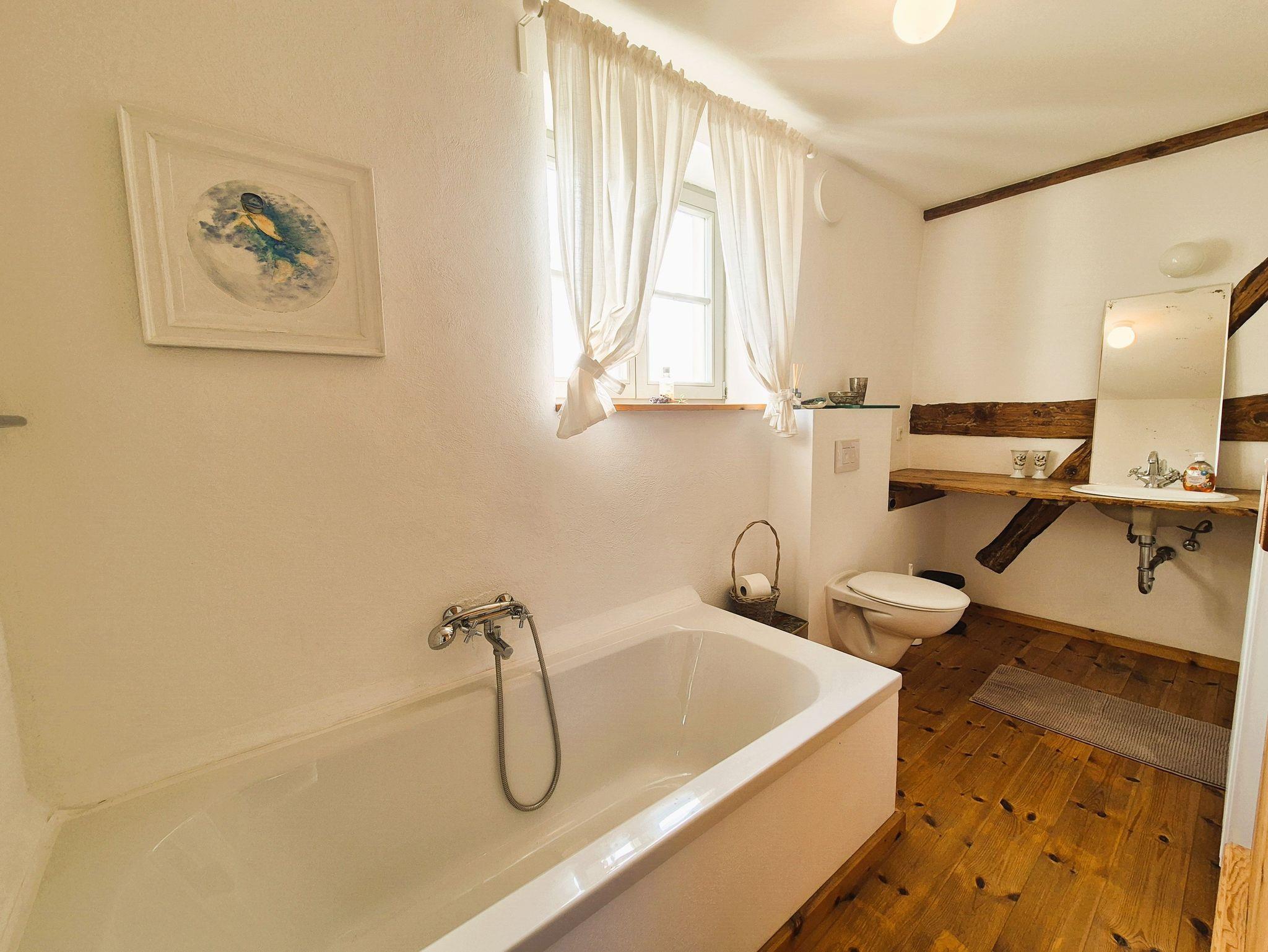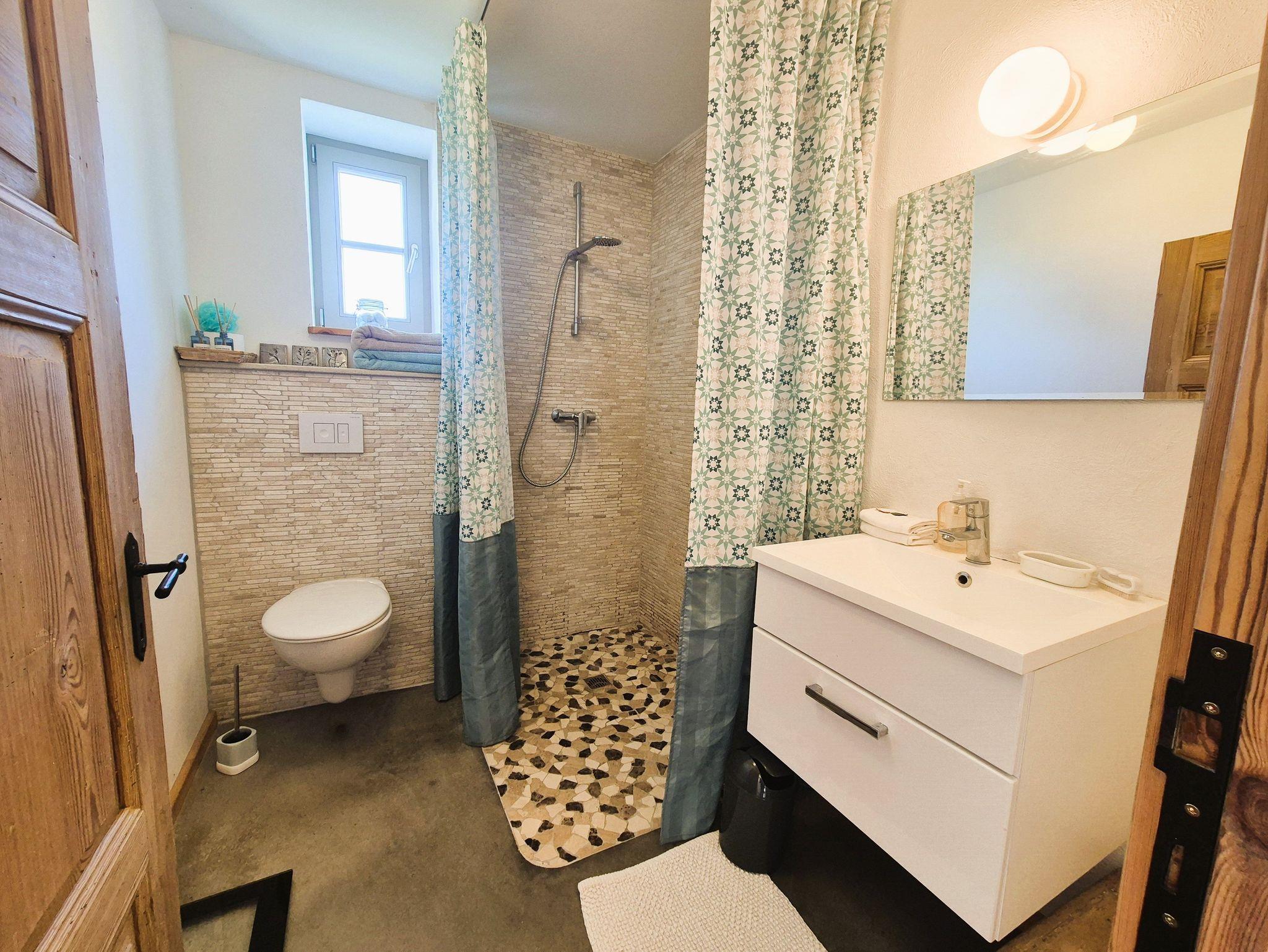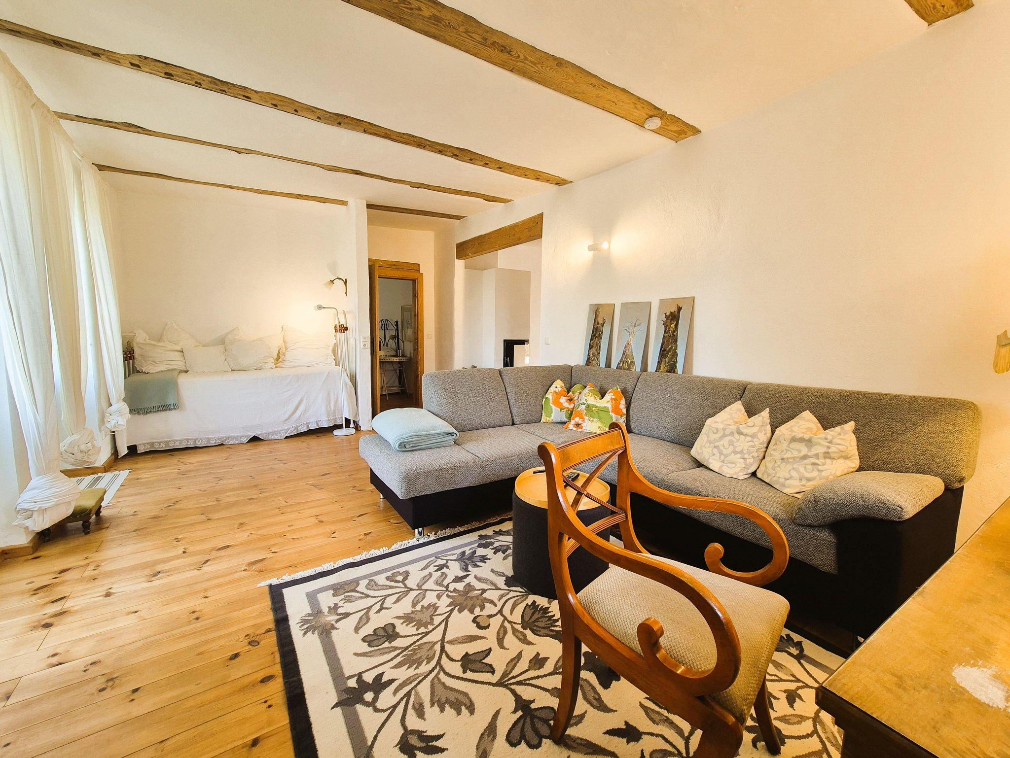 Im Eingangsbereich des Hauses empfängt Sie ein kleiner Flur mit Garderobe und Schuhablage. Vom Flur aus gelangen Sie in die offene Wohnküche mit Essplatz und Blick in das Kaminzimmer, wo sich ein gemütlicher Lesebereich mit zwei Sesseln befindet. Das helle und freundlich gestaltete Wohnzimmer schließt sich dem Kaminzimmer an mit Couchlandschaft, 2. TV, weitem Blick über das Land und einem Prinzessinnenbett für eine 5. Person. Im ersten Schlafzimmer befinden sich 2 Einzelbetten, Schrank und TV, dazu gehörig das Badezimmer mit ebenerdiger Dusche und WC. Im zweiten Schlafzimmer erwartet Sie ein 1,60 m breites Doppelbett, Nachttisch, Schrank und Kleiderablage und der Zugang zum Bad mit Wanne und WC. WLan ist vorhanden. Die gesamte Ausstattung ist neu und modern, aber auch eine Rettung alter aber stilvoller Möbelstücke. Das Gesamtbild hat definitiv Wohlfühlcharakter und ist ein Kraftort.