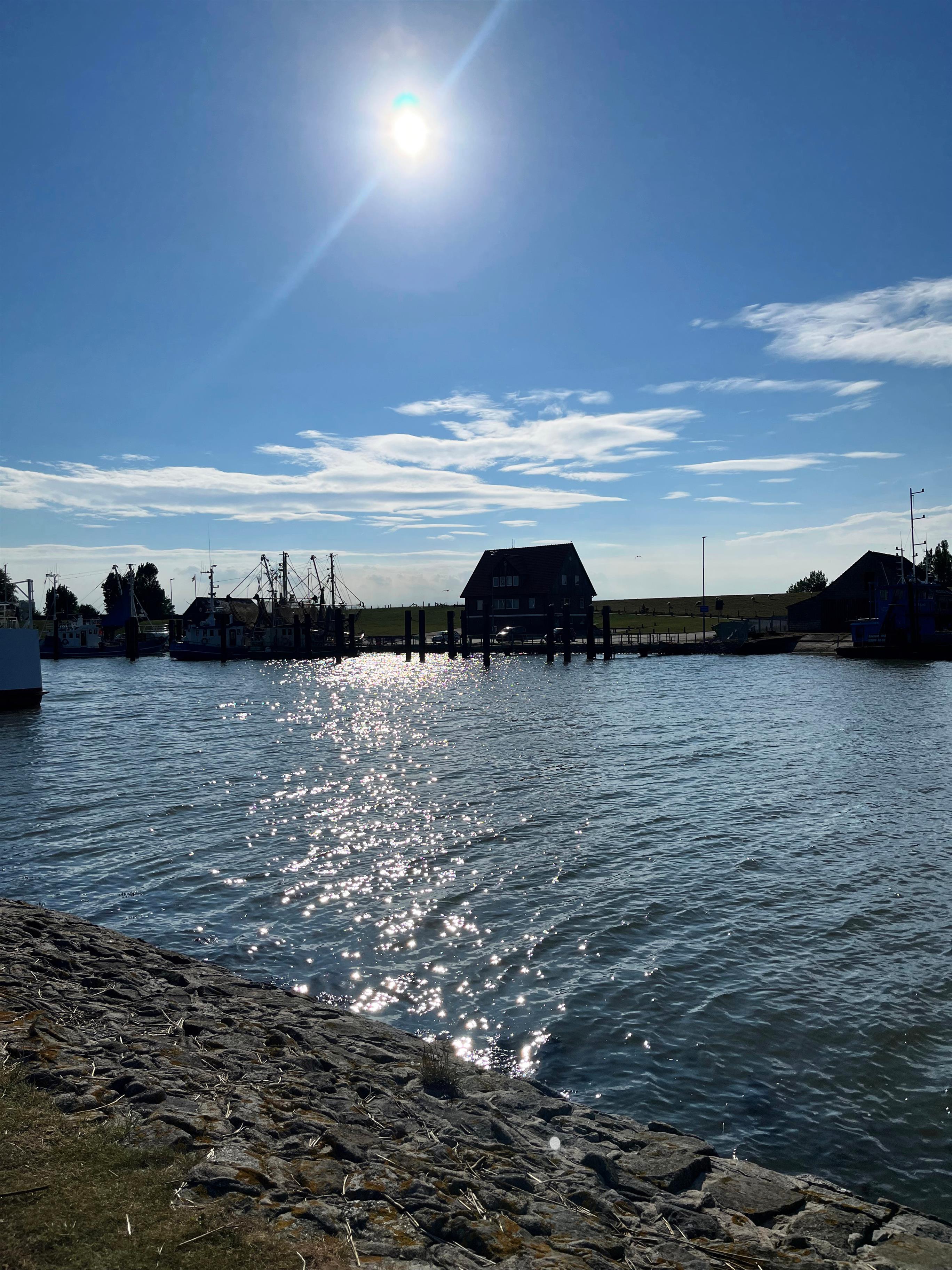 Sobald Ihr das Ferienhaus im Hafendorf in Fedderwardersiel verlasst, spürt und hört ihr bereits die Nordsee in unmittelbarer Nähe. Zu Fuß geht ihr wenige Schritte entlang dem Siel über den neu angelegten Rad- und Fußweg. Bereits ein Haus weiter hat sich das erste Restaurant angesiedelt. Ihr steht innerhalb von wenigen Augenblicken auf dem grünen Deich und könnt zu eurer Rechten bereits Burhave sehen. Dazwischen befindet sich der große und gepflegte Zelt- und Campingplatz und der Yachthafen, wo die Boote auf das nächste Hochwasser warten, um auslaufen zu können. Vor euch liegt der Krabbenkutterhafen, das Herzstück Fedderwardersiels. Am Anfang des Hafens befindet sich der berühmte Fischladen von Fedderwardersiel. Dahinter liegen die Fischerkutter, die morgens früh von Ihren Touren zurückkommen.