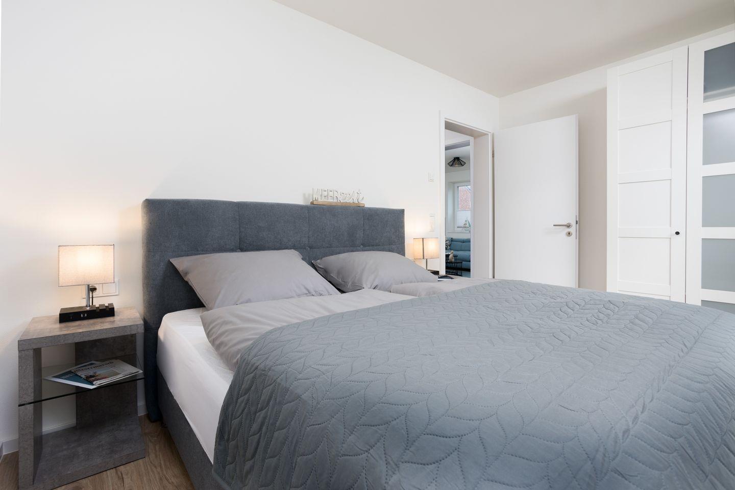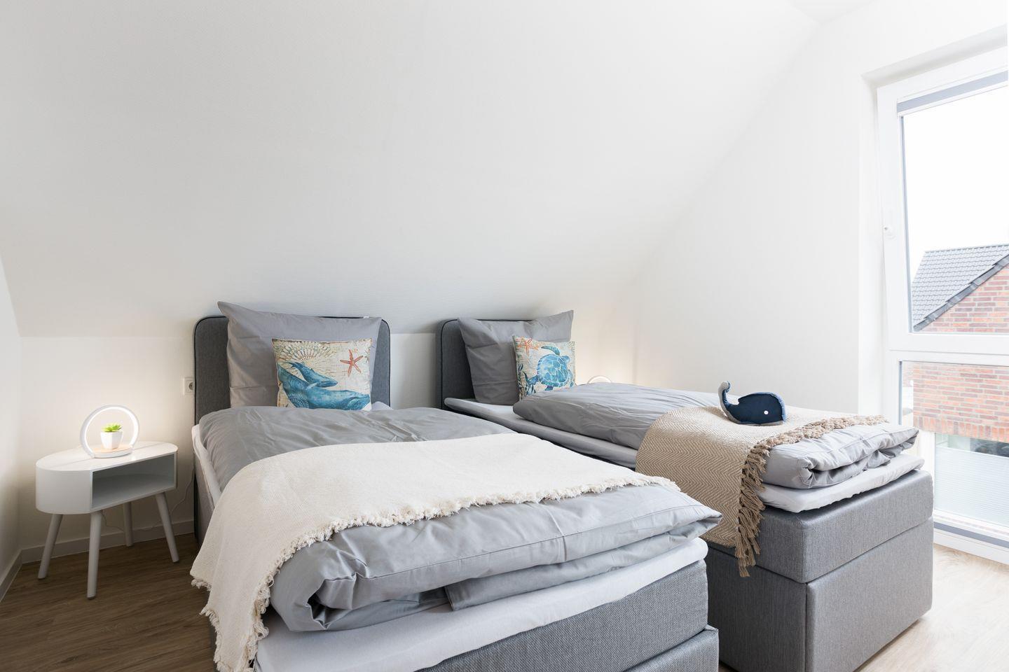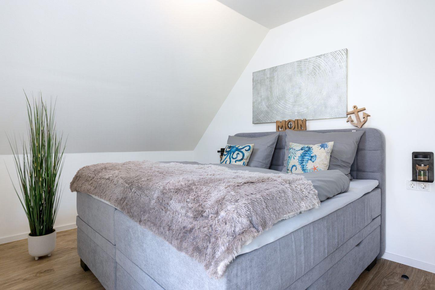 Drei Schlafzimmer mit hochwertigen Boxspringbetten garantieren dir erholsame Nächte. Im Erdgeschoss befindet sich ein Schlafzimmer mit Doppelbett und barrierearmem Zugang – ideal für Senioren oder Gäste mit eingeschränkter Mobilität. Im Obergeschoss erwartet dich ein weiteres Doppelzimmer sowie ein flexibles Zimmer mit zwei Einzelbetten, die auch zusammengestellt werden können.