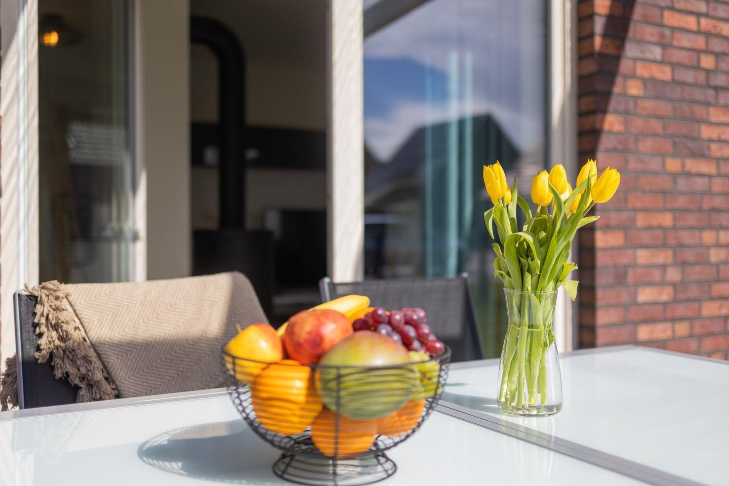 Der großzügige Wohnbereich mit bodentiefen Fenstern und direktem Zugang zur überdachten Terrasse lädt zu geselligen Stunden ein. Der Holzkamin sorgt an kühleren Tagen für wohlige Wärme, während du an warmen Abenden den Weber-Holzkohlegrill im Garten genießen kannst. Die offene Küche ist komplett ausgestattet – ideal für gemeinsames Kochen am großen Esstisch.