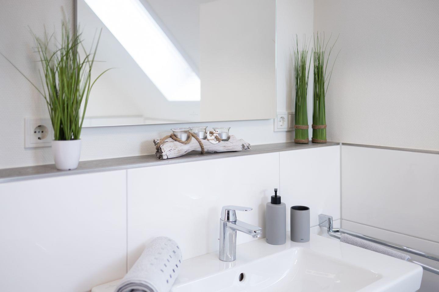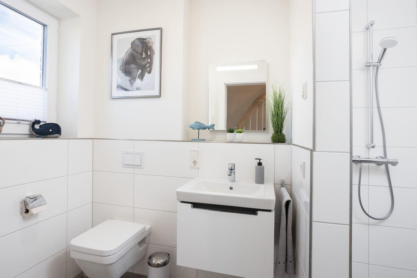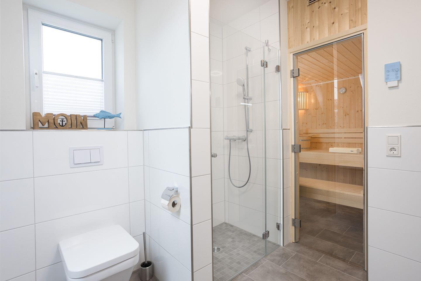 Im Obergeschoss findest du das moderne Wellnessbad mit Sauna, Dusche und Badewanne – perfekt für deine persönliche Auszeit. Ein zusätzliches Duschbad im Erdgeschoss sorgt für extra Komfort, besonders bei voller Belegung.