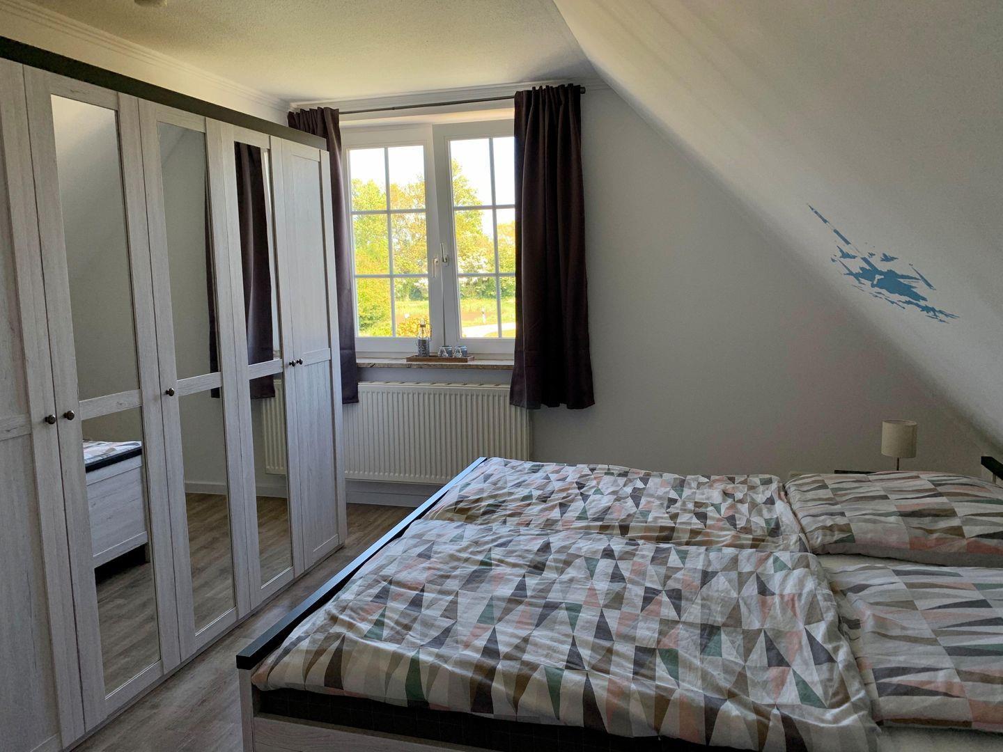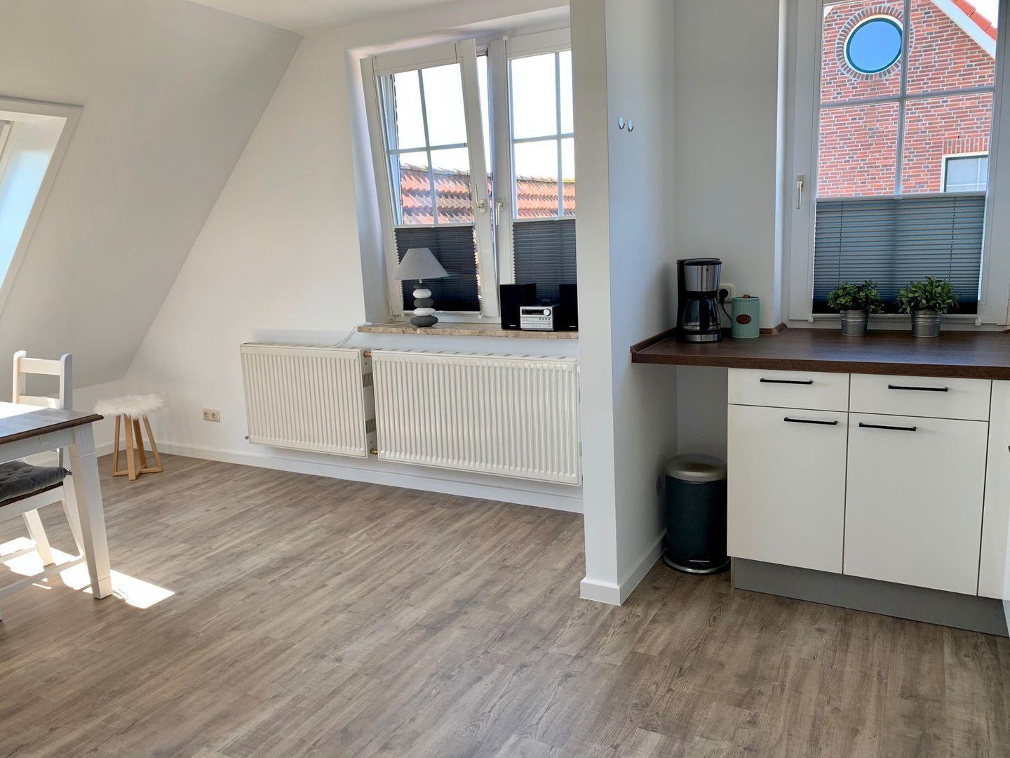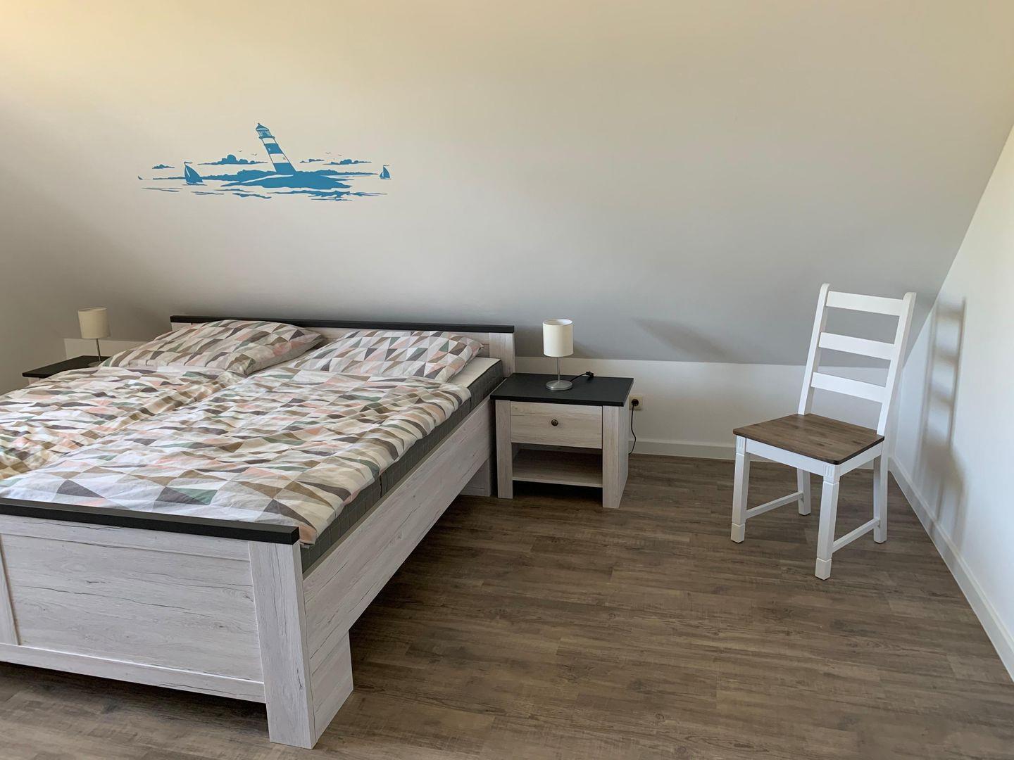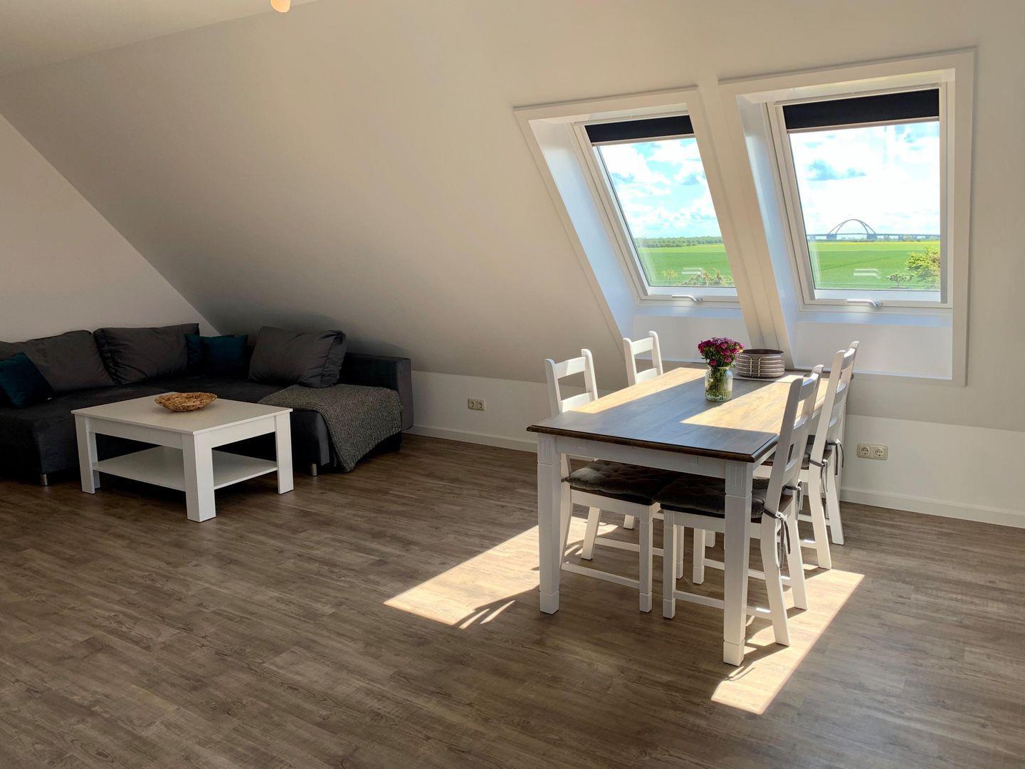 Die Ferienwohnung Goldblick wurde 2020 komplett saniert und mit gemütlichem Wohn-/Essbereich, großzügigem Bad auf ca. 80 qm modern und komfortabel ausgestattet. Die Wohnung ist liebevoll gestaltet und eingerichtet, an kalten Abenden machen Sie es sich am Kaminoffen gemütlich. Sie finden eine elegante Atmosphäre und Ausstattung vor- es fehlt an nichts. In den beiden Schlafräumen finden bis zu 4 Erwachsene Platz. Ein kostenfreies WLAN, eine hochwertig komplett ausgestattete Küche mit Ceran Feld, Geschirrspüler und integrierter Mikrowelle und vieles mehr sorgen für einen angenehmen Urlaub. Genießen Sie schon beim Frühstück den einzigartigen Blick auf die Sundbrücke.