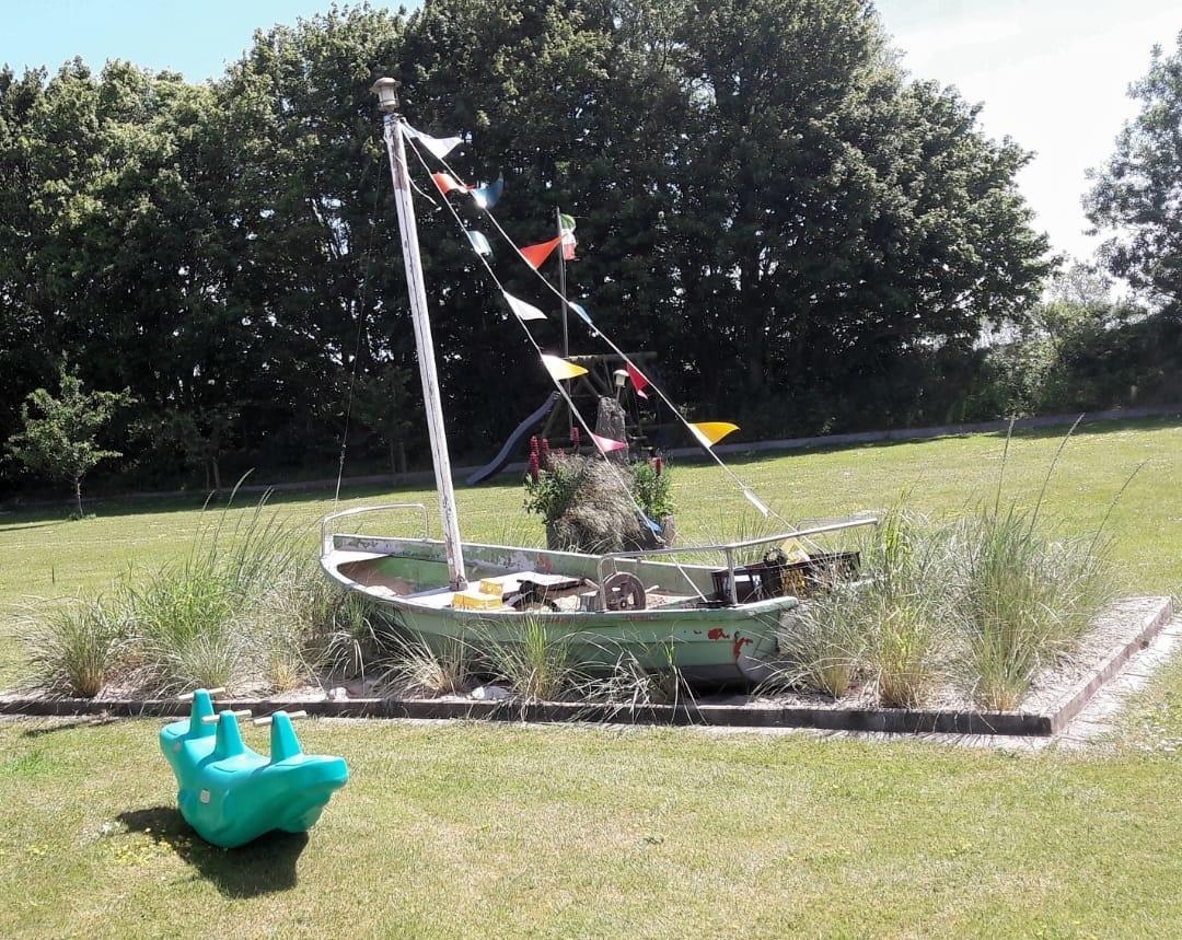 Für die Kinder gibt es, eine Doppelschaukel, Rutsche, ein Holzboot sowie diverse Spielgeräte.