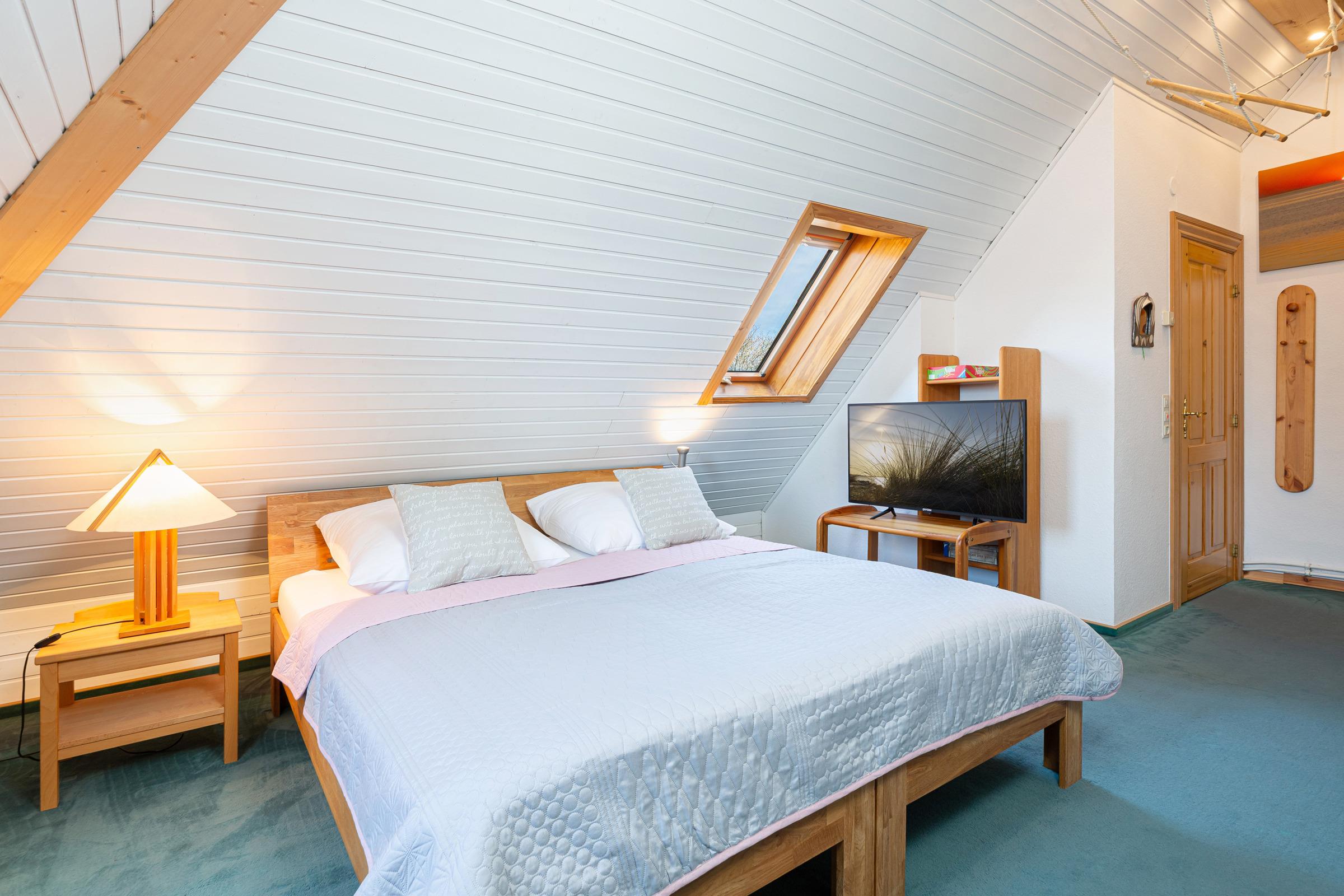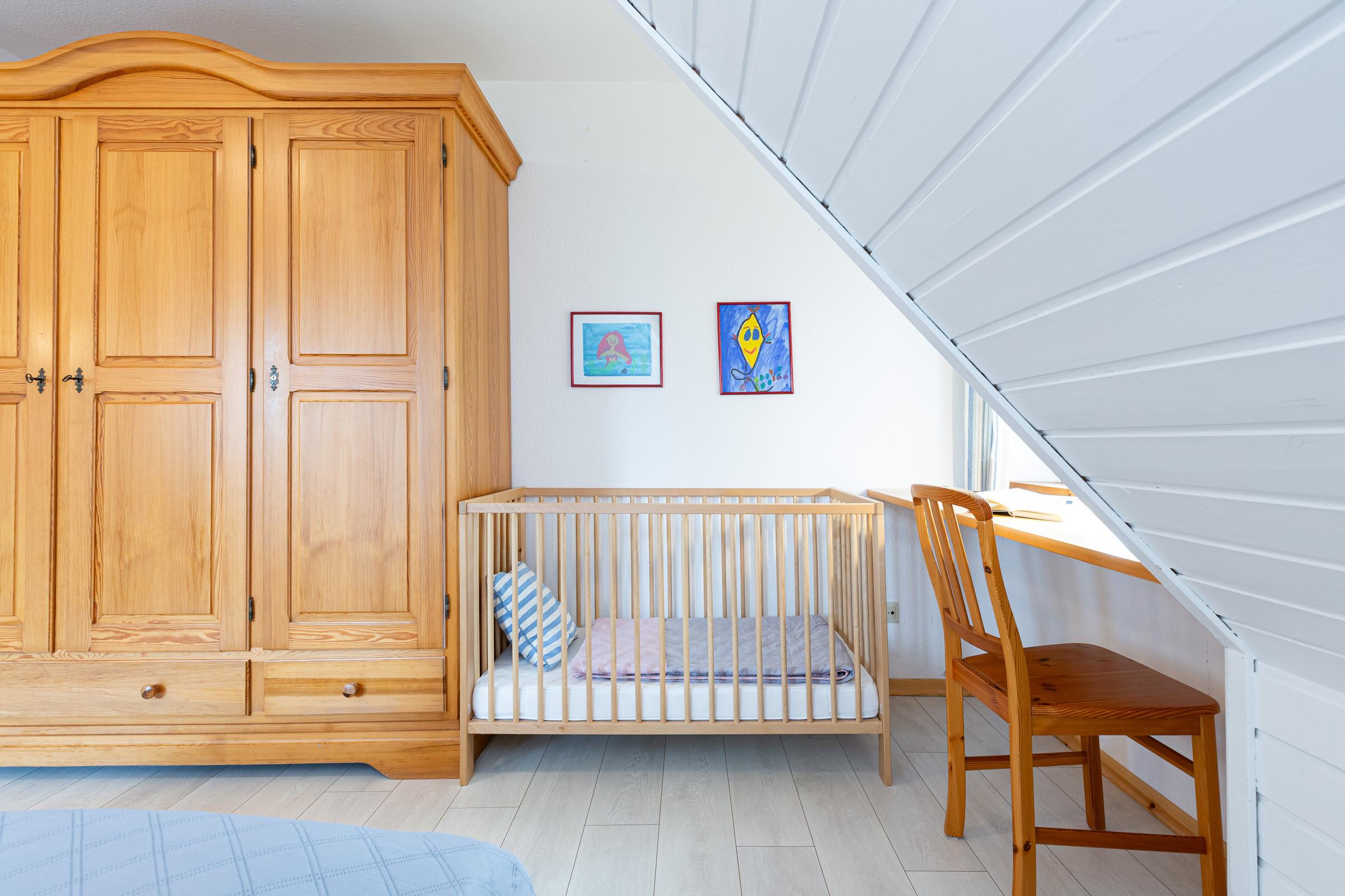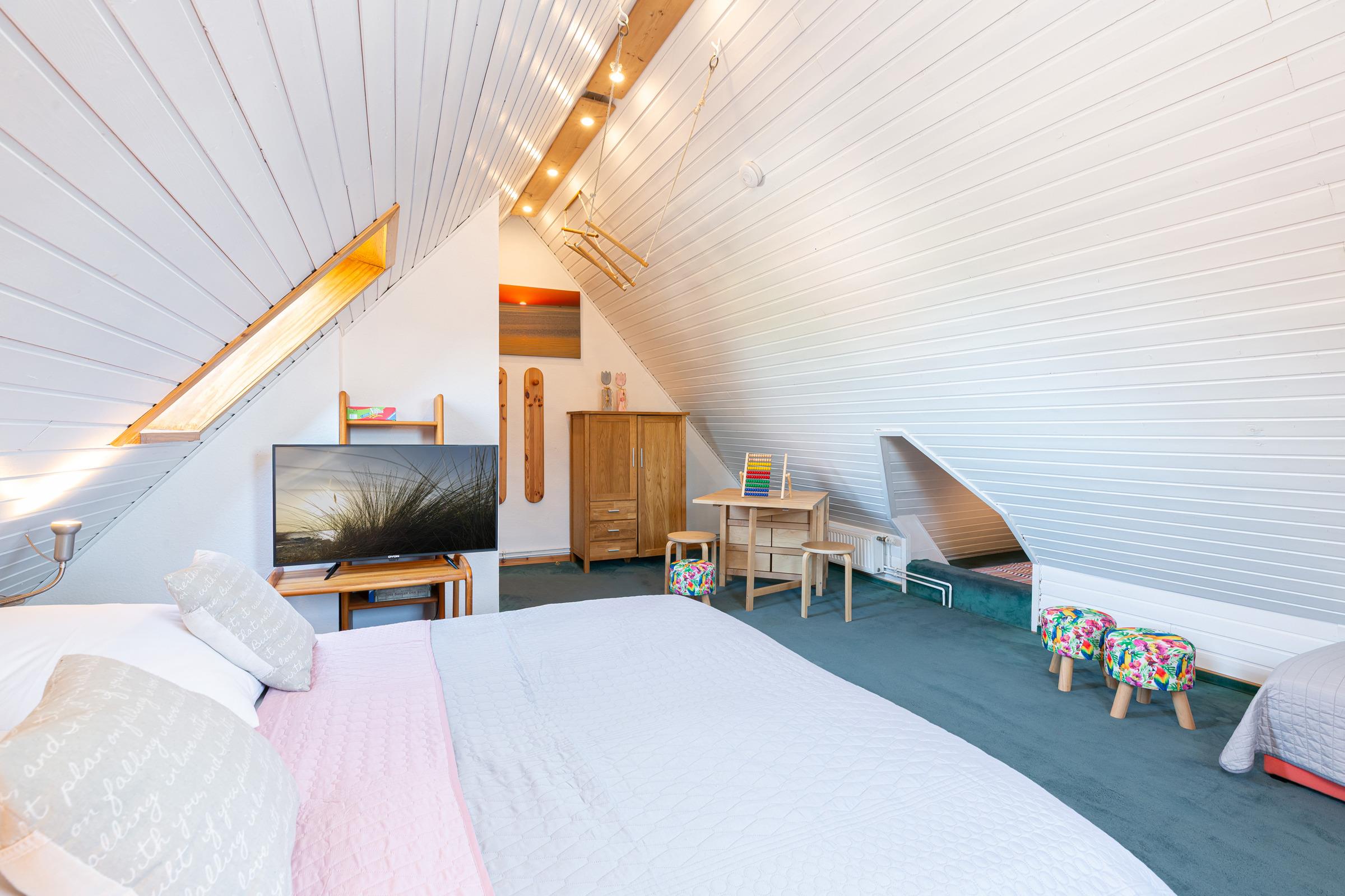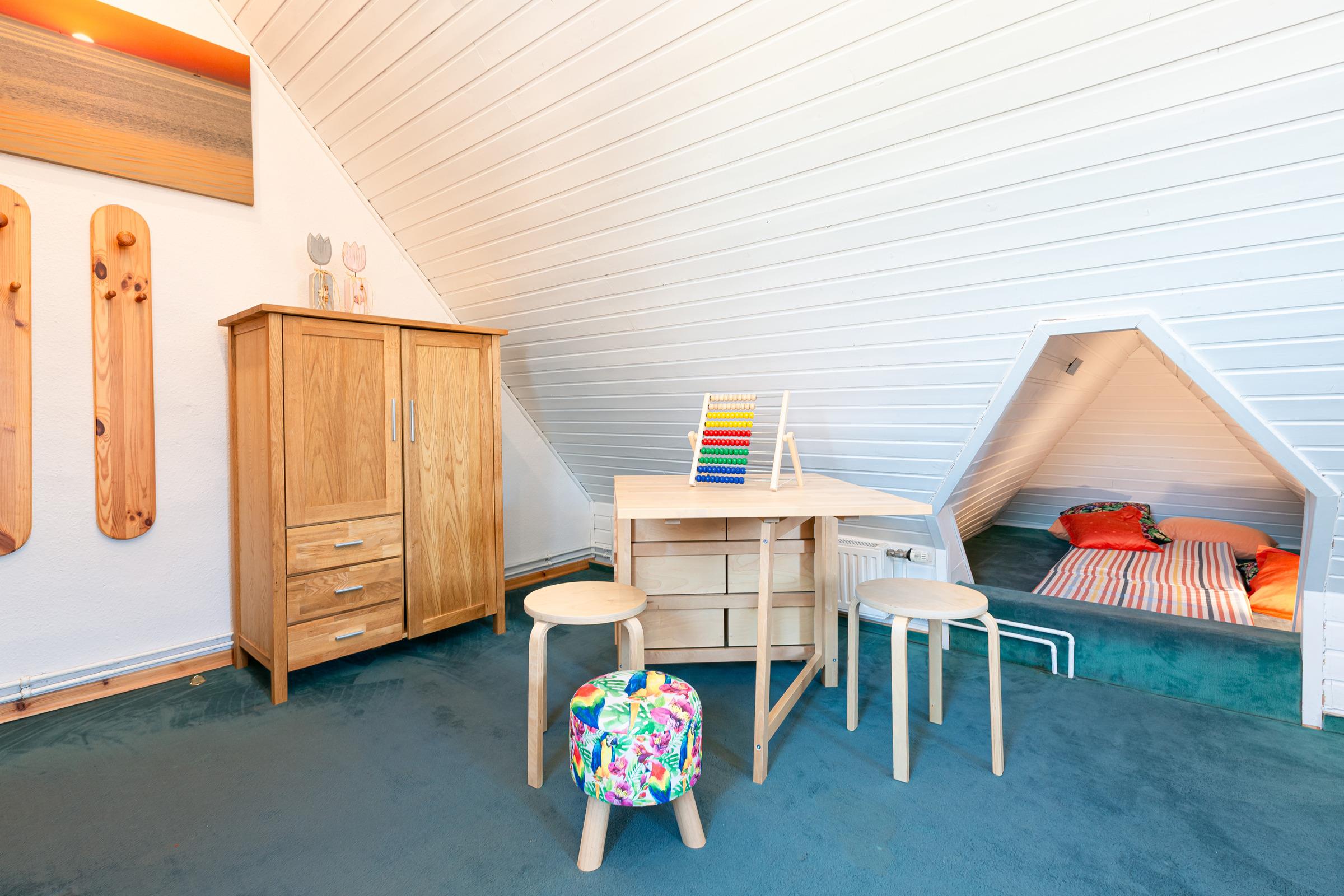 Im 1. Stock befinden sich drei Schlafräume: 1 großer Schlafraum mit einem Doppelbett (190x200 cm), Baby-/Kleinkindbett, Schrank und Kommode und 2 Schlafräume mit jeweils 2 Einzelbetten (je 90x200 cm) und genügend Schrank- und Stauraum. Auf dieser Ebene gibt es zwei Bäder: Ein großzügiges Badezimmer mit Dusche, Badewanne und 2 Waschtischen sowie ein weiteres Bad mit Dusche. Im Dachgeschoss finden Sie ein großzügiges Spielparadies, das kleine und große Kinder herzlich willkommen heißt. Ein Doppelbett (190x200 cm), eine Spiel- und Schlafkoje stehen hier zur Verfügung sowie ein Fernseher, Blue-Ray-Player, Bücher und Spielmaterialien.
