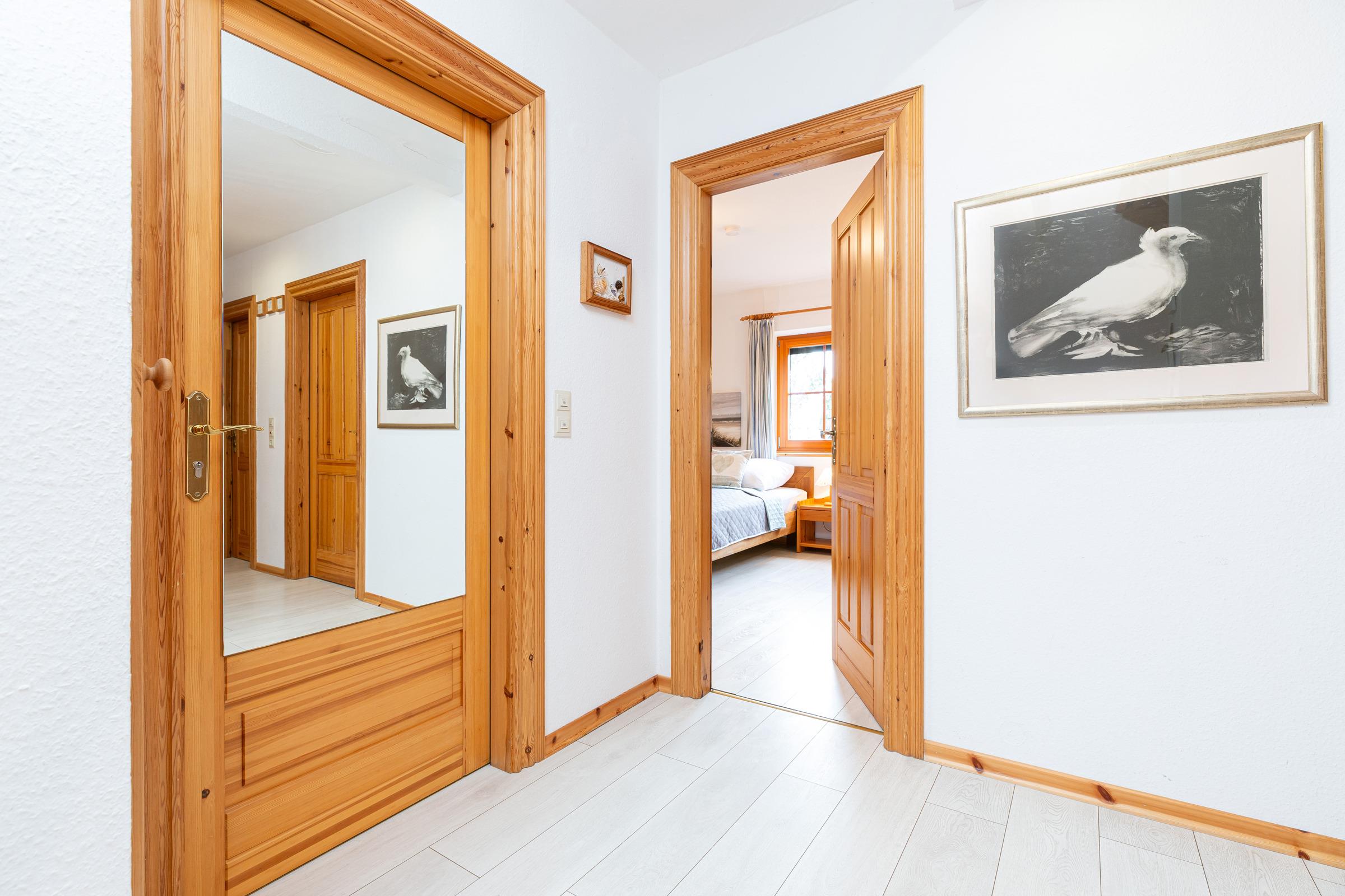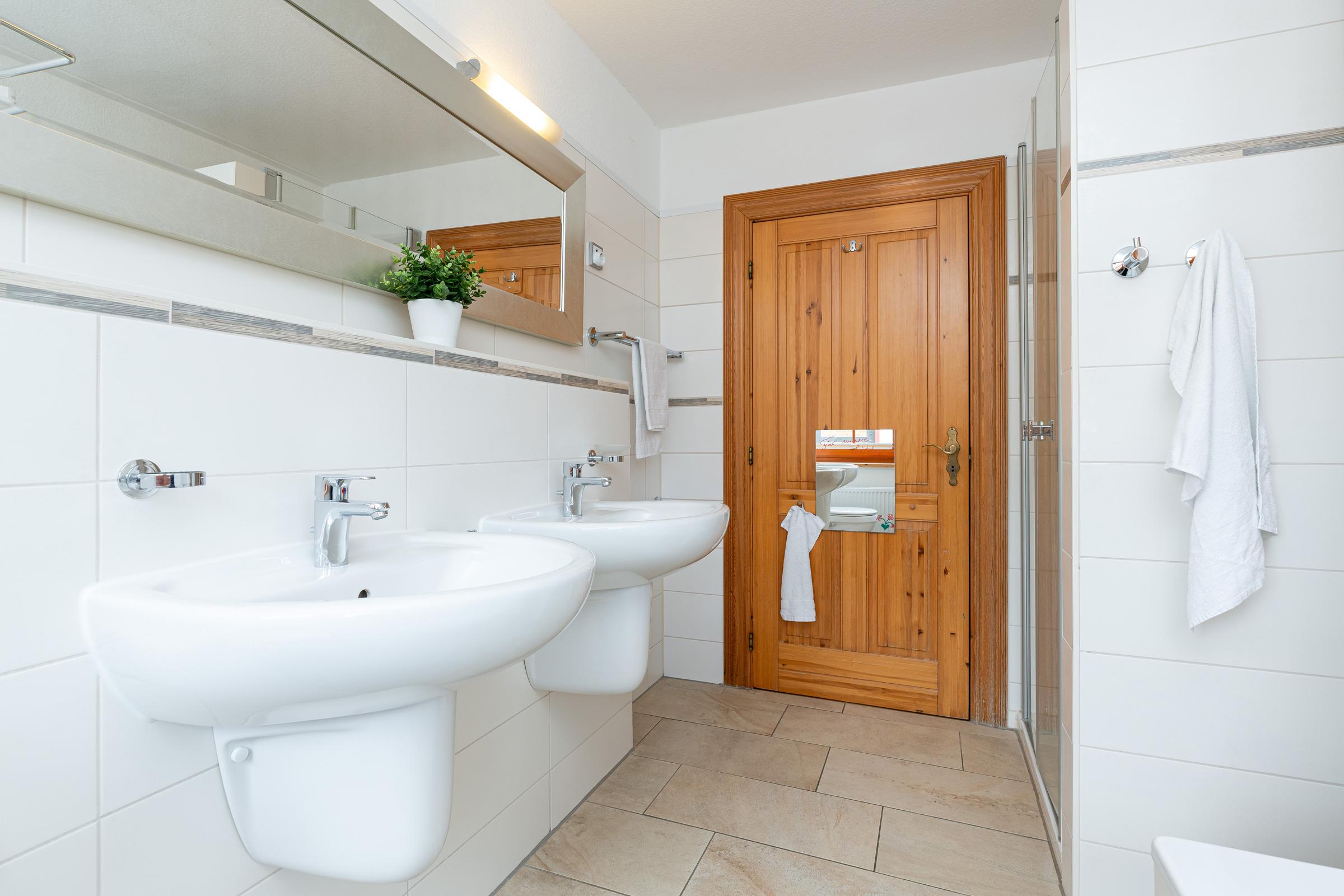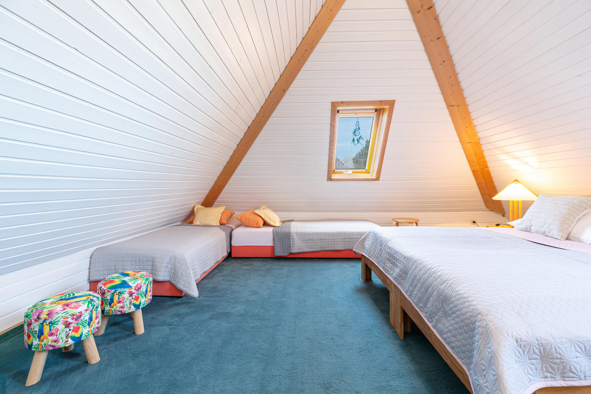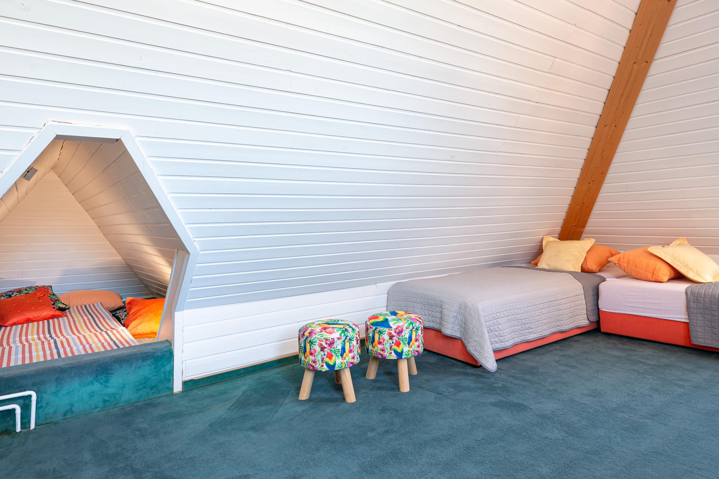 Im 1. Stock befinden sich drei Schlafräume: 1 großer Schlafraum mit einem Doppelbett (190x200 cm), Baby-/Kleinkindbett, Schrank und Kommode und 2 Schlafräume mit jeweils 2 Einzelbetten (je 90x200 cm) und genügend Schrank- und Stauraum. Auf dieser Ebene gibt es zwei Bäder: Ein großzügiges Badezimmer mit Dusche, Badewanne und 2 Waschtischen sowie ein weiteres Bad mit Dusche. Im Dachgeschoss finden Sie ein großzügiges Spielparadies, das kleine und große Kinder herzlich willkommen heißt. Ein Doppelbett (190x200 cm), eine Spiel- und Schlafkoje stehen hier zur Verfügung sowie ein Fernseher, Blue-Ray-Player, Bücher und Spielmaterialien.