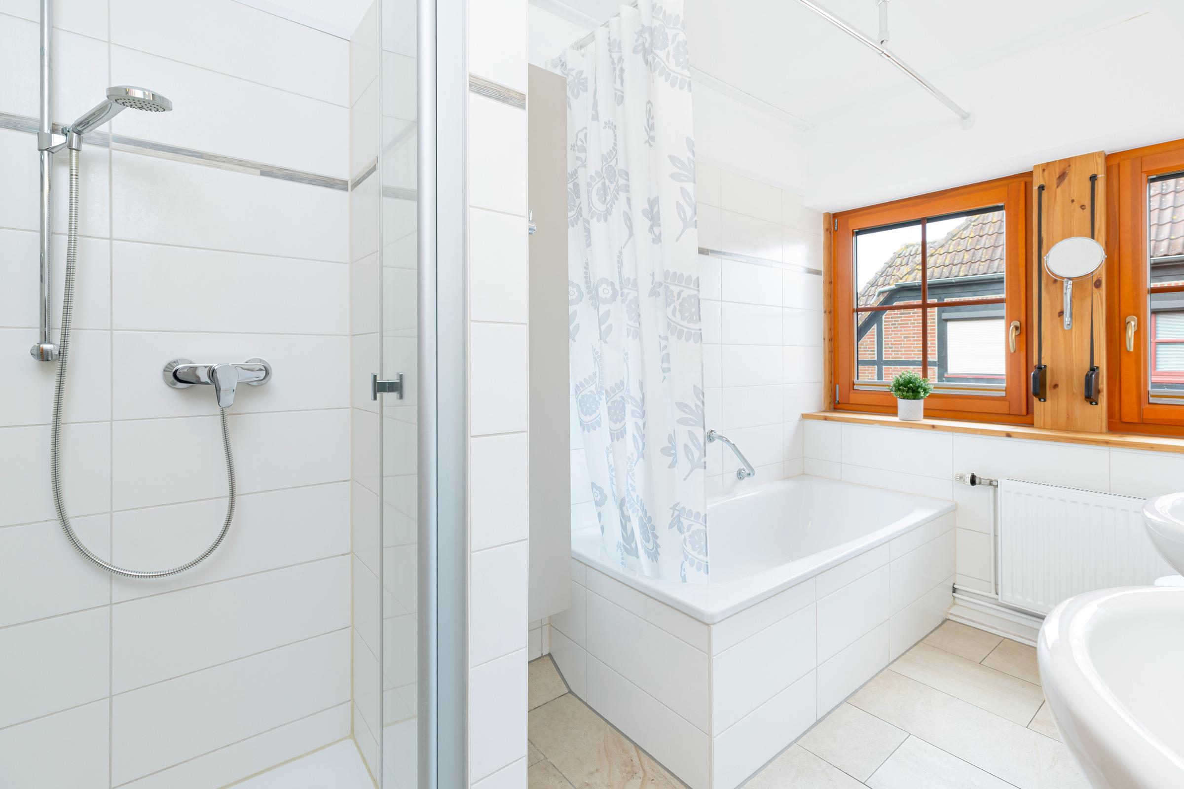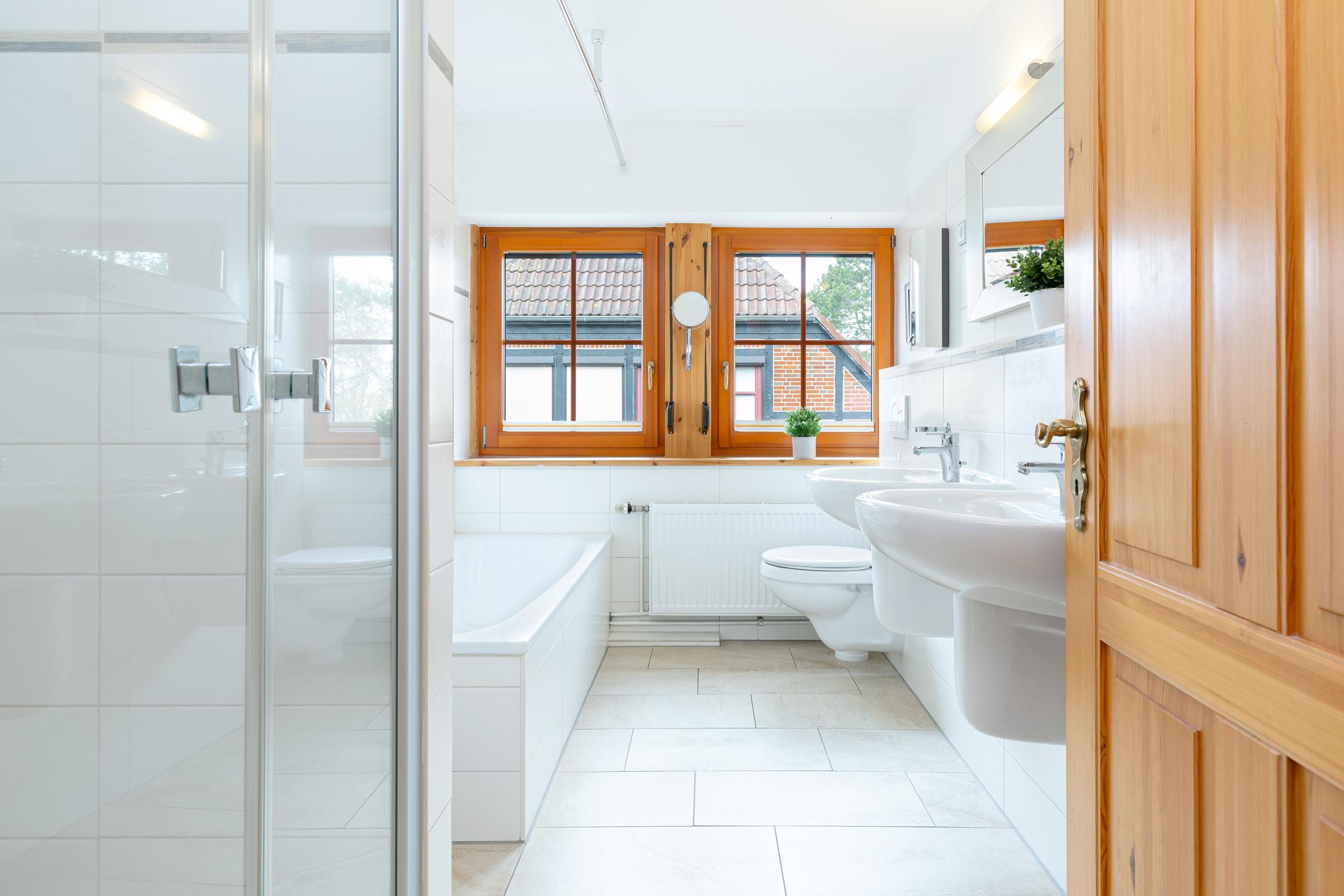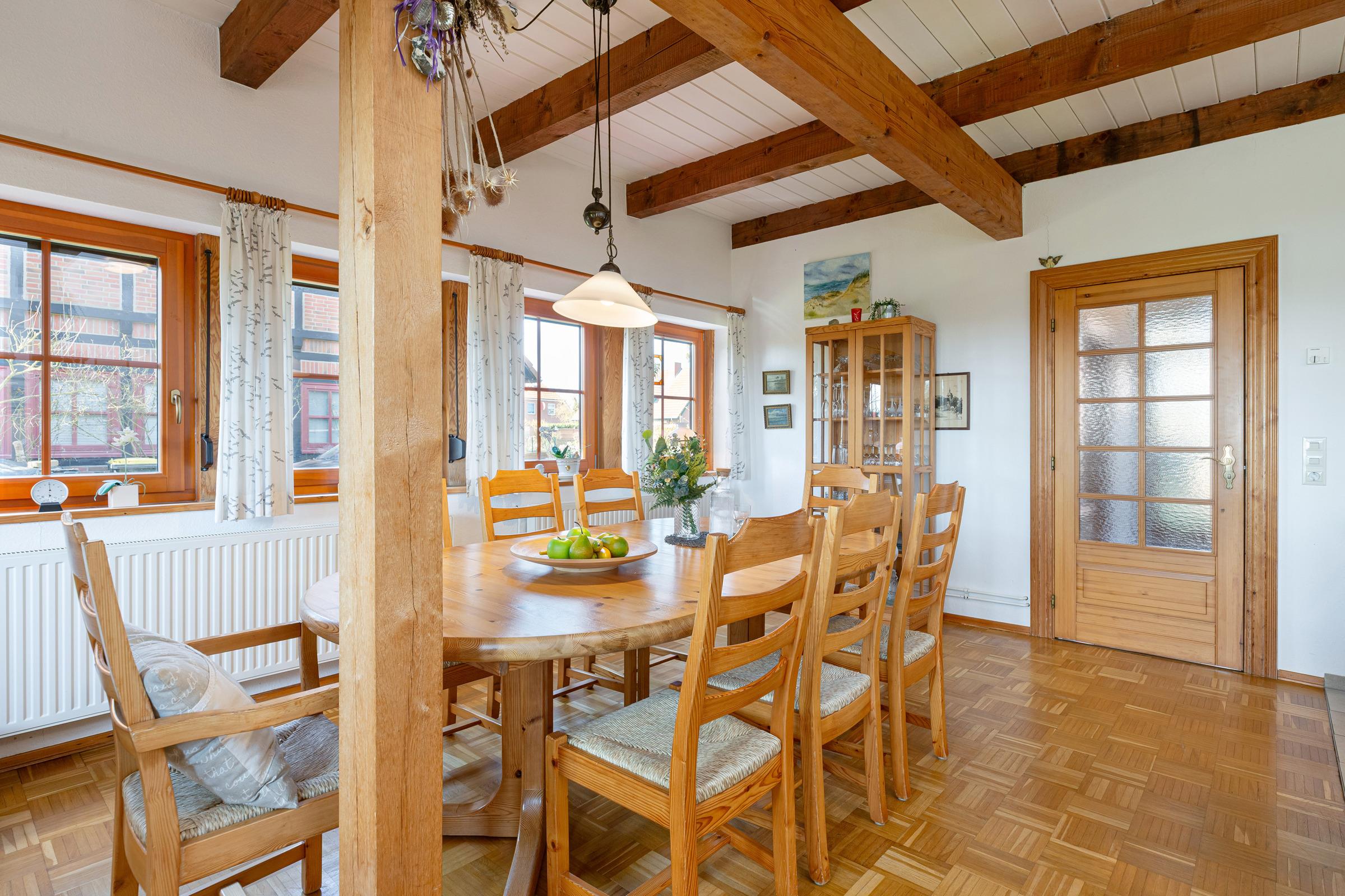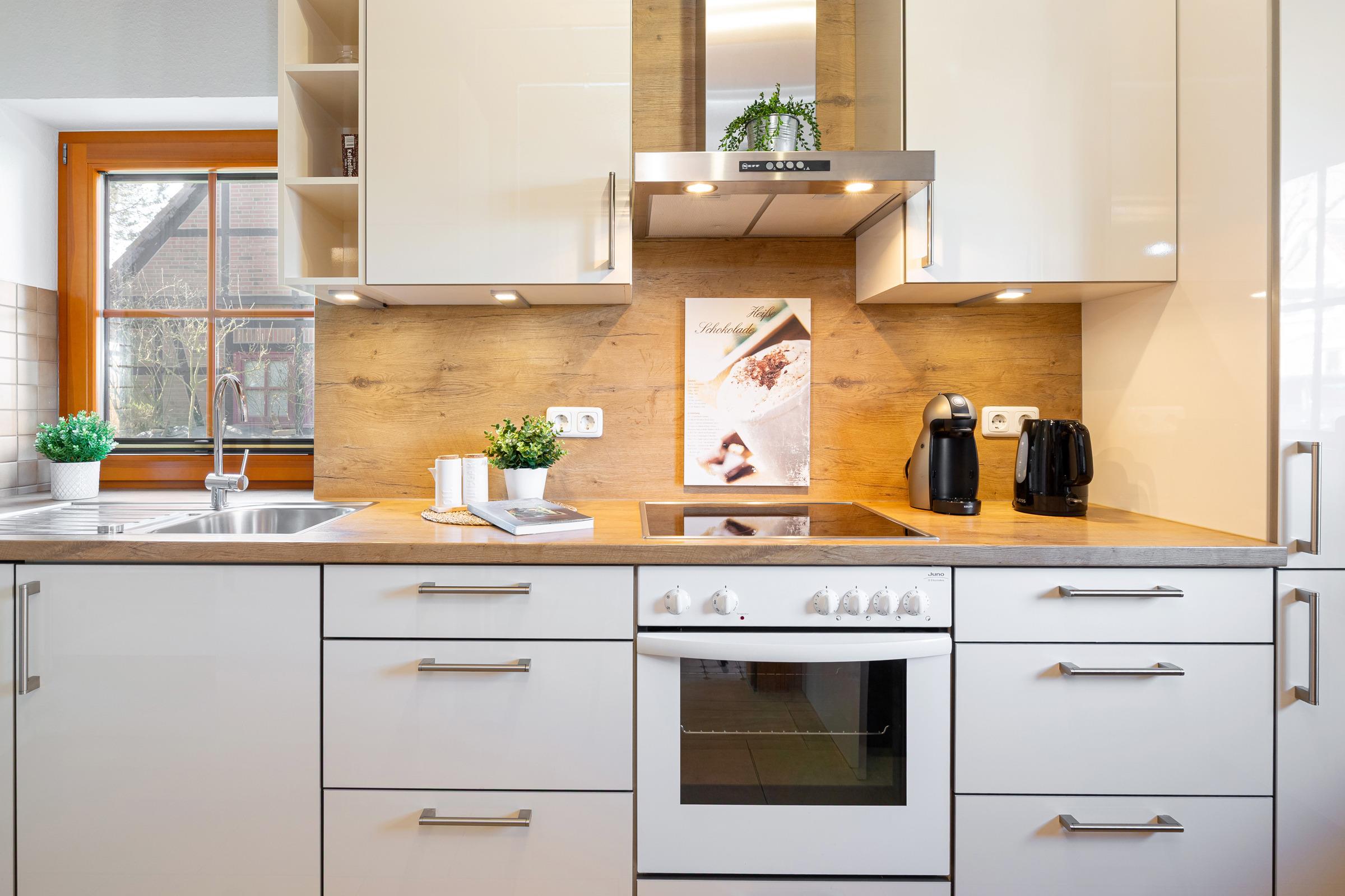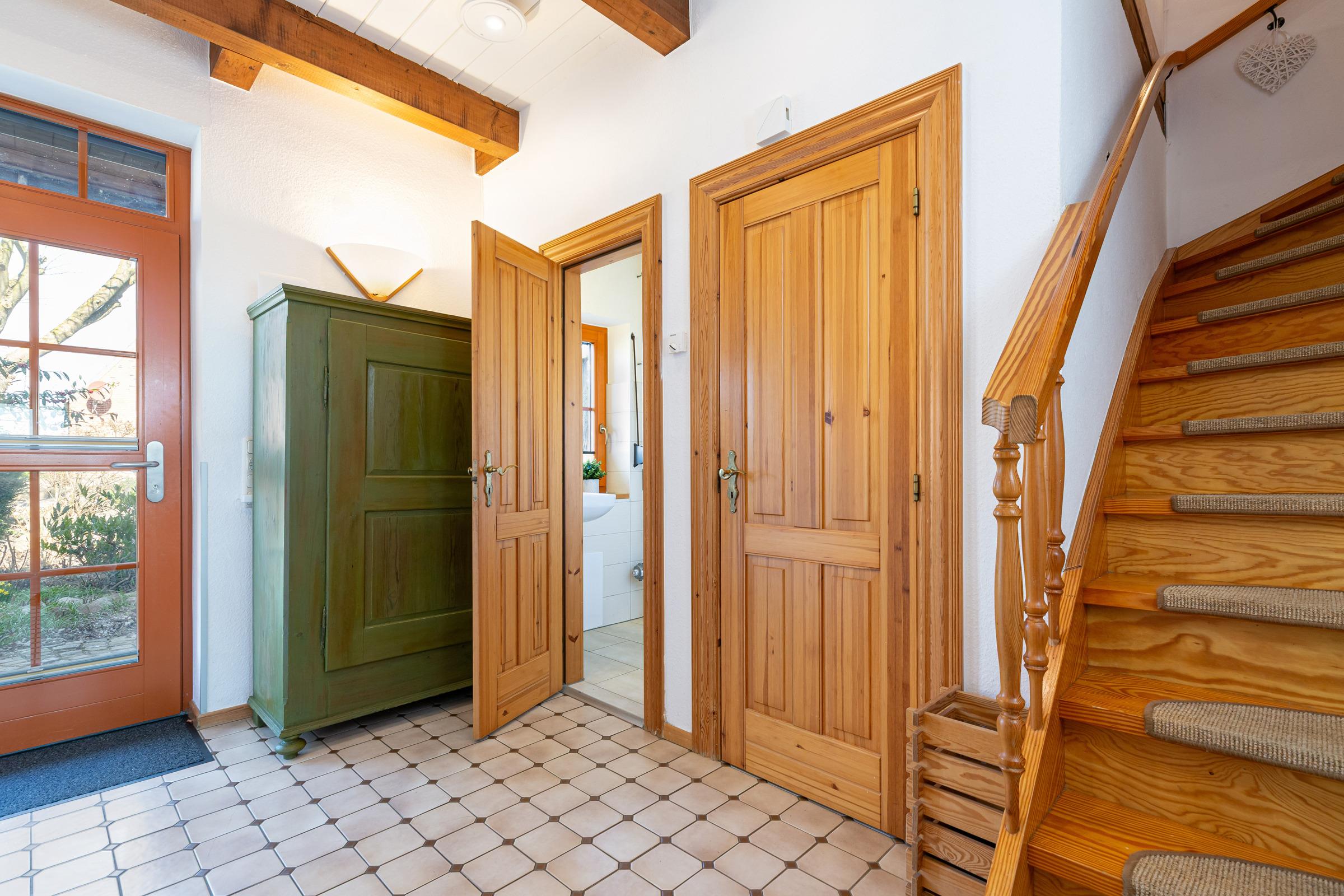 Im Erdgeschoss befindet sich ein großzügiger Wohnbereich mit Sitzecke und Essbereich. Der Blick geht über die Terrasse mit Gartenmöbeln in den großzügigen Garten, über Felder und Wiesen mit freier, unverbauter Sicht Richtung Fehmarnsundbrücke. Der rustikale Kaminofen ist im Wohnbereich ein schönes Highlight: Er spendet an kühleren Tagen wohlige Wärme. Ein großer Fernseher mit Sat-Receiver, Blue-Ray-Player, Radio- und CD-Player sorgt für die richtige Atmosphäre und das richtige Programm. In der sehr gut ausgestatteten Küche finden Sie z. B. Spülmaschine, Herd mit Cerankochfeld, Backofen, Kühlschrank mit Eisfach, Mikrowelle und Kaffeemaschine. Ein Gäste-WC mit Waschmaschine und Trockner, eine Abstellkammer für Ihre Utensilien und ein großer Flur mit Garderobenschrank sind zusätzlich vorhanden.